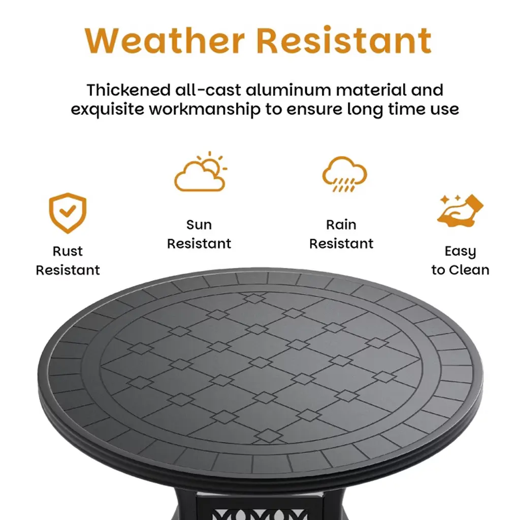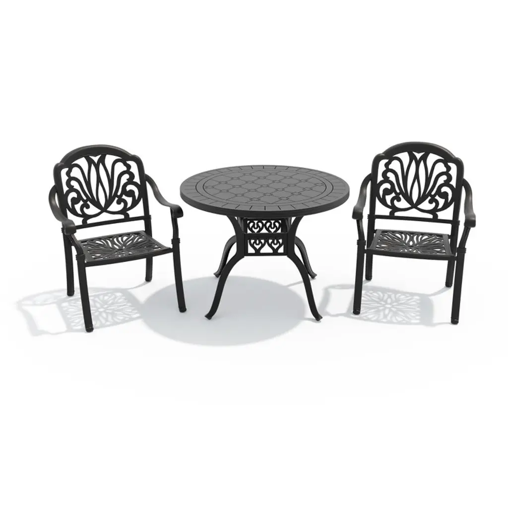 3-piece Cast Aluminum Outdoor Dining Set: Round Table, Stackable Chairs & Brown Cushions - All-weather Patio Furniture For Your Backyard