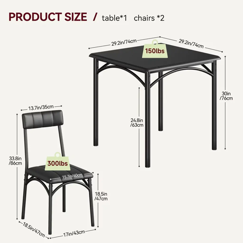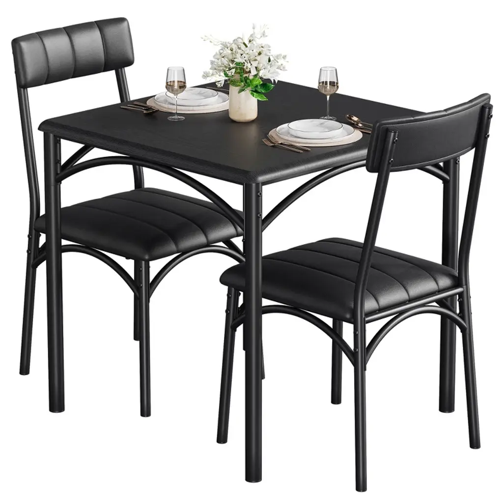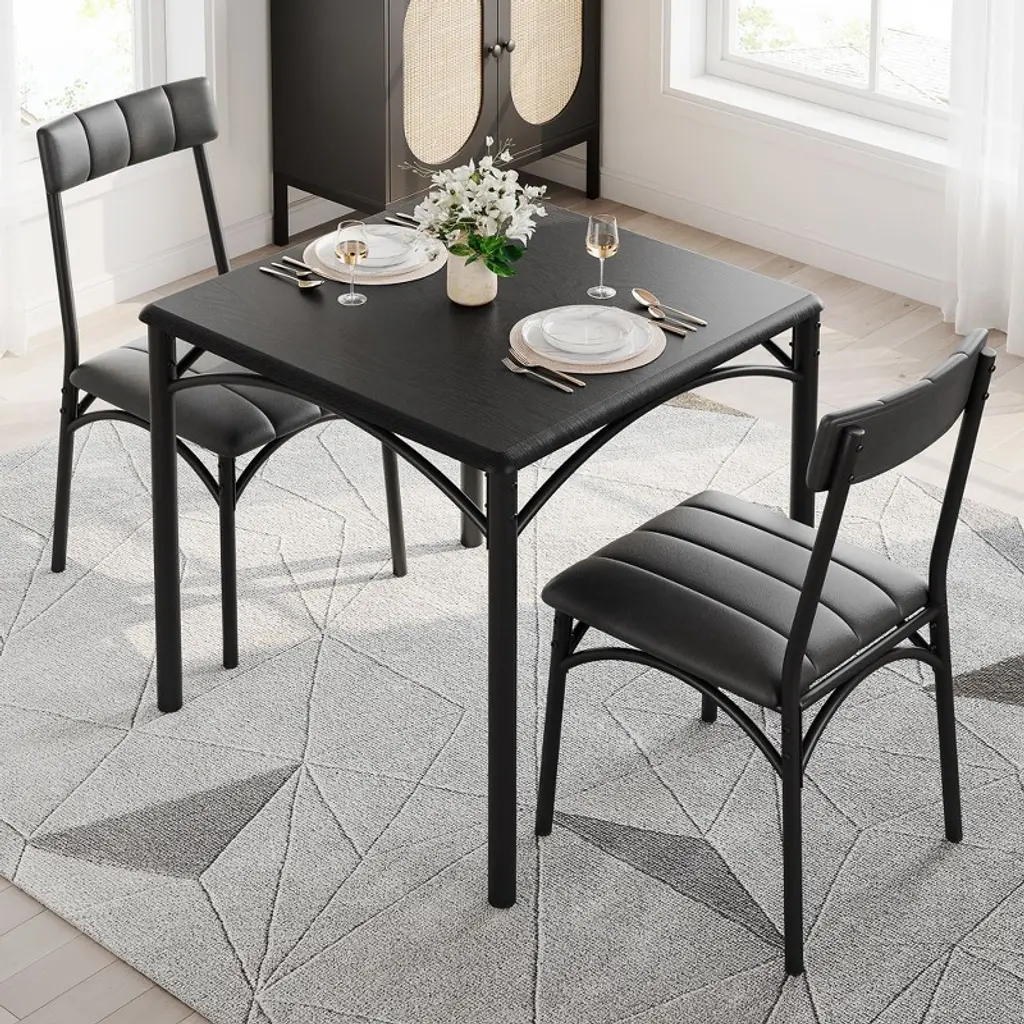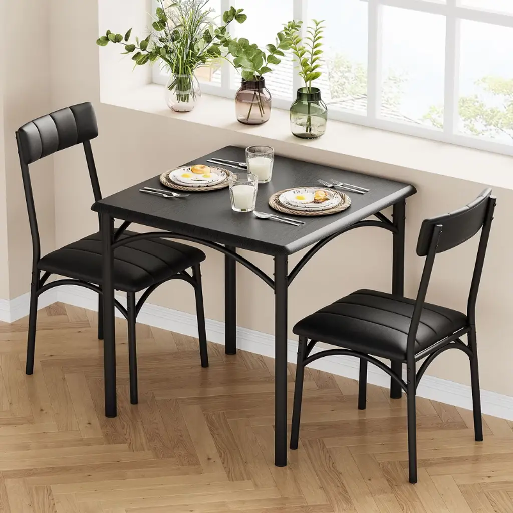 Maximize your dining space with the 3-Piece Dining Set, featuring a stylish wooden table + 2 plush cushioned chairs designed for cozy meals. Perfect for small apartments, breakfast nooks, or kitchen corners, this space-saving set combines farmhouse charm with modern comfort. The sturdy wooden table resists scratches, while the padded chairs provide all-day comfort. Easy to assemble and built to last, it's the ideal solution for couples, urban dwellers, or anyone needing a compact dining solution.