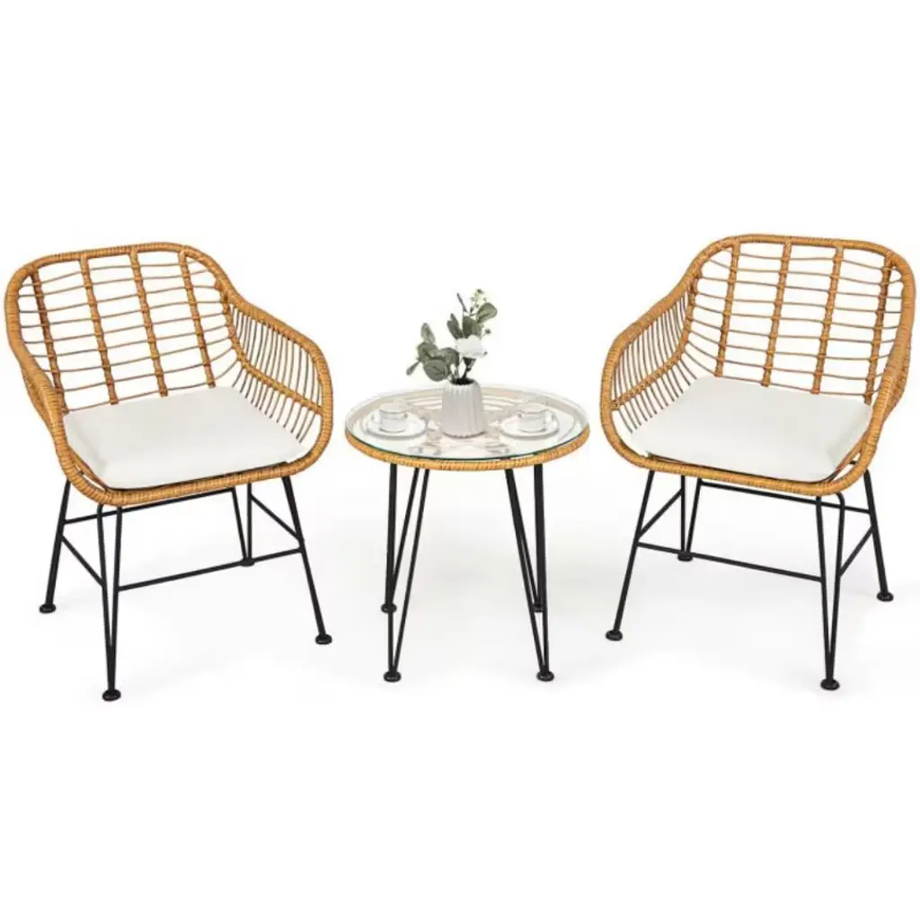 3 Pieces Patio Bistro Furniture Set, Wicker Set, Outdoor Rattan Furniture Set with Upholstered Chairs and Glass-Top Coffee Table, Suitable for Balcony, Garden, Lawn or Backyard, Outdoor Cafe