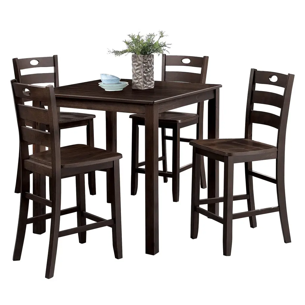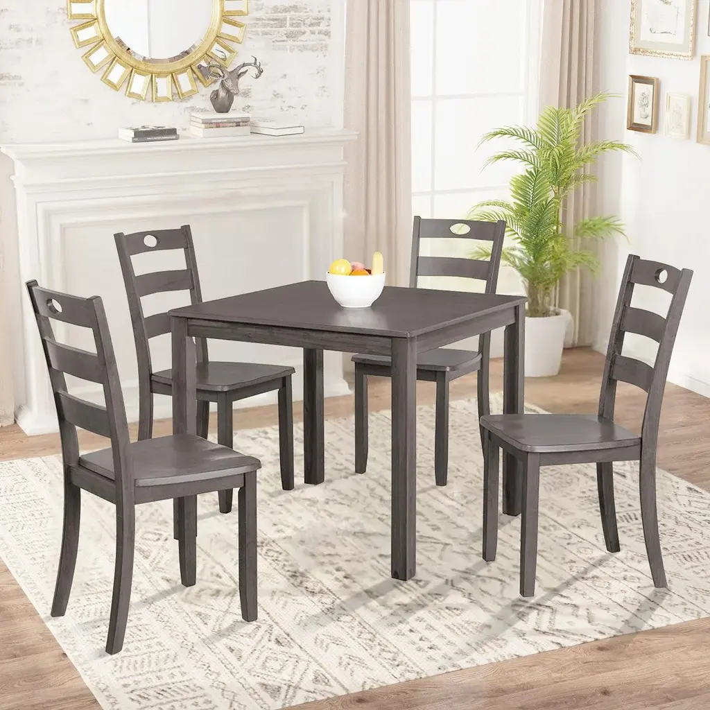 Introducing the 5 Piece Dining Room Set, featuring a table and four chairs, perfect for creating a cozy gathering spot in your home. Crafted from solid rubberwood and birch veneers, this set offers unmatched strength and stability. The 36" square dining table provides plenty of room for four, making it ideal for breakfast nooks or smaller dining spaces.