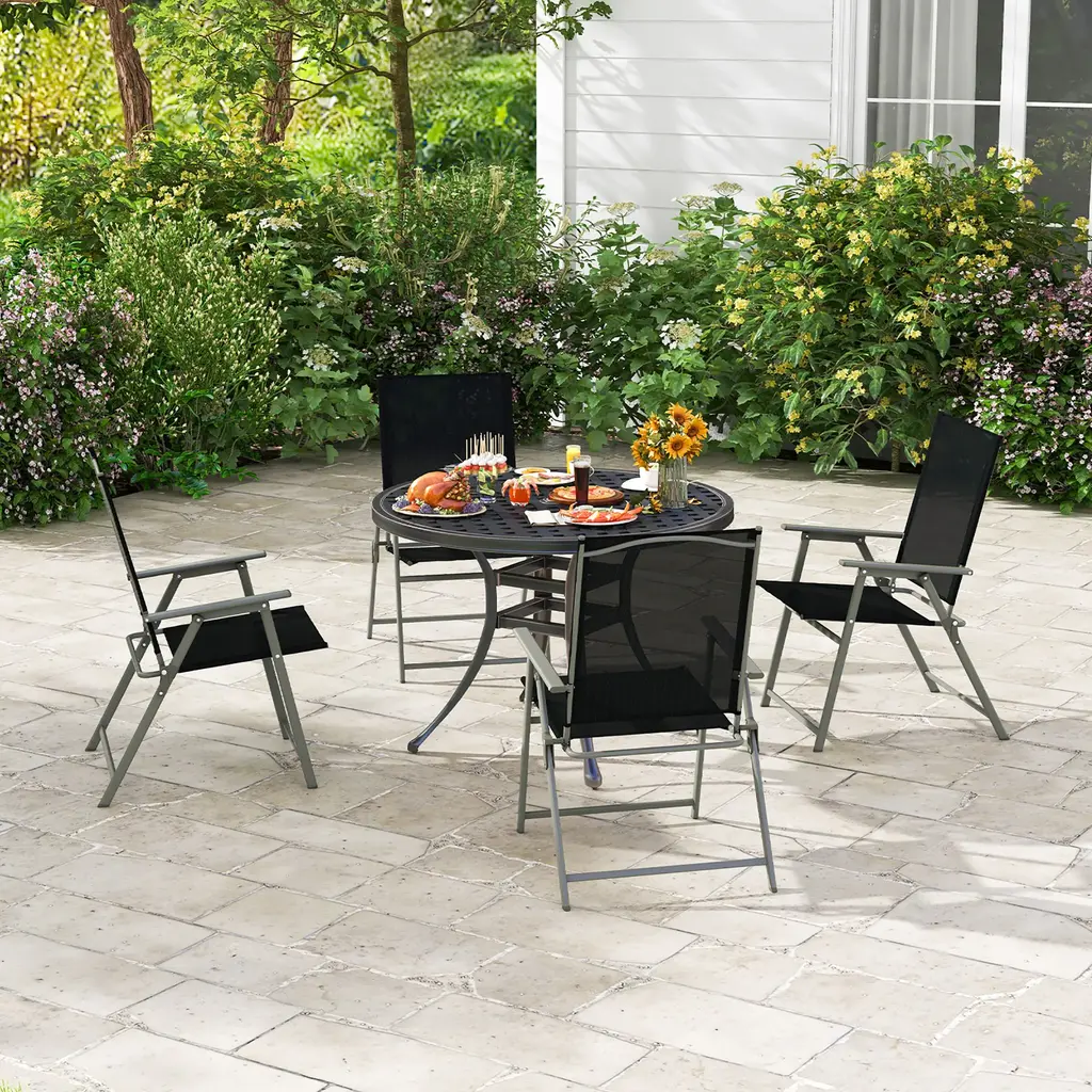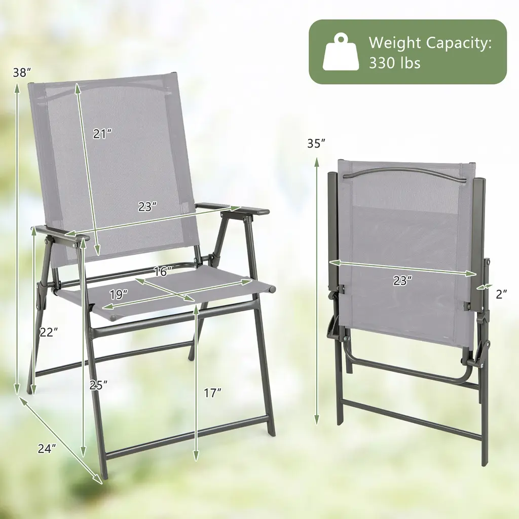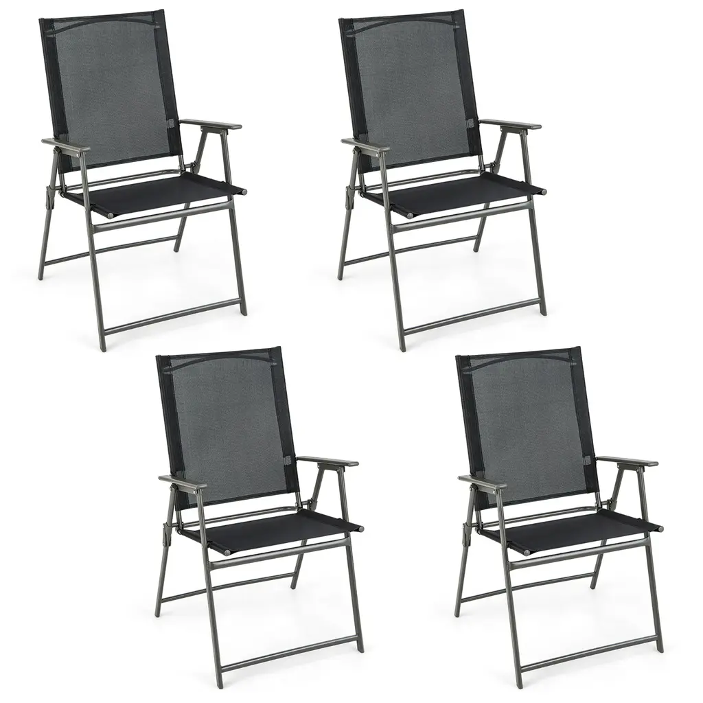 Comfortable in unfolding and convenient in folding with our 4 pieces outdoor patio chairs! For comfort, these outdoor folding chairs feature high backrests, cozy armrests and deep seats. Meanwhile, the breathable and fast-drying fabrics are designed for extra comfort. Therefore, you can sit on these patio chairs cozily. During sitting, the sturdy and anti-rust metal frames as well as security locks will endow these outdoor dining chairs with higher stability and safety. If you wanna fold these chairs, just lift the security locks for easy folding. Features:Specification