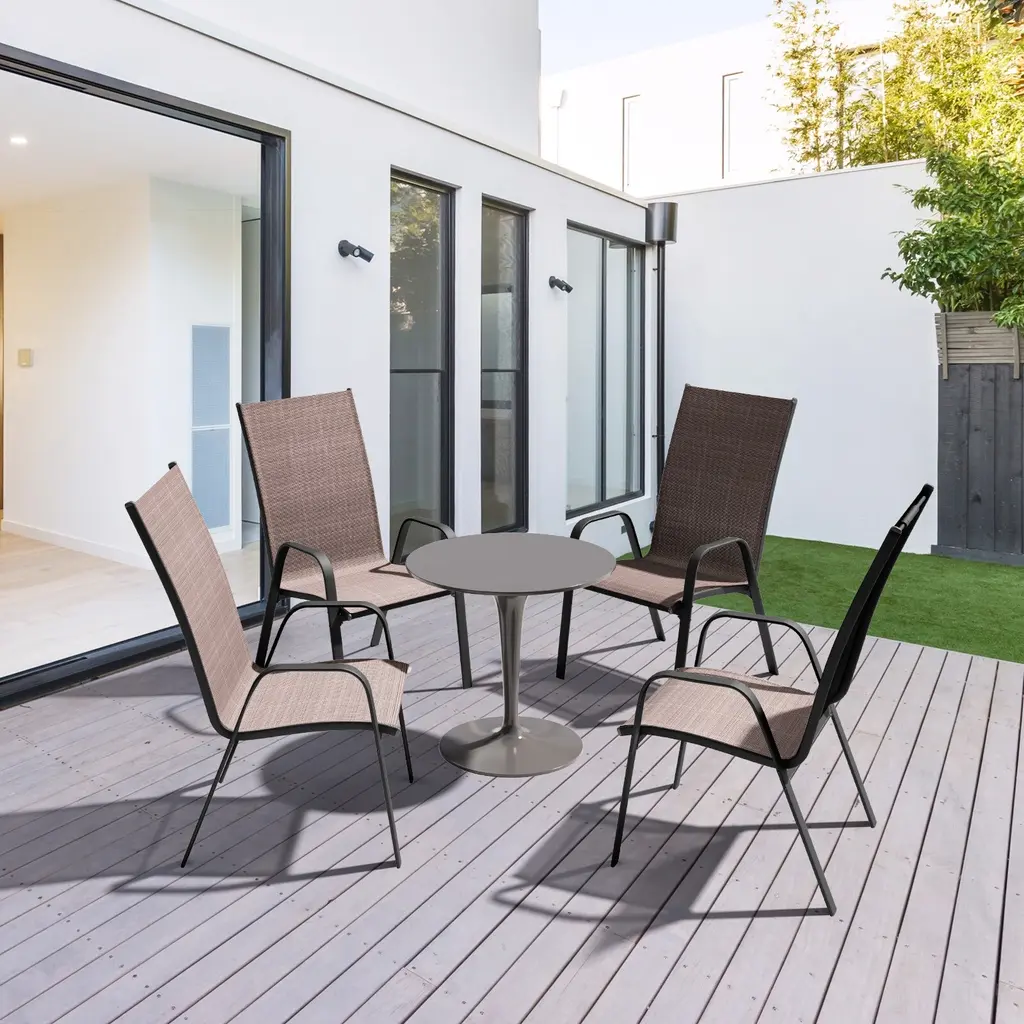 Enhance your dining space with this stylish and practical set of 4 stackable dining chairs. Designed with a durable metal frame and upholstered in high-quality textilene fabric,, these chairs offer both comfort and resilience for everyday use. The modern, minimalist design makes them a perfect addition to any contemporary home, office, or restaurant setting.The sturdy metal frame ensures long-lasting support, while the textilene fabric, provides a smooth, easy-to-clean surface that resists stains and spills, making maintenance a breeze. Whether you're hosting a dinner party or enjoying a quiet meal, these chairs offer a comfortable seating experience with their ergonomic design.The stackable feature is a standout convenience, allowing you to save valuable space when the chairs are not in use—ideal for small spaces or places that require flexible seating arrangements. The set of 4 chairs can easily be stacked for compact storage, making them both practical and space-efficient.Features:Durable Metal Frame :Crafted with a sturdy metal frame, these dining chairs offer long-lasting durability and reliable support for everyday use, making them perfect for both home and commercial settings. Stackable Design for Space Efficiency:The stackable feature allows for easy storage, saving space when not in use. Ideal for small apartments, restaurants, or any space where flexibility is needed.Comfortable & Stylish:With a sleek modern design and comfortable seating, these chairs are not only functional but also add a touch of sophistication to any dining area or office space.