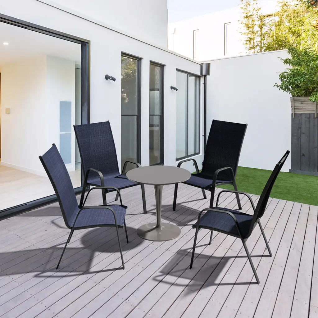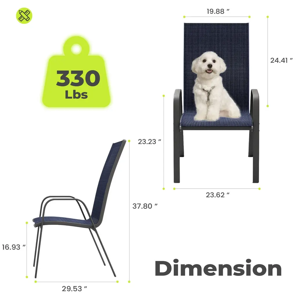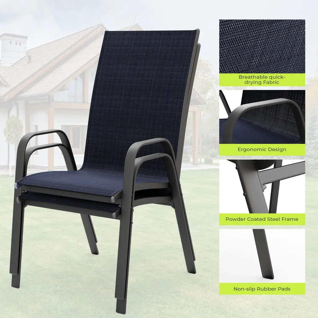 Enhance your dining space with this stylish and practical set of 4 stackable dining chairs. Designed with a durable metal frame and upholstered in high-quality textilene fabric,, these chairs offer both comfort and resilience for everyday use. The modern, minimalist design makes them a perfect addition to any contemporary home, office, or restaurant setting.The sturdy metal frame ensures long-lasting support, while the textilene fabric, provides a smooth, easy-to-clean surface that resists stains and spills, making maintenance a breeze. Whether you're hosting a dinner party or enjoying a quiet meal, these chairs offer a comfortable seating experience with their ergonomic design.The stackable feature is a standout convenience, allowing you to save valuable space when the chairs are not in use—ideal for small spaces or places that require flexible seating arrangements. The set of 4 chairs can easily be stacked for compact storage, making them both practical and space-efficient.Features:Durable Metal Frame :Crafted with a sturdy metal frame, these dining chairs offer long-lasting durability and reliable support for everyday use, making them perfect for both home and commercial settings. Stackable Design for Space Efficiency:The stackable feature allows for easy storage, saving space when not in use. Ideal for small apartments, restaurants, or any space where flexibility is needed.Comfortable & Stylish:With a sleek modern design and comfortable seating, these chairs are not only functional but also add a touch of sophistication to any dining area or office space.