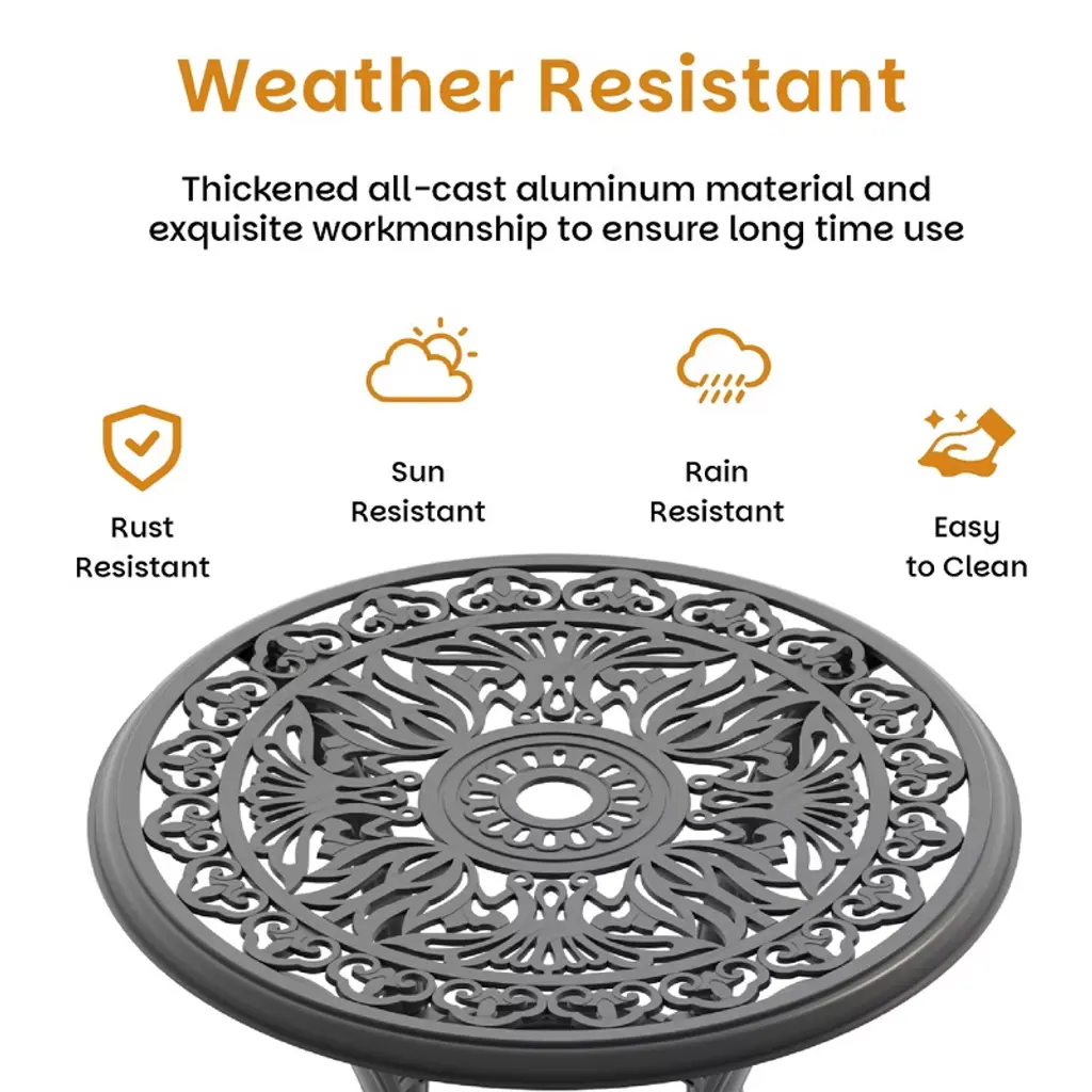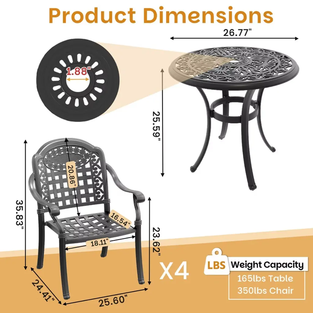 What's Included? ✔ 1 Aluminum Dining Table (26.77" L*26.77"W*28.35"H) ✔ 4 Rust-Resistant Chairs ✔ 4 Blue Cushions This 5-piece patio furniture dining set is crafted from rust-resistant and weather-resistant cast aluminum frames with high-performance powder coating, ensuring durability and against rust, scratches, and rays. Each chair is ergonomically designed for comfort and comes with cushions, while the stackable design saves storage space. The table's hole (1.88" diameter) allows for shaded relaxation during sunny or rainy days. Adjustable feet ensure stability on uneven surfaces. Assembly is quick and straightforward, with all hardware and instructions provided.