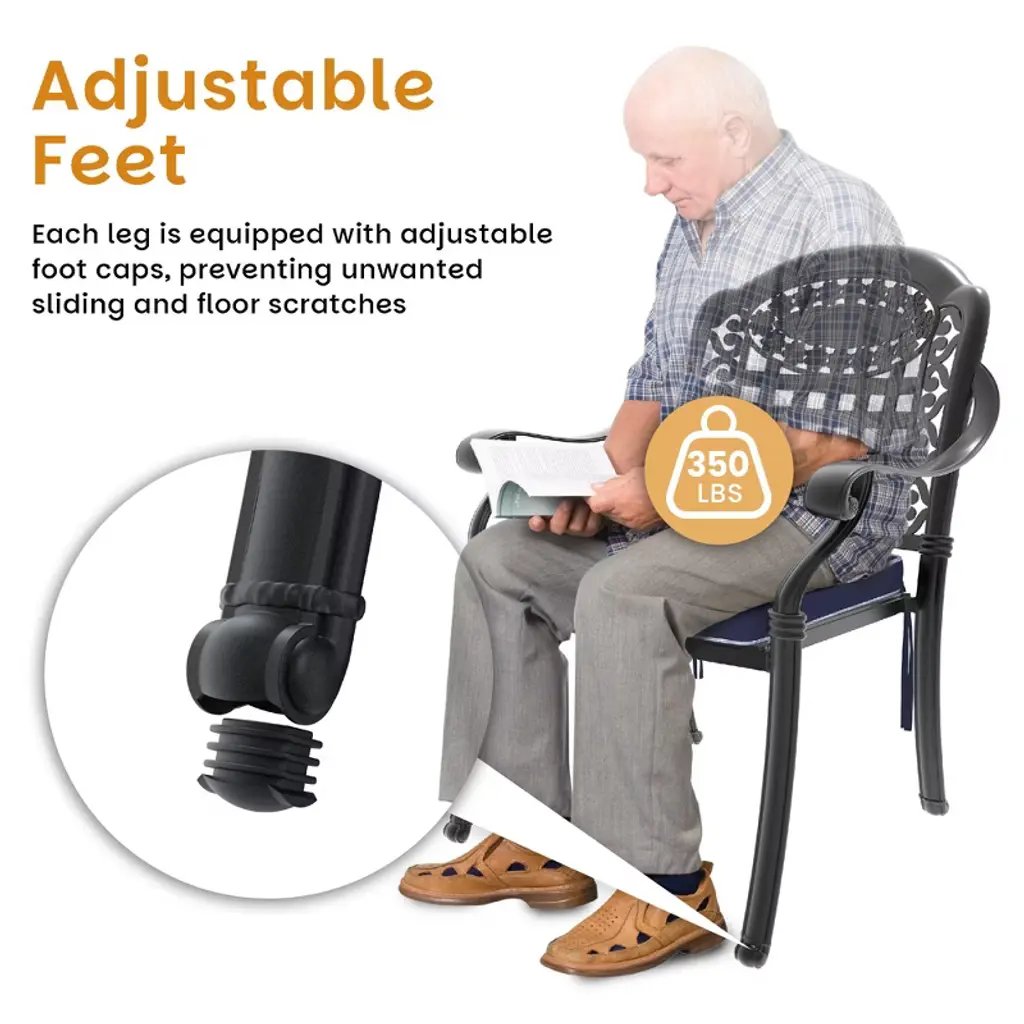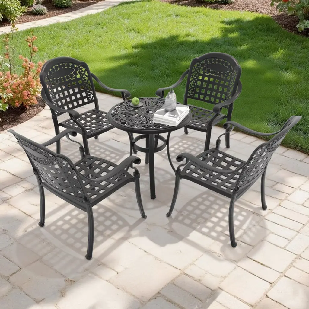 5-piece Cast Aluminum Outdoor Dining Set: Round Table, Stackable Chairs & Blue Cushions - All-weather Patio Furniture For Your Backyard