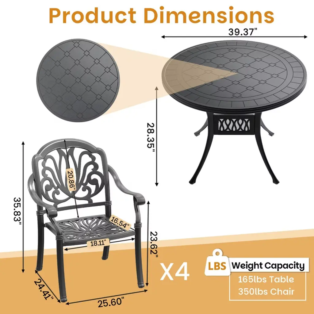 What's Included? ✔ 1 Aluminum Dining Table (39.37" L*39.37"W*28.35"H) ✔ 4 Rust-Resistant Chairs ✔ 4 Brown Cushions This 5-piece patio furniture dining set is crafted from rust-resistant and weather-resistant cast aluminum frames with high-performance powder coating, ensuring durability and against rust, scratches, and rays. Each chair is ergonomically designed for comfort and comes with cushions, while the stackable design saves storage space. Adjustable feet ensure stability on uneven surfaces. Assembly is quick and straightforward, with all hardware and instructions provided.