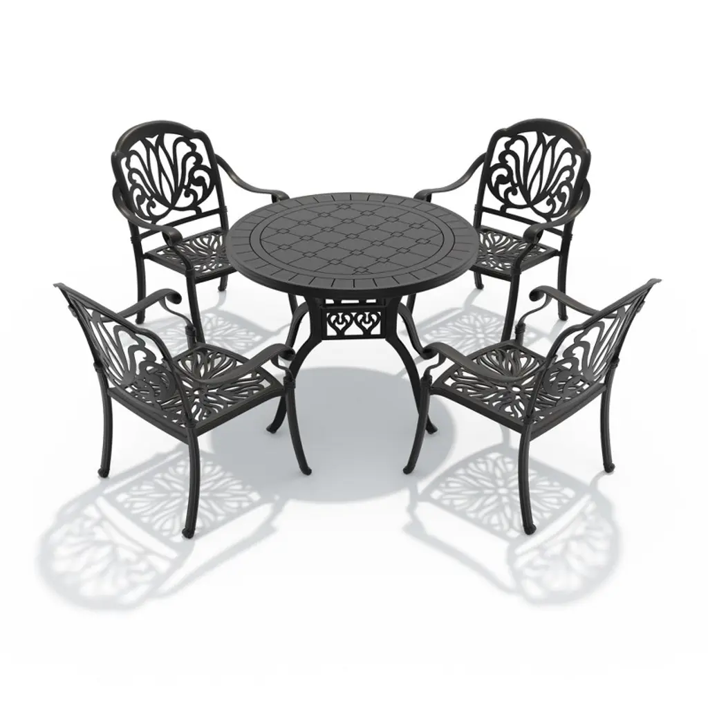 5-piece Cast Aluminum Outdoor Dining Set: Round Table, Stackable Chairs & Brown Cushions - All-weather Patio Furniture For Your Backyard