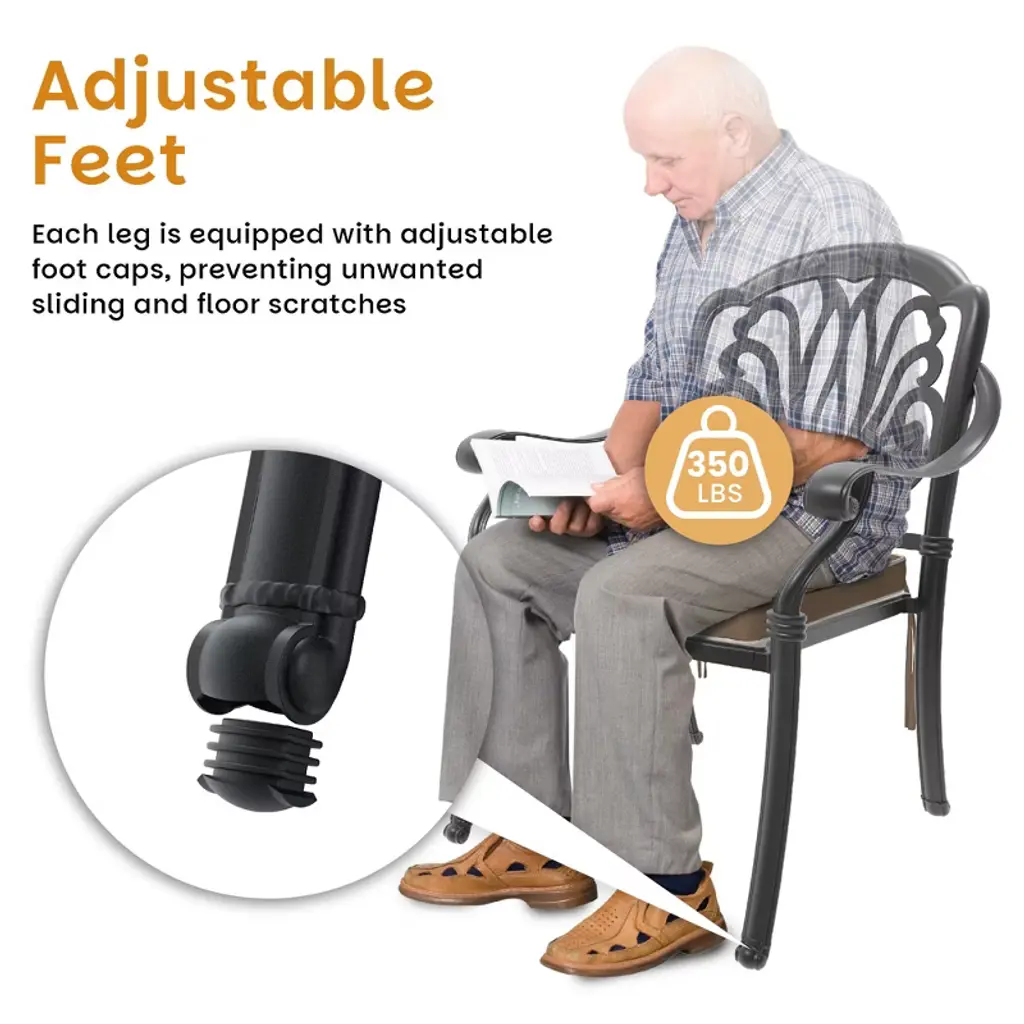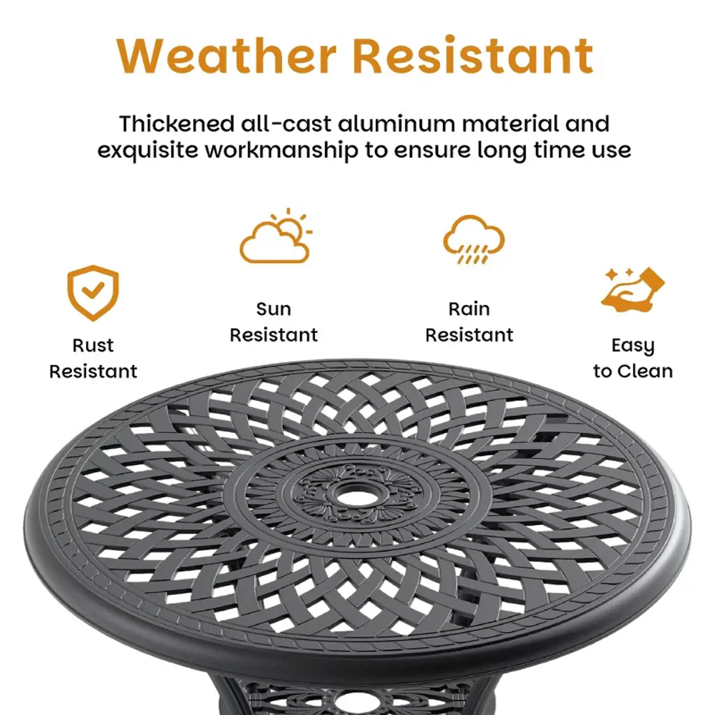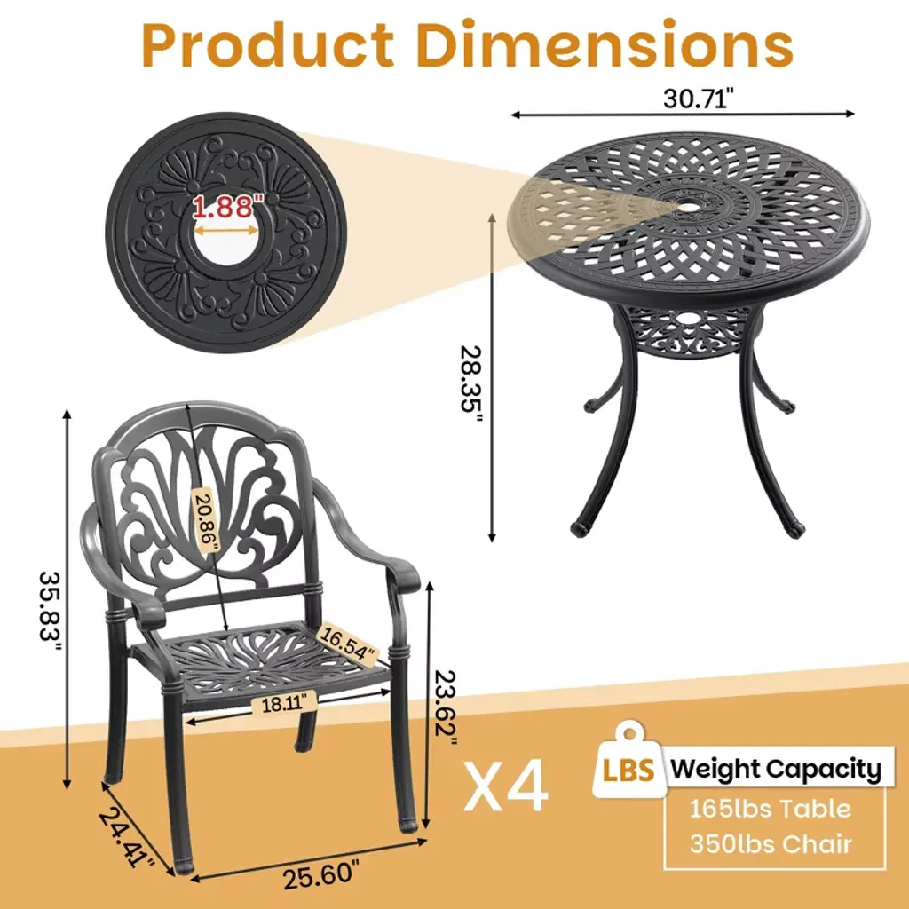 What's Included? ✔ 1 Aluminum Dining Table (30.71" L*30.71"W*28.35"H) ✔ 4 Rust-Resistant Chairs ✔ 4 Brown Cushions This 5-piece patio furniture dining set is crafted from rust-resistant and weather-resistant cast aluminum frames with high-performance powder coating, ensuring durability and against rust, scratches, and rays. Each chair is ergonomically designed for comfort and comes with cushions, while the stackable design saves storage space. The table's hole (1.88" diameter) allows for shaded relaxation during sunny or rainy days. Adjustable feet ensure stability on uneven surfaces. Assembly is quick and straightforward, with all hardware and instructions provided.