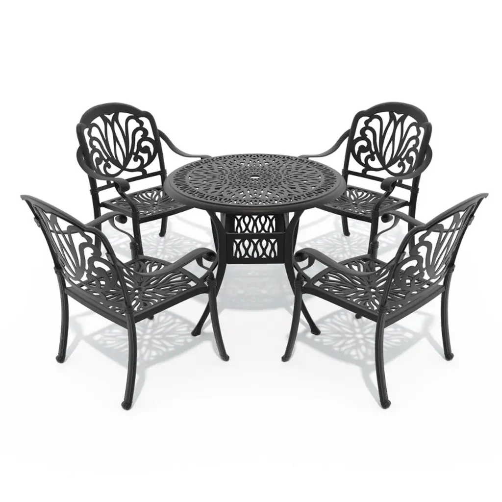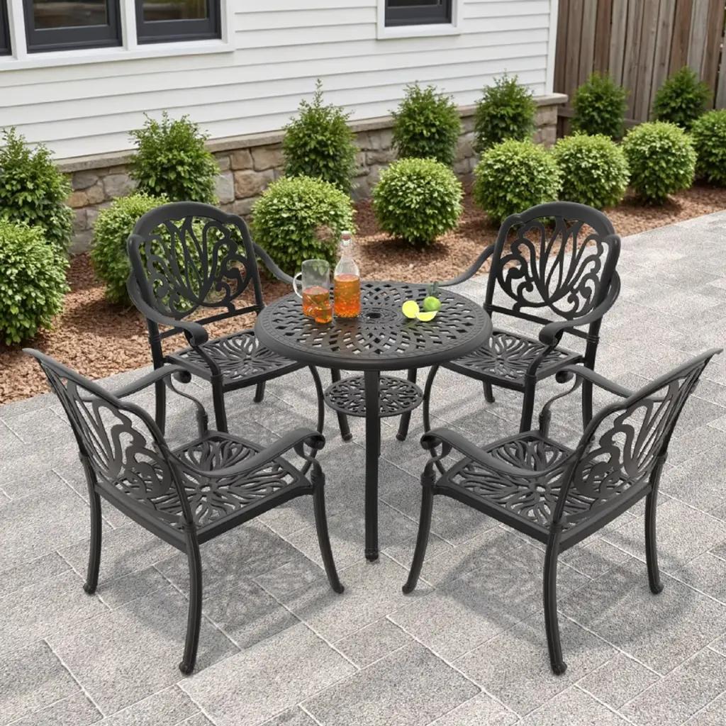 5-piece Cast Aluminum Outdoor Dining Set: Round Table, Stackable Chairs & Brown Cushions - All-weather Patio Furniture For Your Backyard