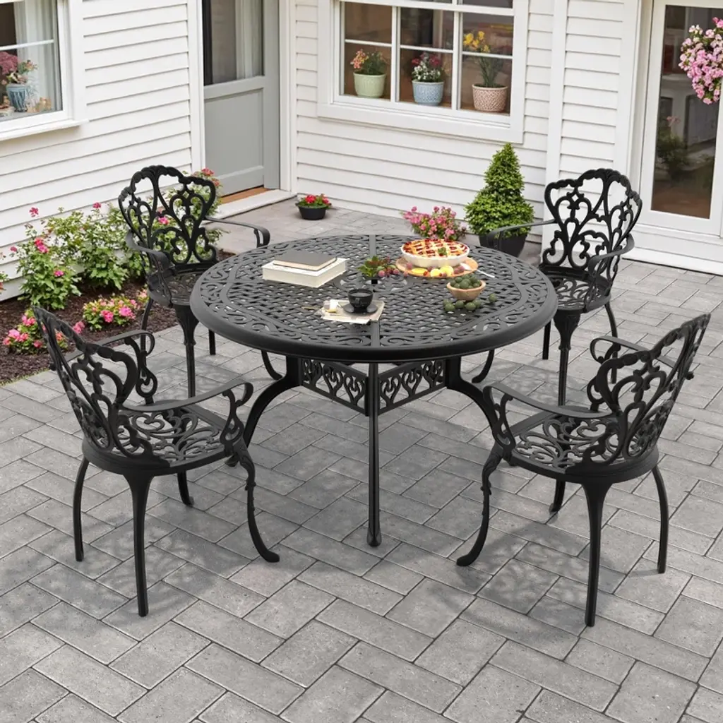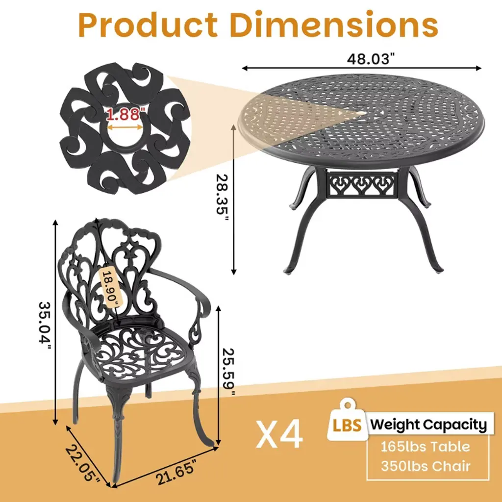 What's Included? ✔ 1 Aluminum Dining Table (48.03" L*48.03"W*28.35"H) ✔ 4 Rust-Resistant Chairs ✔ 4 Beige Cushions This 5-piece patio furniture dining set is crafted from rust-resistant and weather-resistant cast aluminum frames with high-performance powder coating, ensuring durability and against rust, scratches, and rays. Each chair is ergonomically designed for comfort and comes with cushions. The table's hole (1.88" diameter) allows for shaded relaxation during sunny or rainy days. Adjustable feet ensure stability on uneven surfaces. Assembly is quick and straightforward, with all hardware and instructions provided.