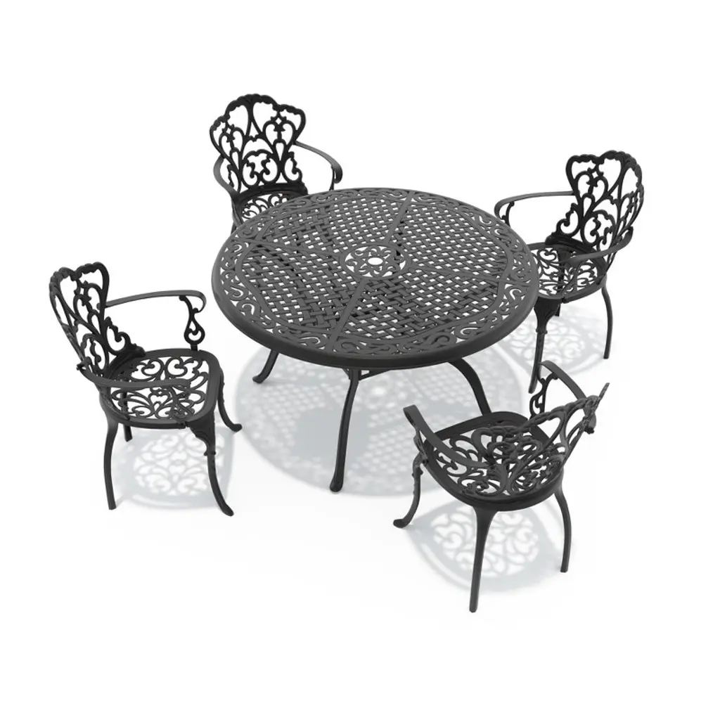 5-piece Cast Aluminum Outdoor Dining Set With Beige Cushions, Round Table & Ergonomic Chairs - For Patio, Backyard
