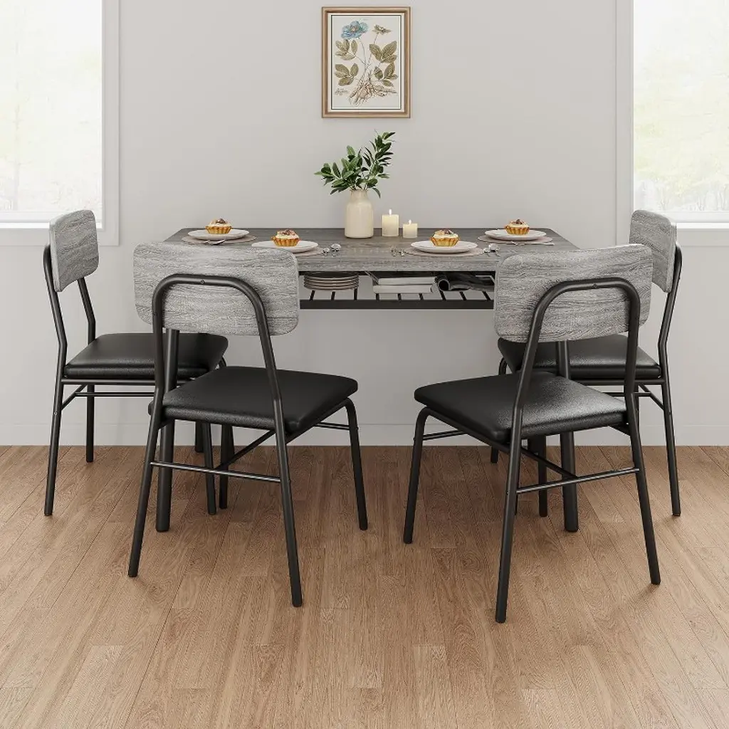 【Modern Elegance & Durable Construction】Elevate your dining space with this sleek 5-piece table set featuring a rich brown wood-top table and robust metal legs support. Crafted from premium MDF and a reinforced iron frame, it ensures lasting stability and modern style—perfect for apartments, dining rooms, or cozy kitchens. 【Smart Storage for Effortless Organization】Maximize space with the integrated bottom-mounted metal wire storage rack. Ideal for stashing dishes, napkins, and kitchen essentials within easy reach, while maintaining ample legroom. This functional solution keeps your dining area clutter-free and efficient. 【Space-Saving Design for Compact Living】Designed for small spaces, this compact square table set includes 4 upholstered chairs that tuck neatly beneath the table. Its streamlined footprint fits seamlessly in apartments, breakfast nooks, or tight kitchens without sacrificing style or functionality. 【Plush Comfort for Relaxed Dining】Savor every meal with ergonomic padded chairs featuring soft cushions and supportive backrests. The upholstered chairs set of 4 prioritizes comfort, making extended dining or casual gatherings enjoyable in your kitchen or dining room. 【Quick Assembly & Long-Term Reliability】Enjoy hassle-free setup with clear, step-by-step instructions. For sustained durability, simply screws periodically. This 5-piece dining table set for two maintains sturdiness year after year—ideal for busy households seeking fuss-free furniture.