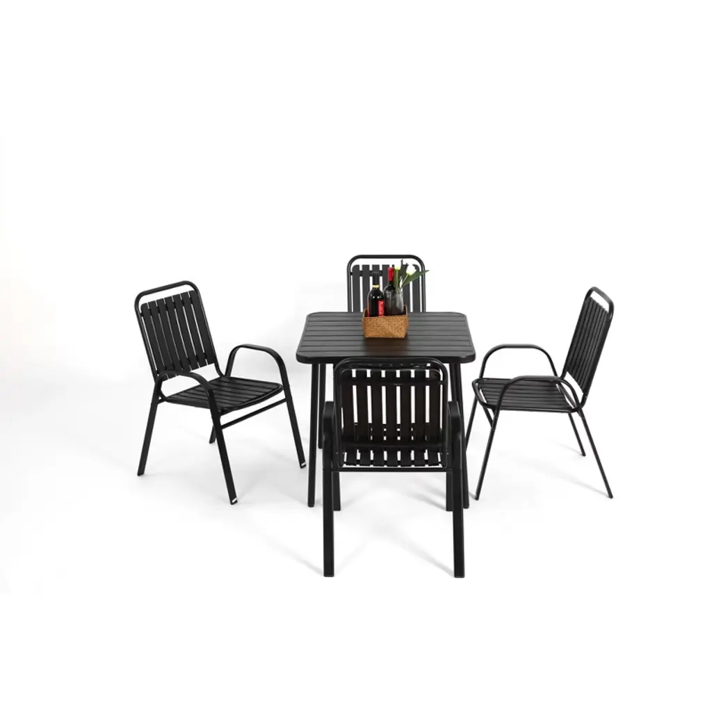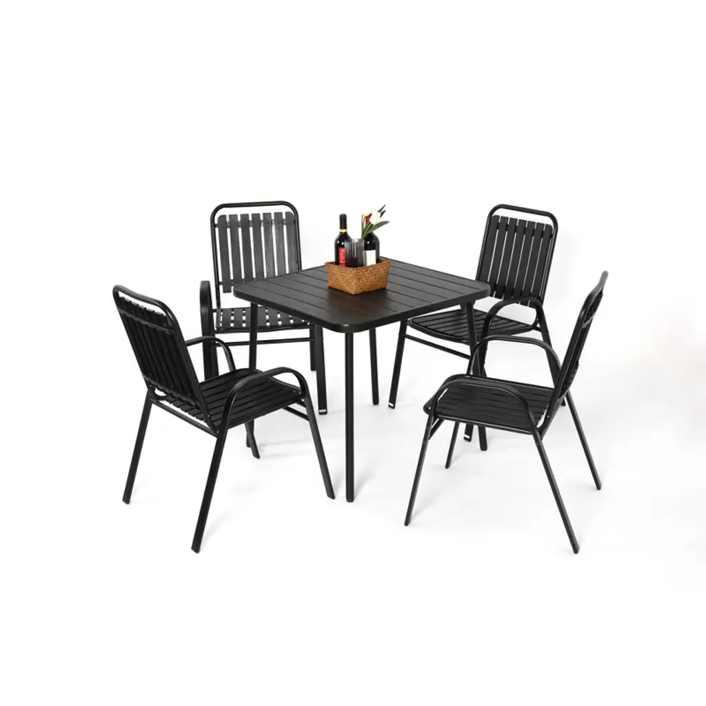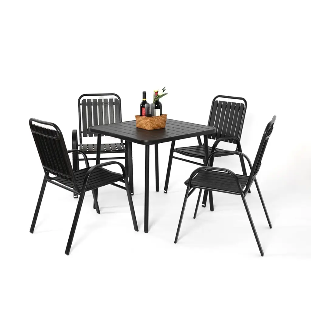 5-Piece Outdoor Patio Dining Set – Steel Table with 4 Plastic Chairs, Black Enhance your patio or garden with this elegant and durable 5-piece outdoor dining set. Designed for both outdoor and indoor use, it combines comfort, style, and convenience in one modern package. The set includes one square dining table and four ergonomically designed chairs—ideal for relaxed gatherings with family and friends. Key Features: Quick & Easy Assembly: Assembles in just 20–30 minutes with all hardware and instructions included—no tools or frustration required.Functional Coffee Table: The steel table features a unique 3D embossed tree core surface and reinforced iron bar support for a stylish and stable dining experience.Durable Metal Frame: Crafted with a rust-resistant, weatherproof steel frame and finished with E-coating for long-term outdoor durability and easy cleaning.Premium Seating Comfort: Includes thick, fade-resistant, waterproof polyester cushions with removable, washable zippered covers for easy maintenance and all-day comfort.Indoor & Outdoor Versatility: Perfect for patios, balconies, gardens, or even indoor kitchens and dining rooms, thanks to its minimalist, adaptable design. Specifications: Set Includes: 1 Dining Table + 4 ChairsTable Dimensions: 31.50" L x 31.50" W x 28.74" HChair Dimensions: 22.05" L x 24.80" W x 35.43" HTabletop Material: SteelFrame Material: Steel with E-coatingOverall Product Weight: 71.43 lbsPackaging: Ships in 2 Boxes Whether you're enjoying a casual brunch or an evening under the stars, this black patio dining set delivers modern aesthetics, robust durability, and unmatched comfort for any occasion.
