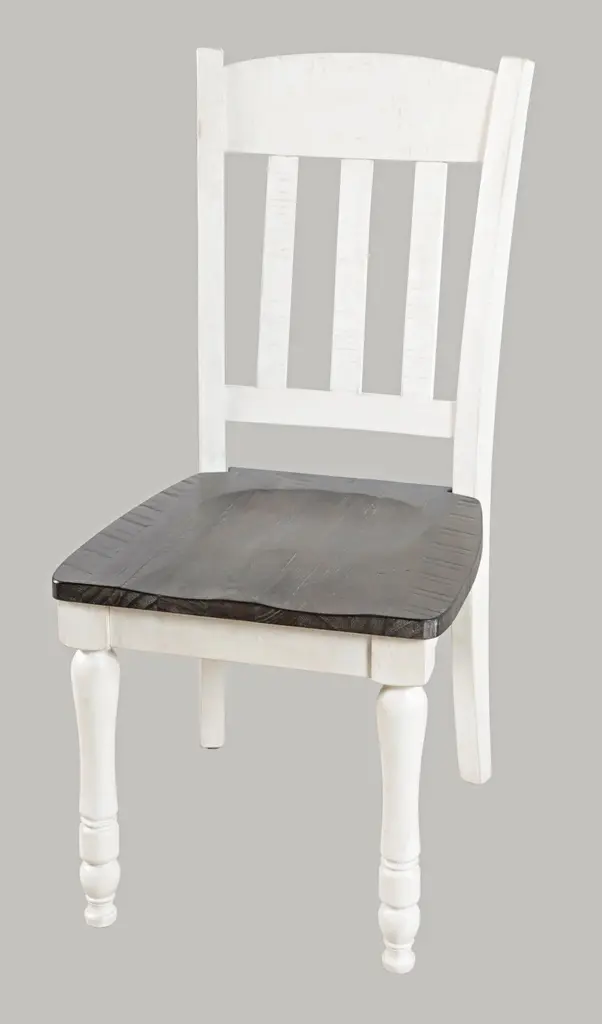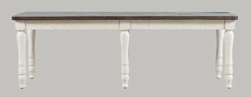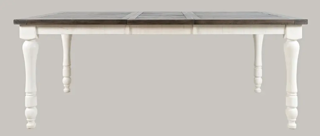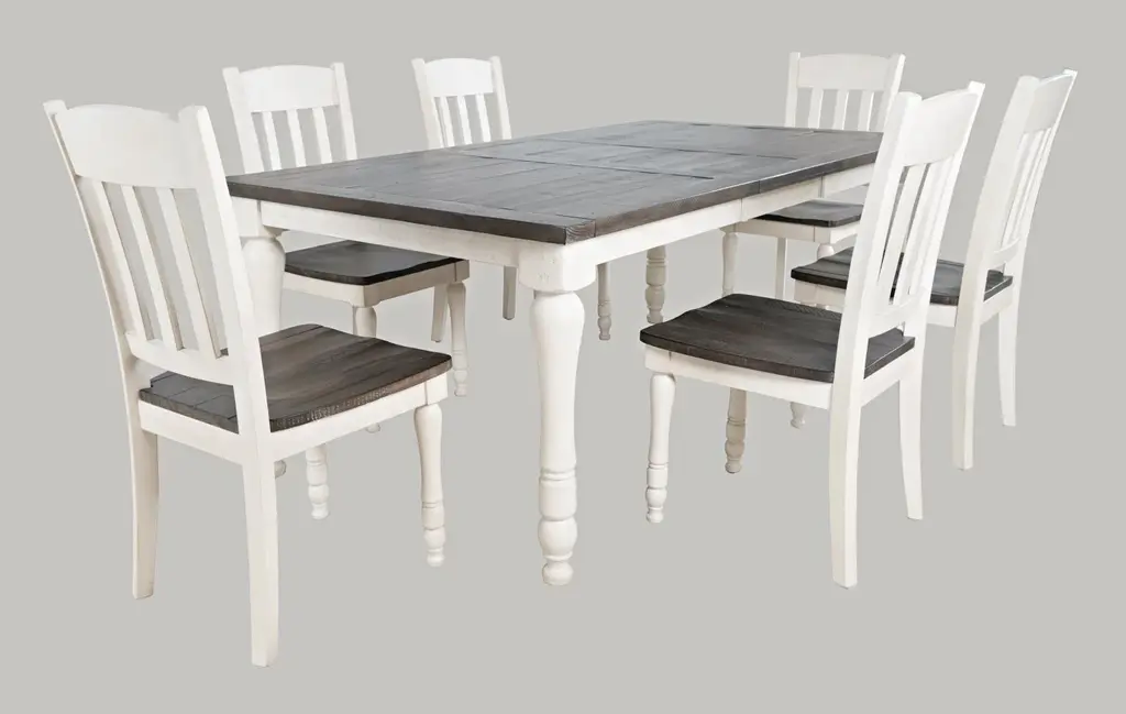 This 6-piece dining set is perfect for those who love the classic farmhouse style. The set includes a rectangular dining table with a vintage white and barnwood finish, four ladderback chairs, and a dining bench. The table features a leaf, allowing you to easily expand the seating area when needed.The set is made from solid reclaimed pine, ensuring a sturdy and long-lasting construction. The wooden table top and legs provide a natural and rustic touch, while the vintage white and barnwood finish adds a touch of elegance. The standard dining height and rectangular table top shape make it perfect for everyday meals and special occasions.The dining set seating configuration includes a bench and chairs, providing a comfortable and versatile seating arrangement for up to 6 people. The farmhouse design style and solid wood material give this set a warm and inviting atmosphere, making it a great addition to any dining room.With its classic design and high-quality construction, this dining set is sure to be a centerpiece of your home for years to come. The combination of style, functionality, and durability makes it an excellent choice for those looking to create a warm and welcoming dining space.