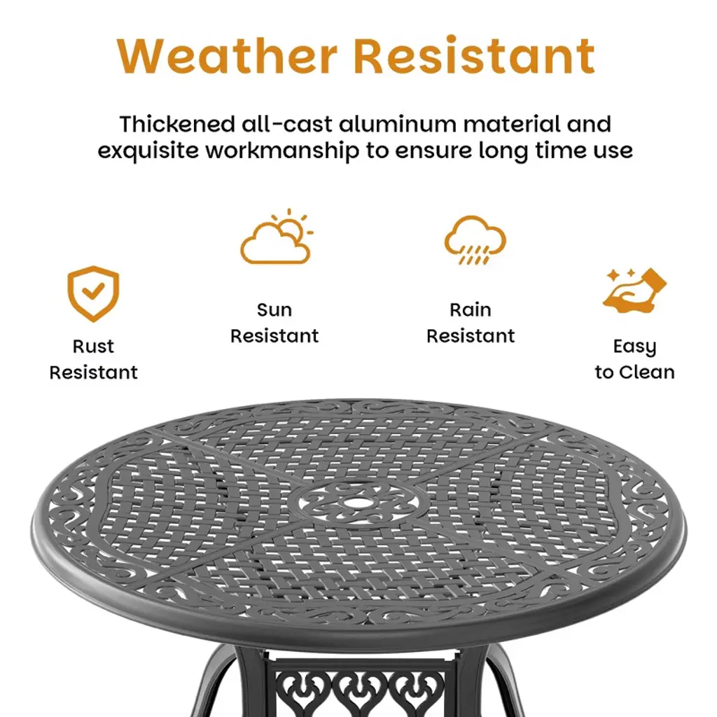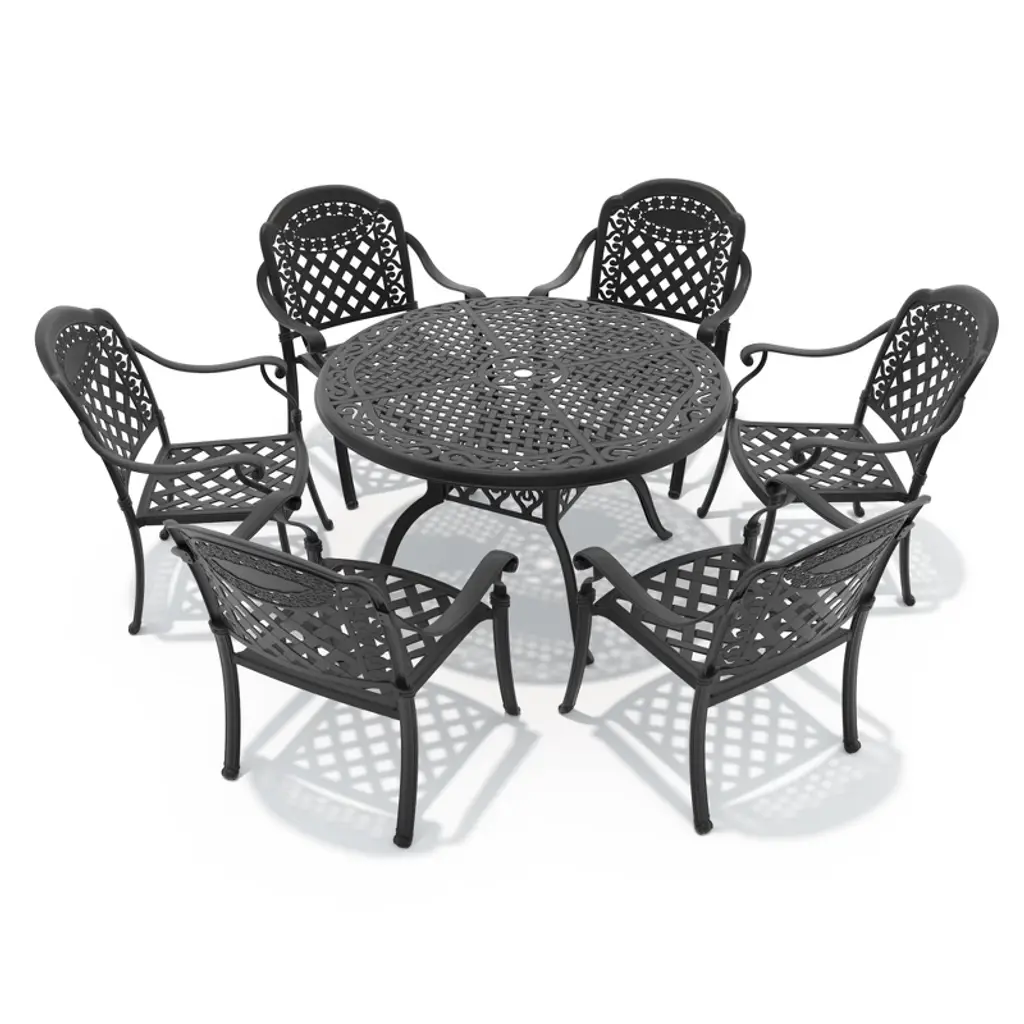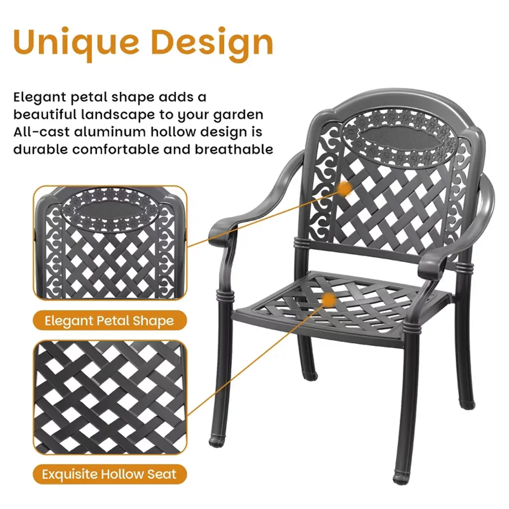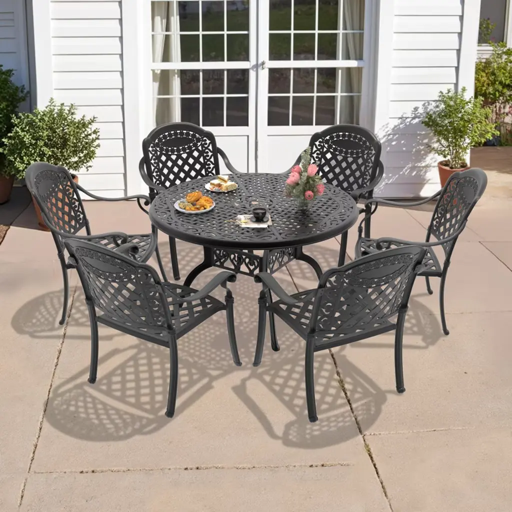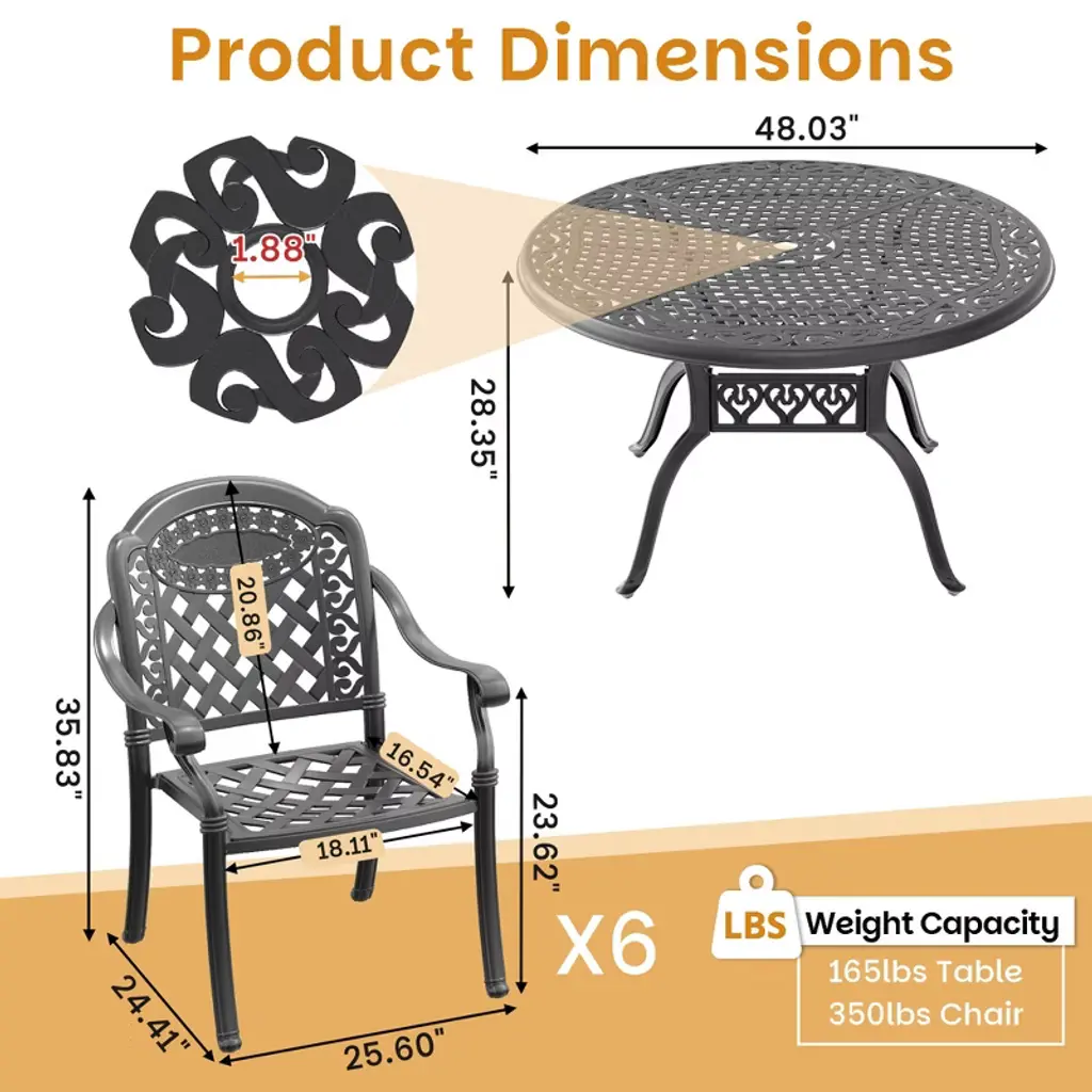 What's Included? ✔ 1 Aluminum Dining Table (48.03" L*48.03"W*28.35"H) ✔ 6 Rust-Resistant Chairs ✔ 6 Red Cushions This 7-piece patio furniture dining set is crafted from rust-resistant and weather-resistant cast aluminum frames with high-performance powder coating, ensuring durability and against rust, scratches, and rays. Each chair is ergonomically designed for comfort and comes with cushions, while the stackable design saves storage space. The table's hole (1.88" diameter) allows for shaded relaxation during sunny or rainy days. Adjustable feet ensure stability on uneven surfaces. Assembly is quick and straightforward, with all hardware and instructions provided.