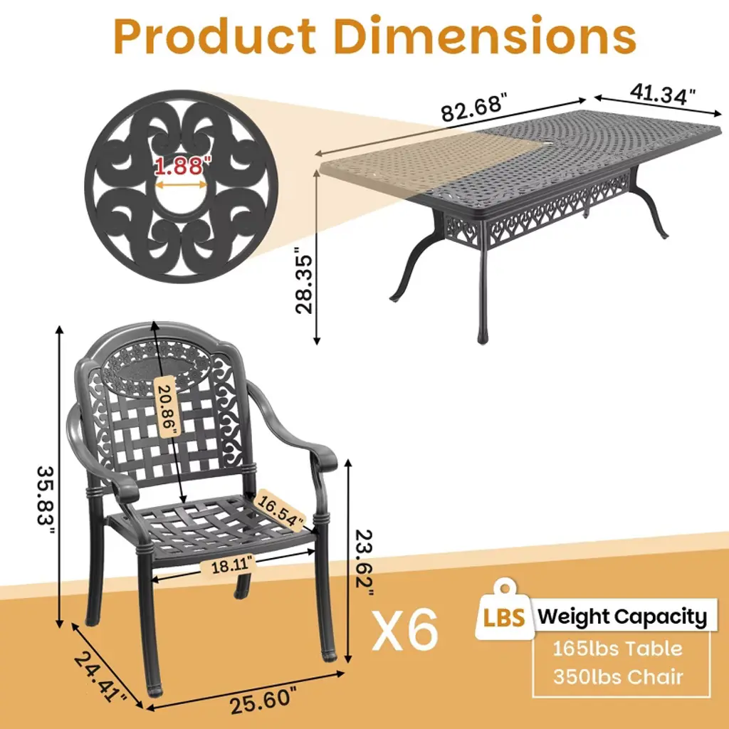 What's Included? ✔ 1 Heavy-Duty Cast Aluminum Dining Table (82.68" L*41.34"W*28.35"H) ✔ 6 Rust-Resistant Chairs ✔ 6 Blue Cushions Build your outdoor relaxation haven with our outdoor cast aluminum furniture, the ideal choice for you. Combining durable cast aluminum material with captivating retro design, it adds a distinctive ambiance to your yard, balcony, or terrace garden. The cast aluminum material guarantees the durability and stability of the product, while also making cleaning and maintenance incredibly simple. The chairs are designed to be lightweight and stackable for convenient storage, and the table comes equipped with an umbrella hole, providing a shaded retreat on sunny days. Whether for everyday family life or outdoor gatherings, this set of table and chairs will meet all your needs.