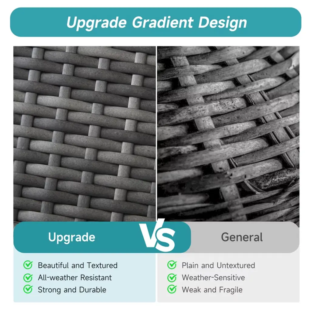 Our 7-piece outdoor patio furniture set includes 1 left corner sofa, 2 right corner sofas, 3 connecting pedals, and 1 large coffee table for flexible configurations.This complete patio furniture set adapts to any space.Feture:Premium Rattan with Weather-Resistant FeaturesErgonomic Comfort with Thick Cushioning, Complete Outdoor Living SolutionWeather-resistant Dining Table: Enjoy a durable and weather-resistantdining table with wood-plastic compositesand a slatted design.Premium Handwoven Wicker: Elevate your outdoor space with beautiful,textured, all-weather resistant, and durablehandwoven wicker furniture.Thick Seat Cushion: Relax in comfort with soft, breathableand water 3.15-inch thick seatcushions featuring a premium zipper.Metal Frame: Strudy metal construction with rust-resistant coating for long-lasting shape and strengthDimension & Included1 x coffee table: 54"X 29.1"X 26.8"3 x pedals: 15" X 15" X 13"1 x Left corner sofa: 45.3"X 24.8"X 27.6"2 x Right corner sofa: 45.3"X 24.8"X 27.6"