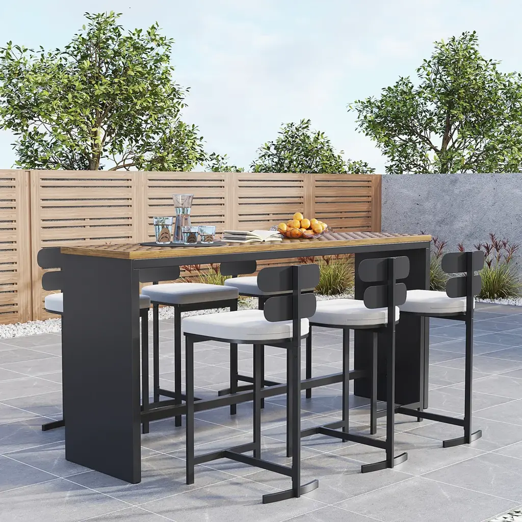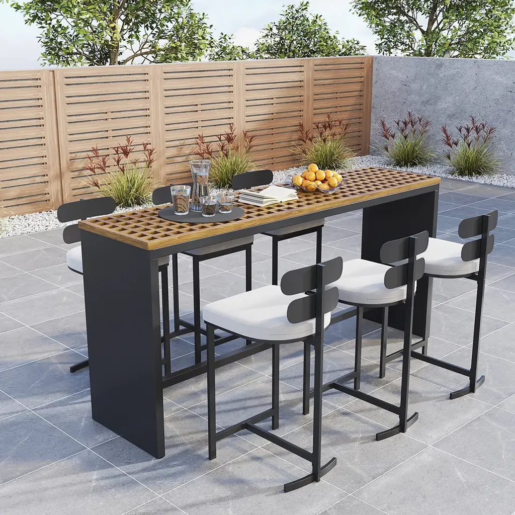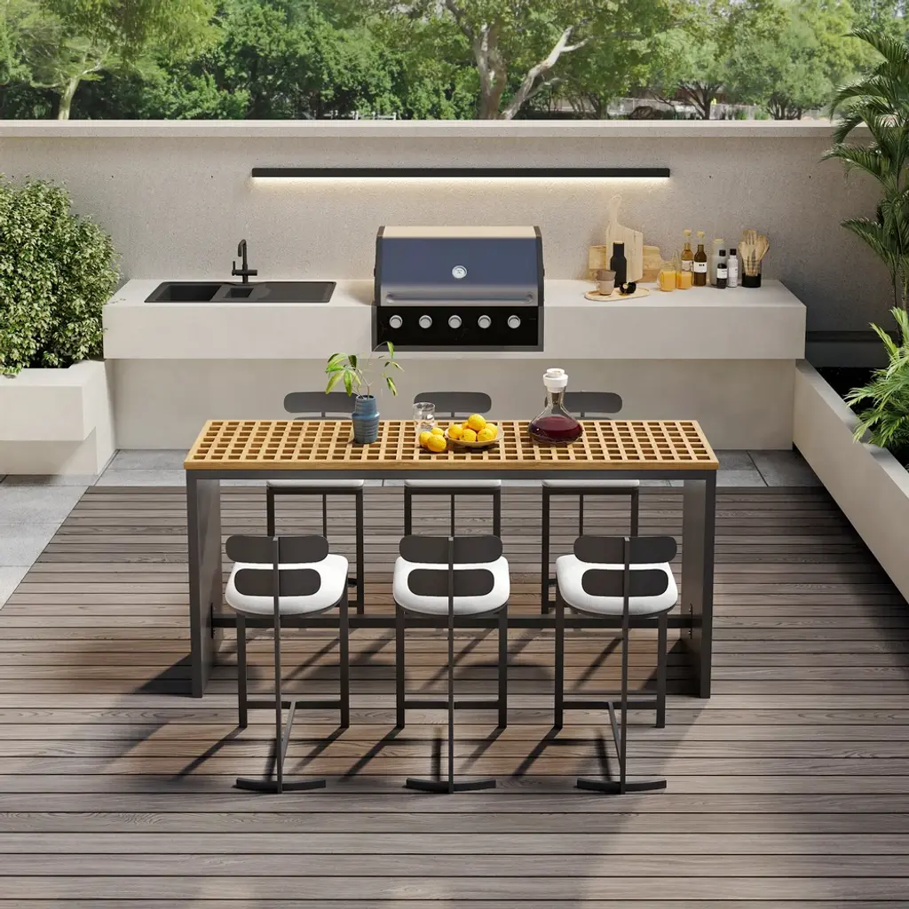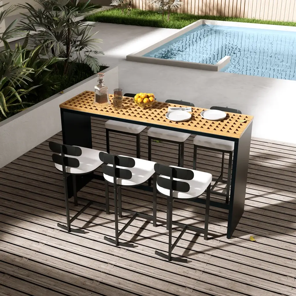This 7-piece outdoor patio bar dining set combines style and functionality with a teak-top table and comfortable seating for six. Designed to enhance any outdoor space, the set provides a sophisticated, inviting area for entertaining or casual dining, with durable materials built to withstand the elements.