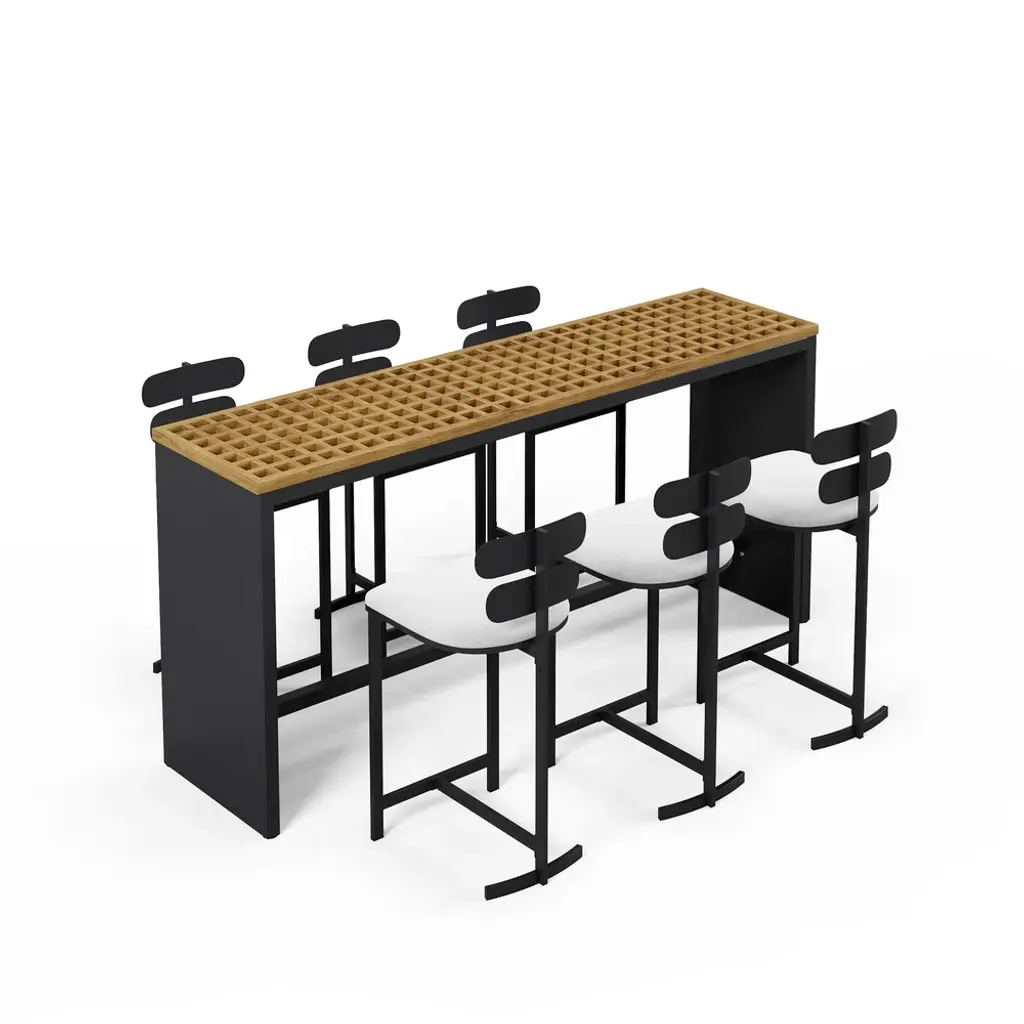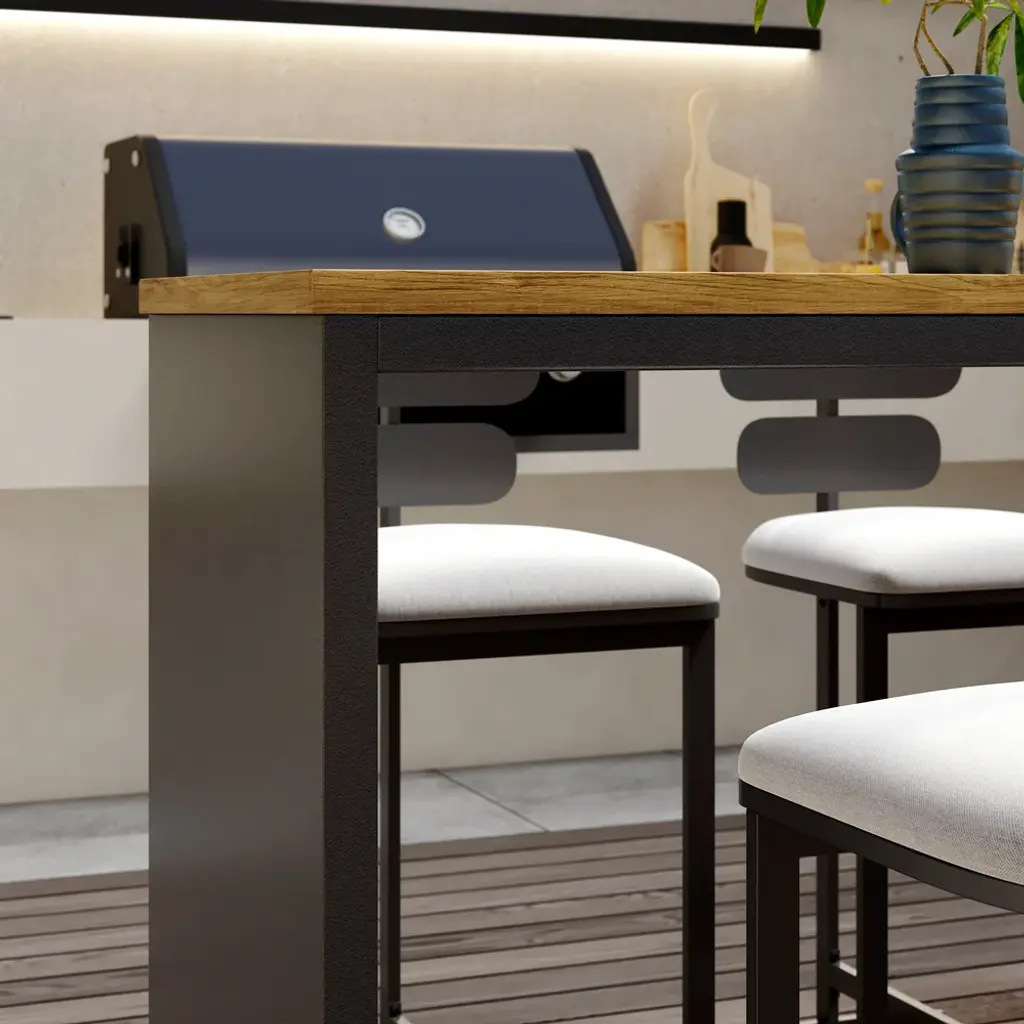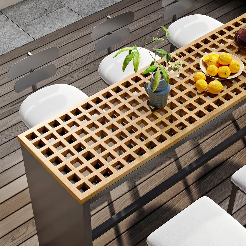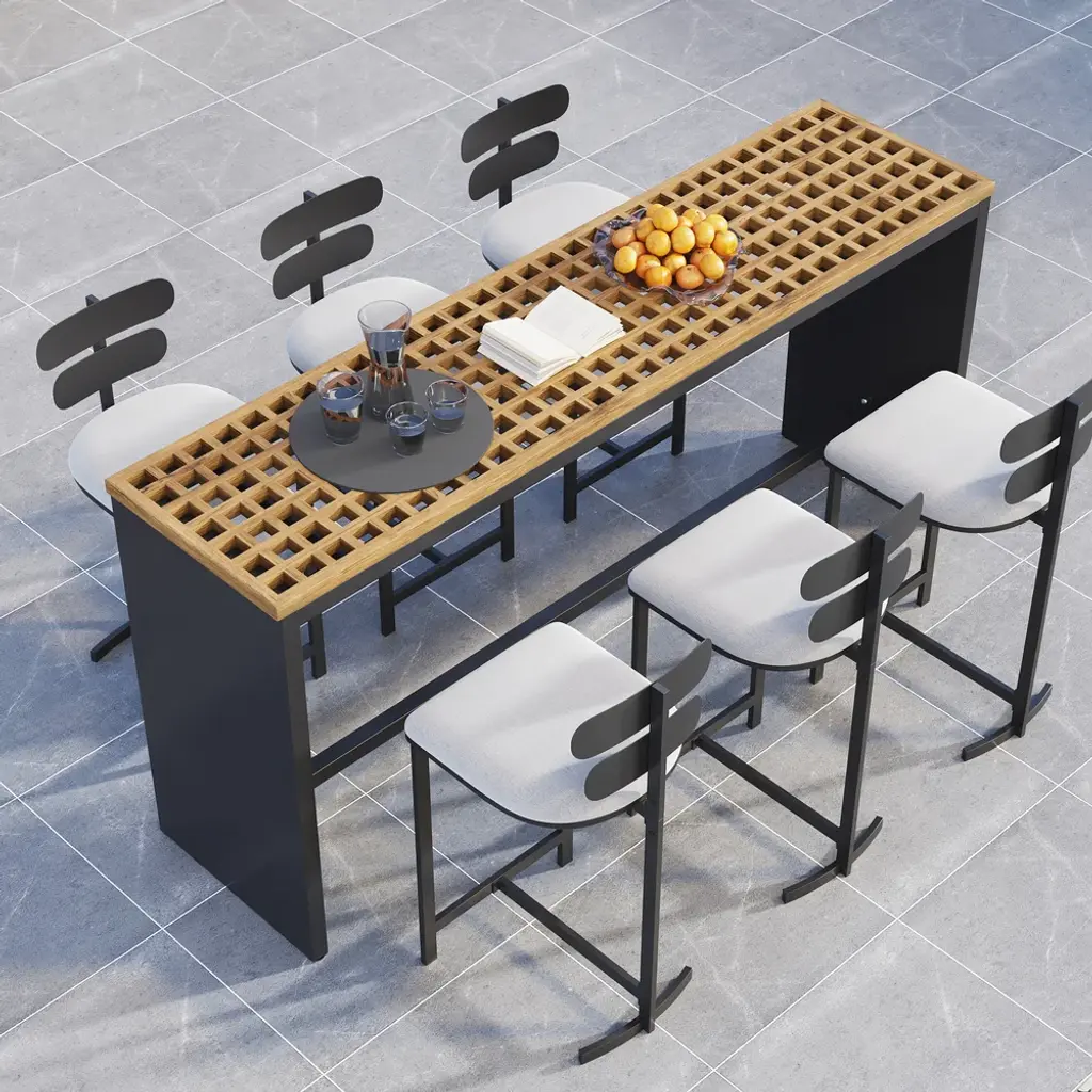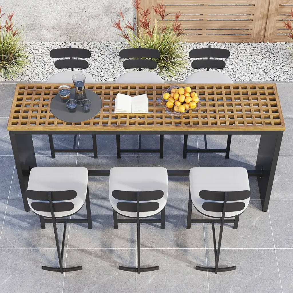 This 7-piece outdoor patio bar dining set combines style and functionality with a teak-top table and comfortable seating for six. Designed to enhance any outdoor space, the set provides a sophisticated, inviting area for entertaining or casual dining, with durable materials built to withstand the elements.