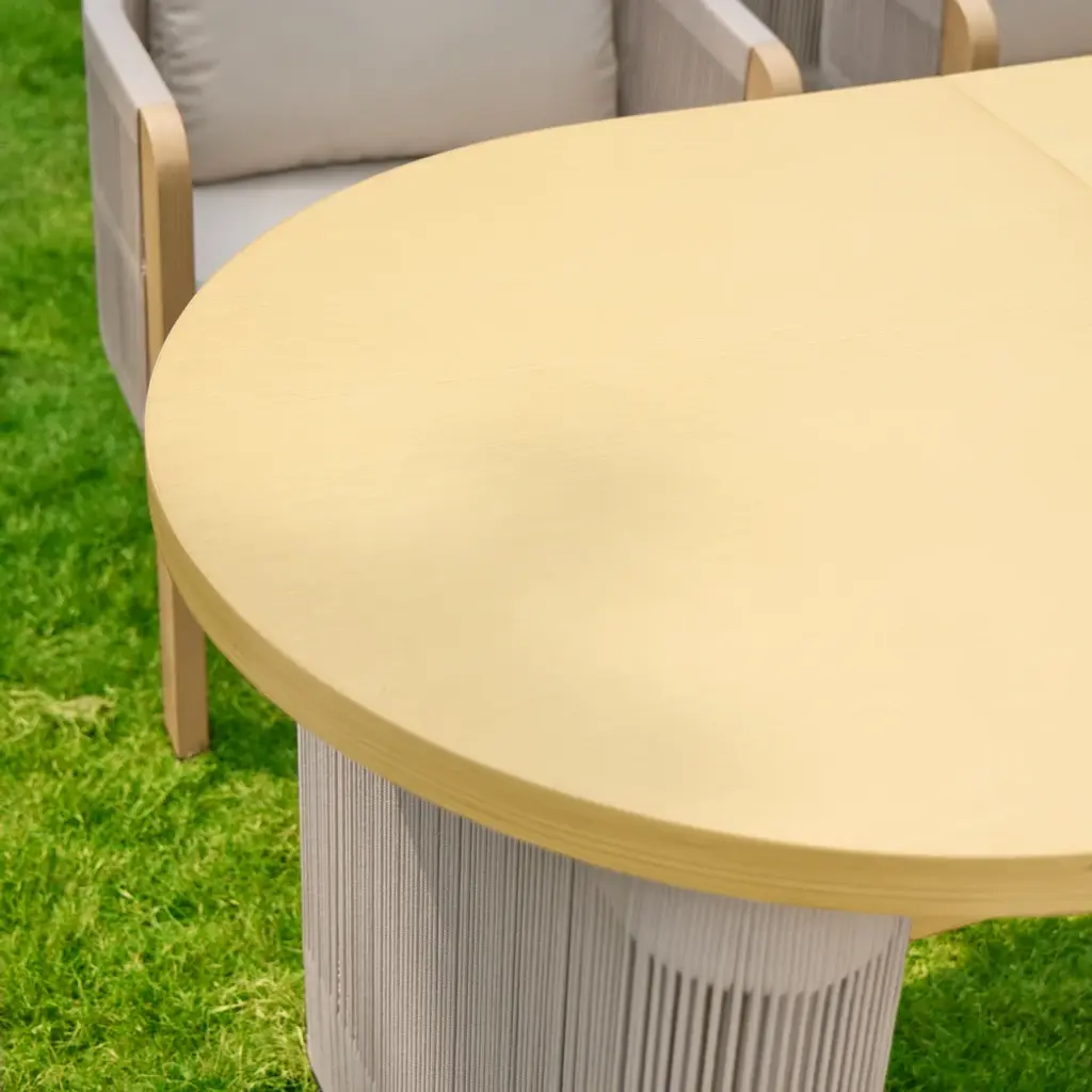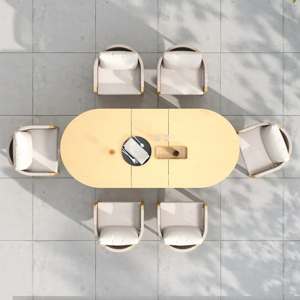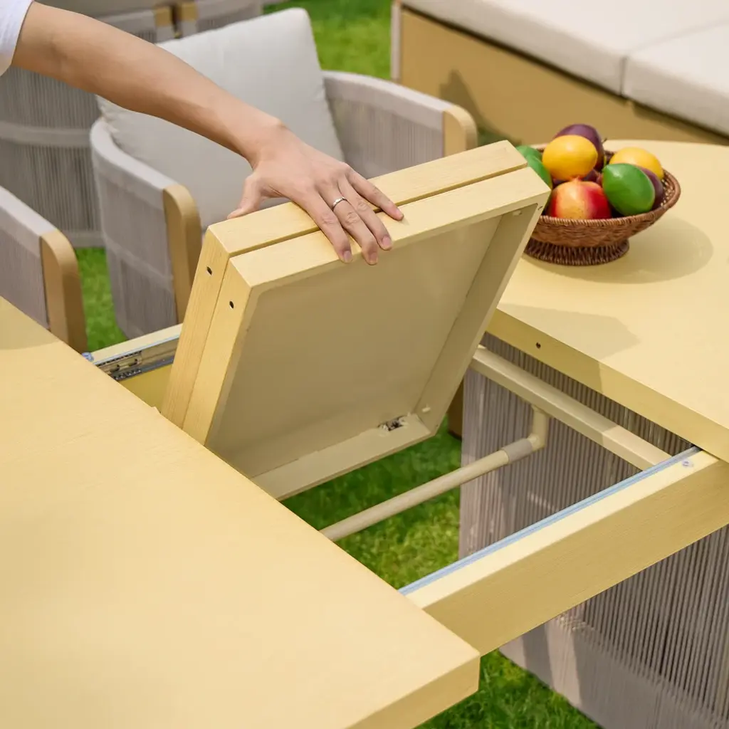 This 7-piece farmhouse style aluminum outdoor dining set offers both functionality and style, featuring an extendable tabletop and six woven armchairs. Perfect for accommodating larger gatherings, the set is designed with durable, weather-resistant materials, making it ideal for year-round outdoor dining. Its sleek aluminum frame and comfortable woven chairs bring a modern touch to any patio, deck, or garden.