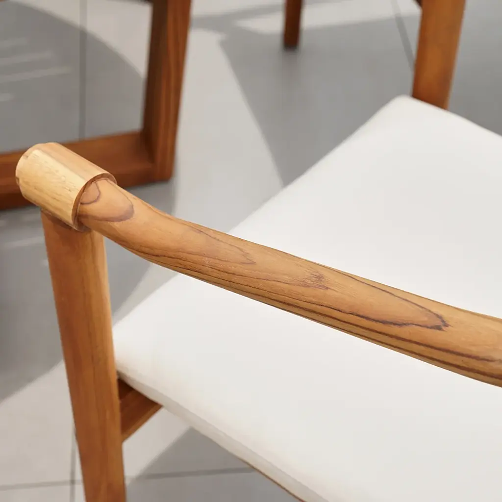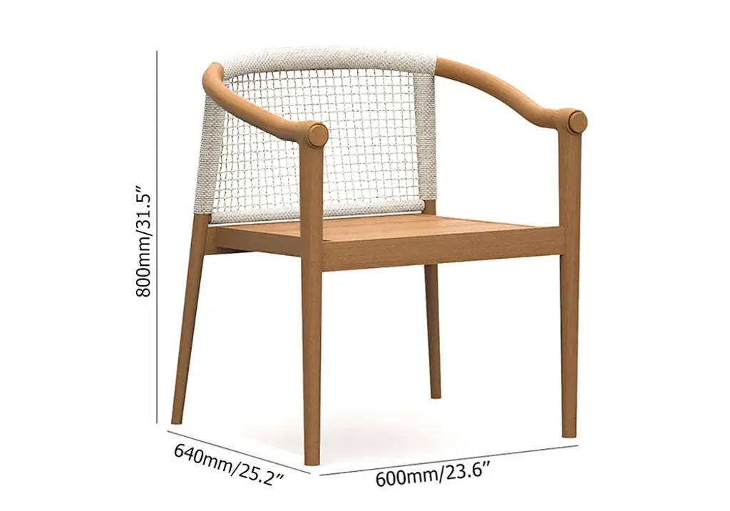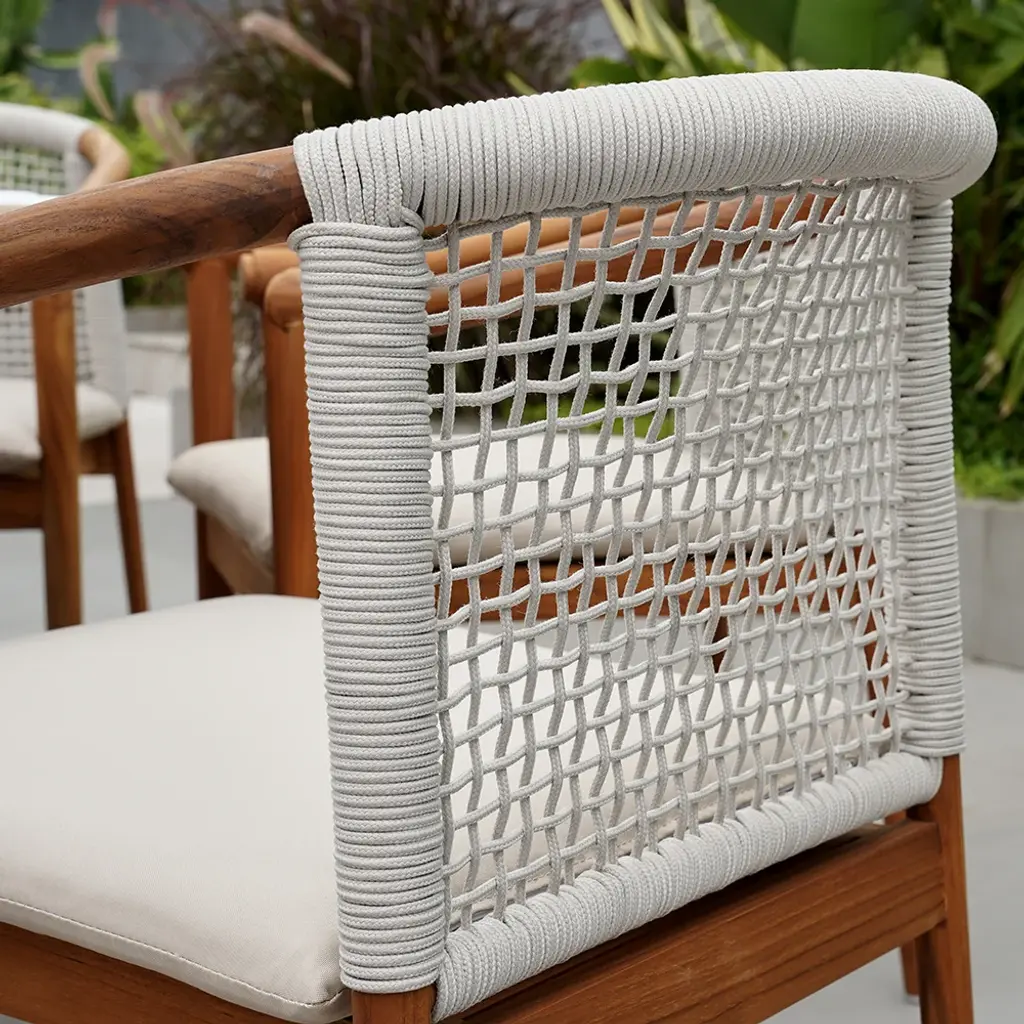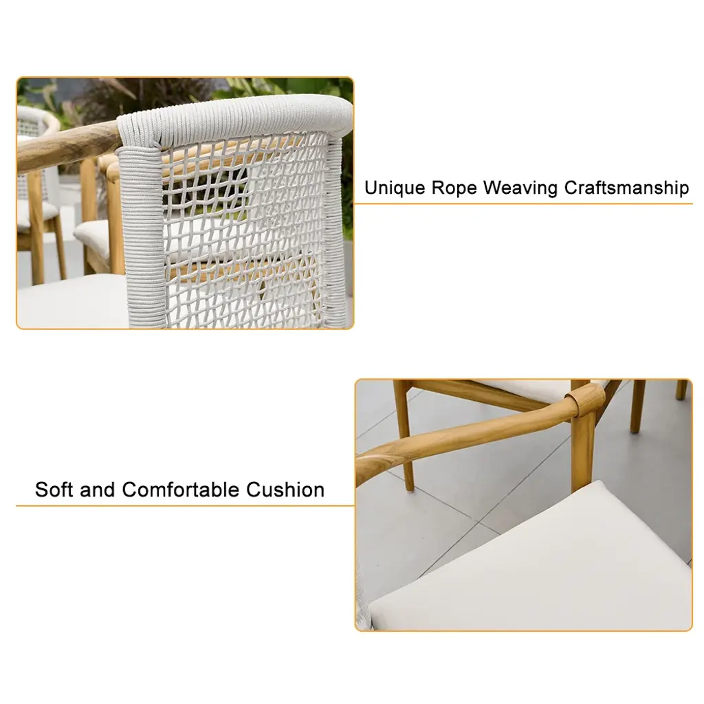Deck out your porch, patio, or yard with this seven-piece dining set, complete with one round table, and six sling-seat armchairs. Crafted with a solid teak frame, the chair uses classy fabric to resist water and weather. The seat part is matched with a natural-textured woven rope and comfortable cushion, which adds features to the whole product and makes it cozy to use. The dining set allows guests to have a better dining experience. (Warm Reminder: Due to different light environments, the color rendering will also be different. In addition, this set of products is made of purely natural wood, and there will be some differences in the wood color of each batch.)