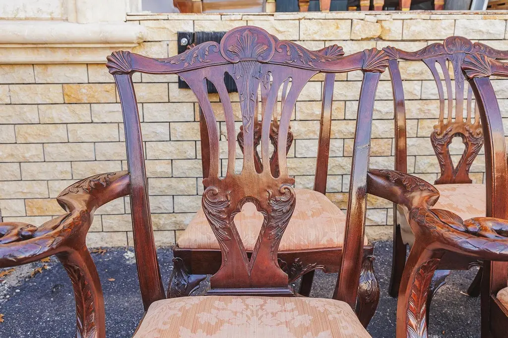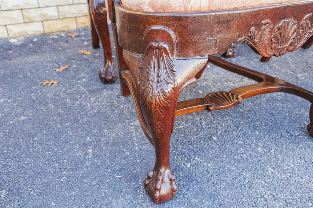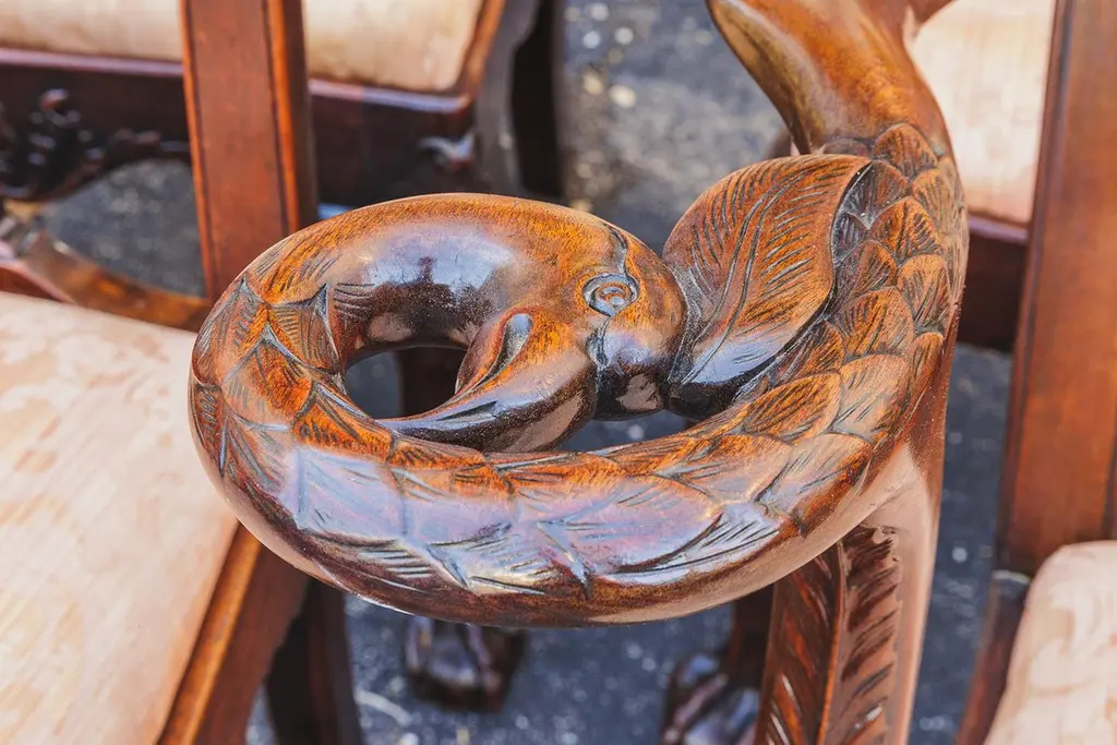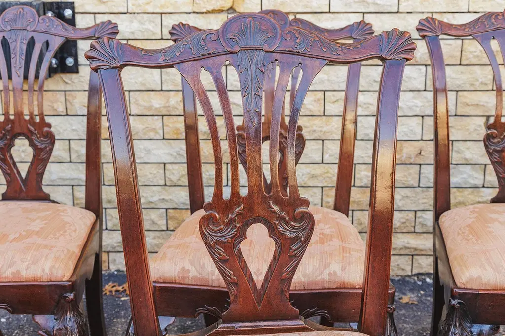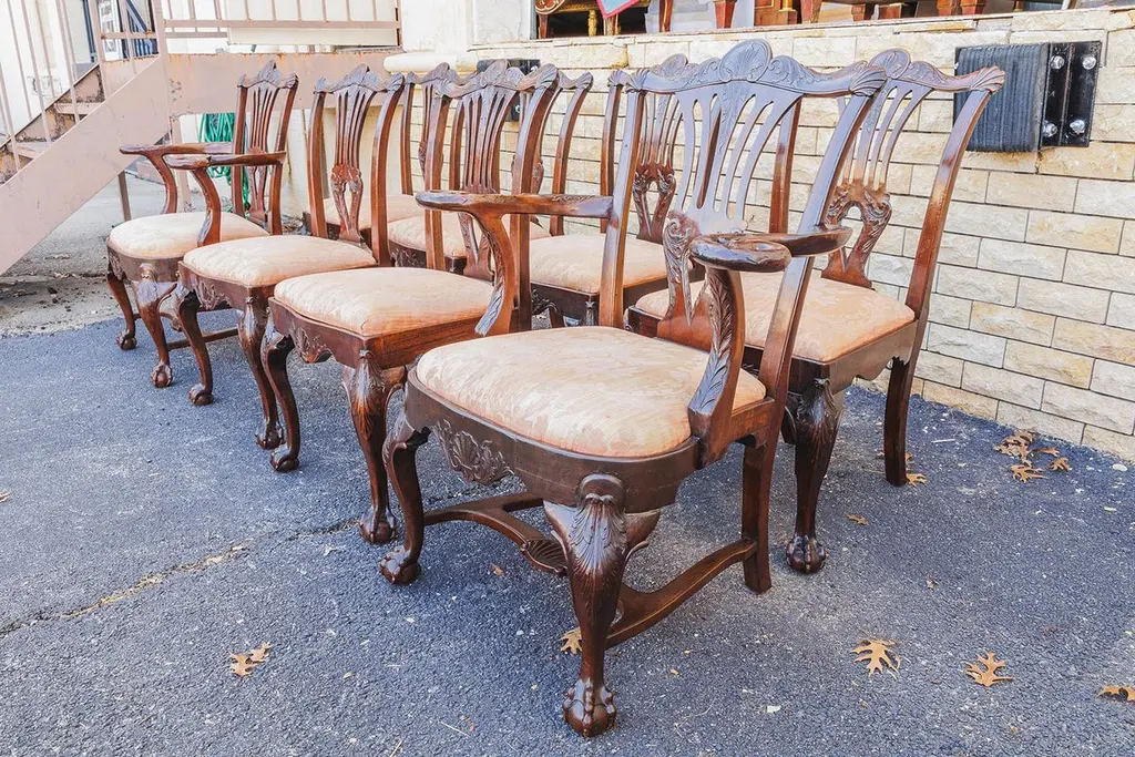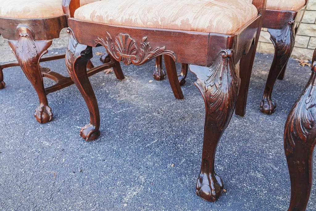 A fine set of 19th c 8 Irish Chippendale finely carved dining chairs. Comprising of 2 heavily carved arms and 6 sides. These chairs are heavily carved with fine eagle heads on the arm chairs and ball and claw feet. The butler family produced fine Irish carved designs.