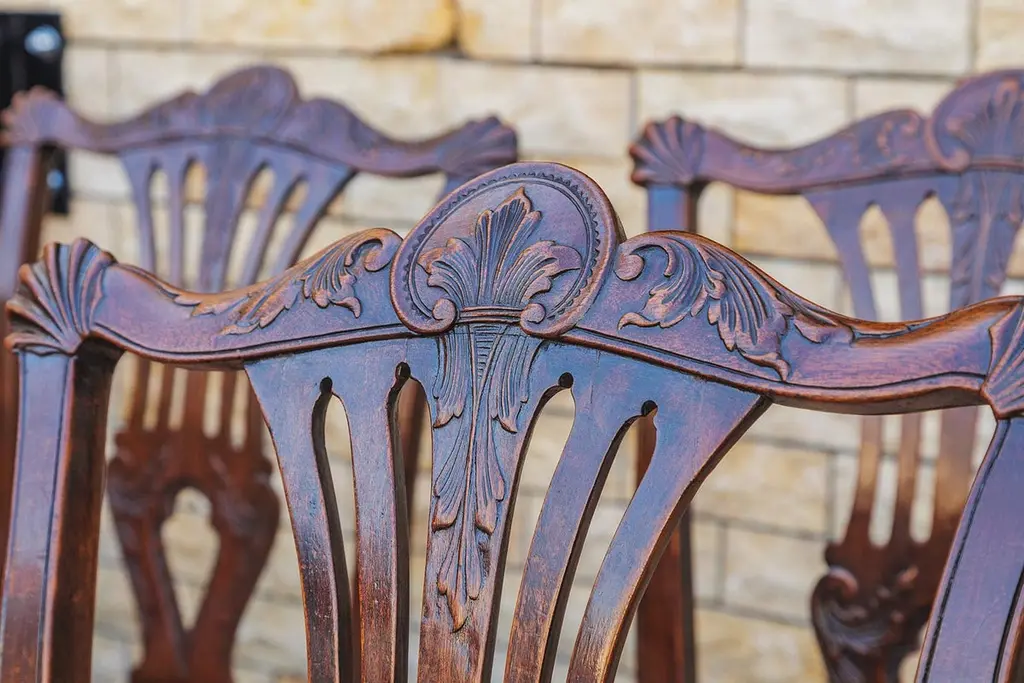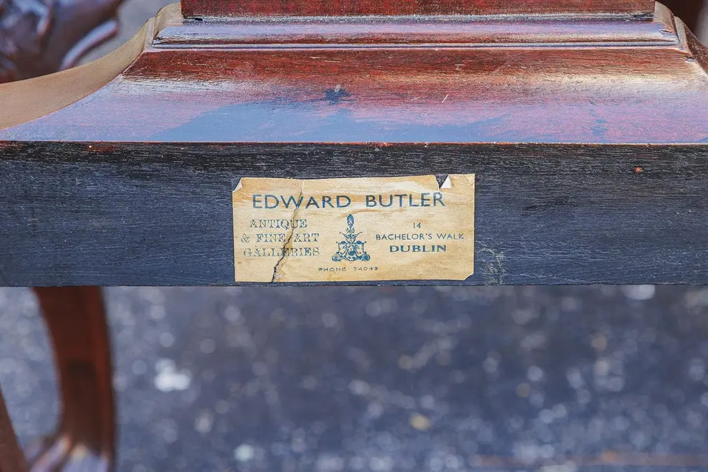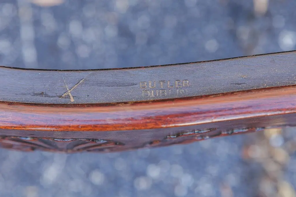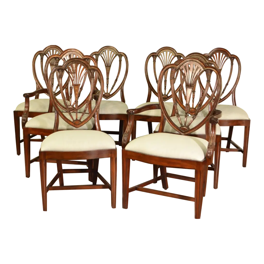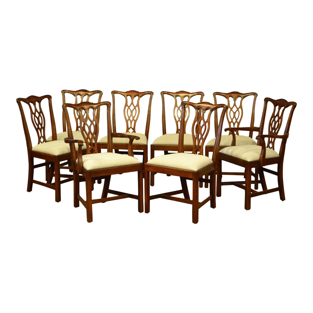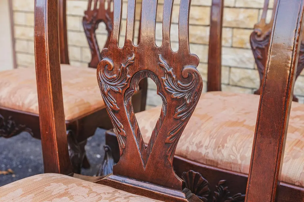 A fine set of 19th c 8 Irish Chippendale finely carved dining chairs. Comprising of 2 heavily carved arms and 6 sides. These chairs are heavily carved with fine eagle heads on the arm chairs and ball and claw feet. The butler family produced fine Irish carved designs.