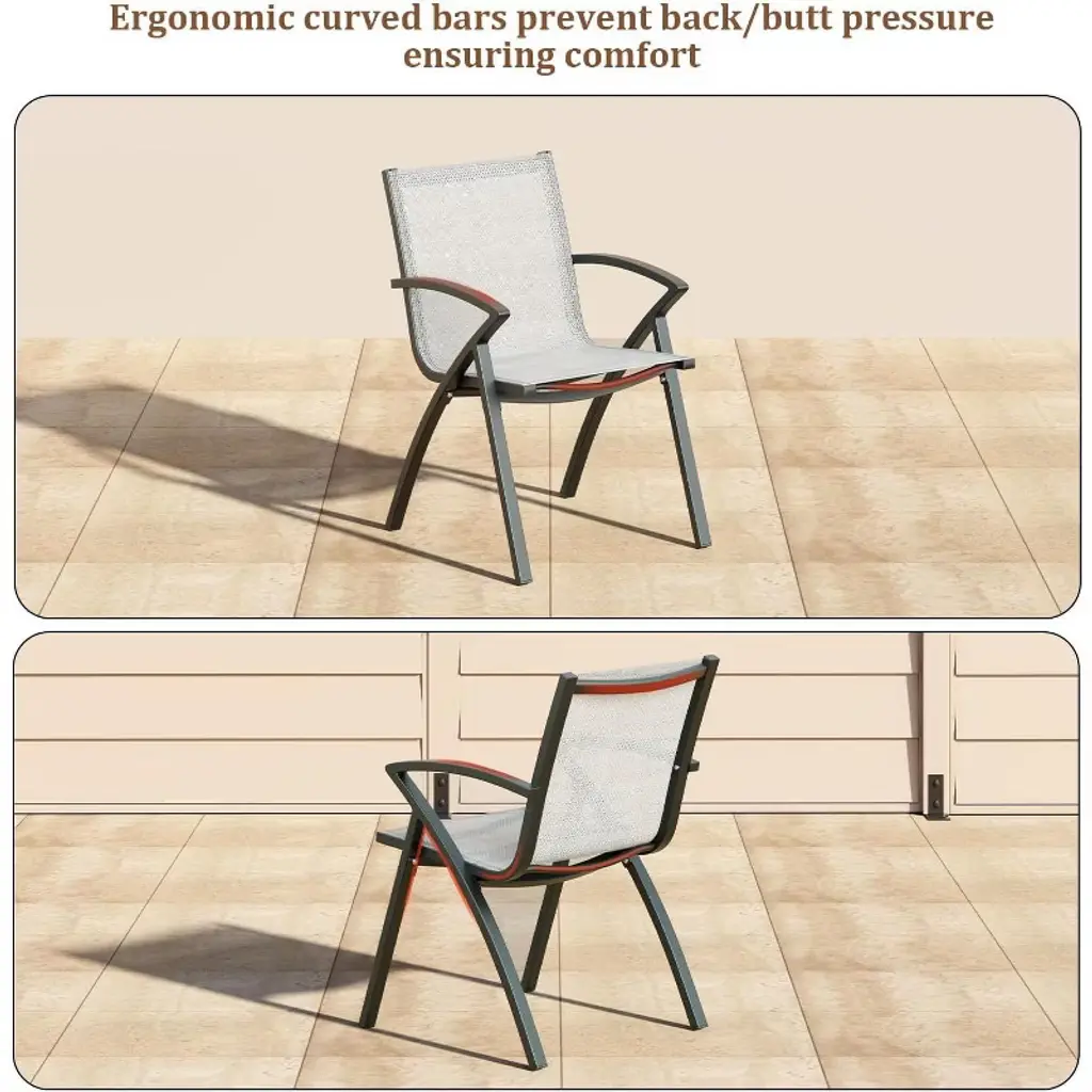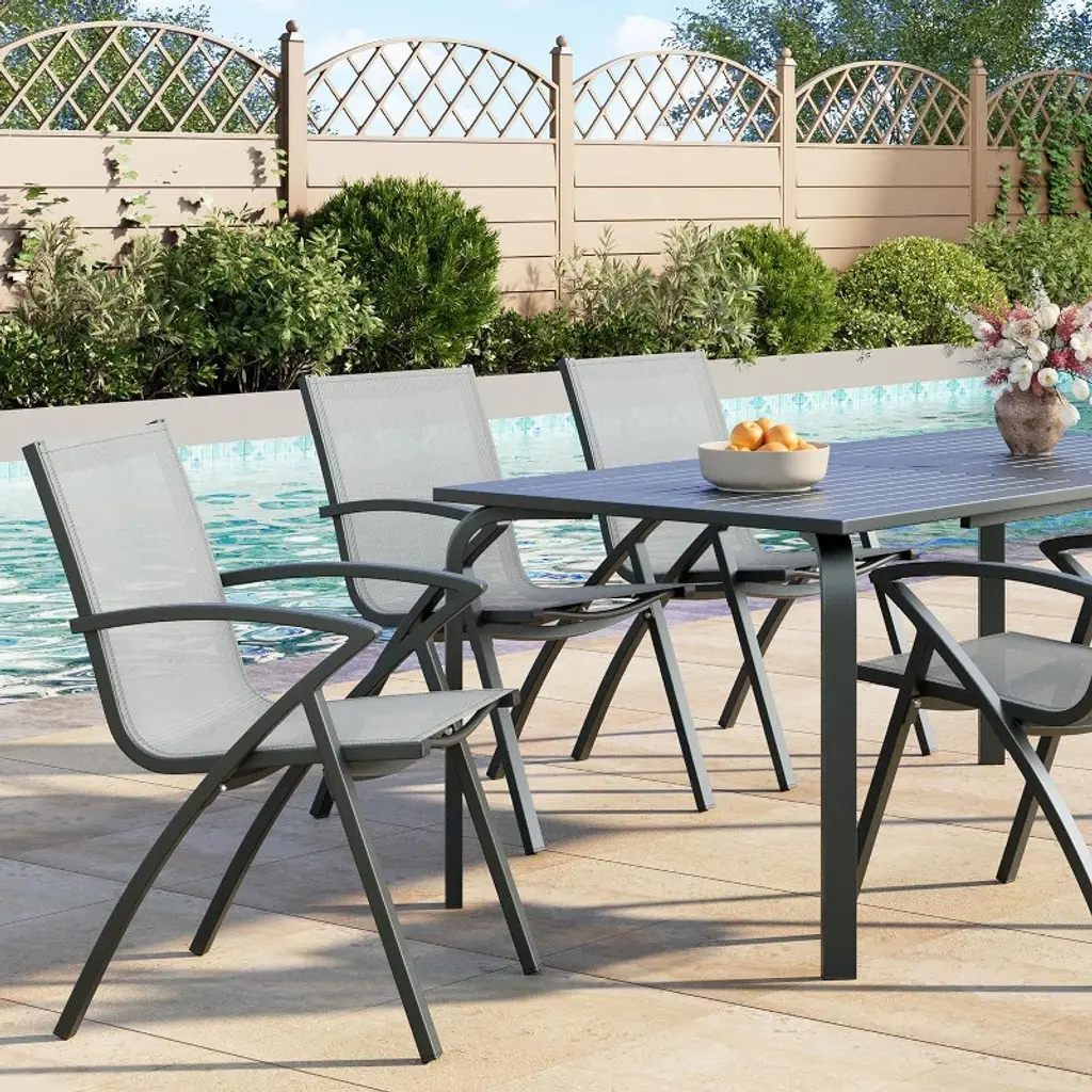 The Acekool 6-Piece Modern Aluminum Outdoor Dining Chairs Set balances style, comfort, and practicality for any outdoor environment. Crafted from weather-resistant aluminum alloy and featuring quick-dry Textilene fabric, these chairs deliver lasting performance and easy upkeep. Their ergonomic design supports natural posture with a carefully angled backrest and lumbar curves, making them comfortable for long periods of use. Ideal for patios, pool decks, restaurants, or backyard gatherings, this set offers lightweight portability and compact storage with stackable frames that save space when not in use. The breathable fabric keeps seats cool under the sun, while stain-resistant surfaces simplify cleaning. This combination of features makes the set well-suited for everyday outdoor living or commercial settings. With generous armrests and a seating capacity of up to 300 lbs, these chairs fit seamlessly with standard patio tables and enhance your outdoor dining experience with a modern gray finish and thoughtful design. Dimensions: Chair Size: 21.6"W x 23.6"D x 34.6"H Seat Height: 18" Weight: 18 lbs each Weight Capacity: 300 lbs per chair Frame: Corrosion-resistant aluminum alloy Fabric: Triple-layer quick-dry Textilene mesh Set Includes: 6 ergonomic outdoor dining chairs