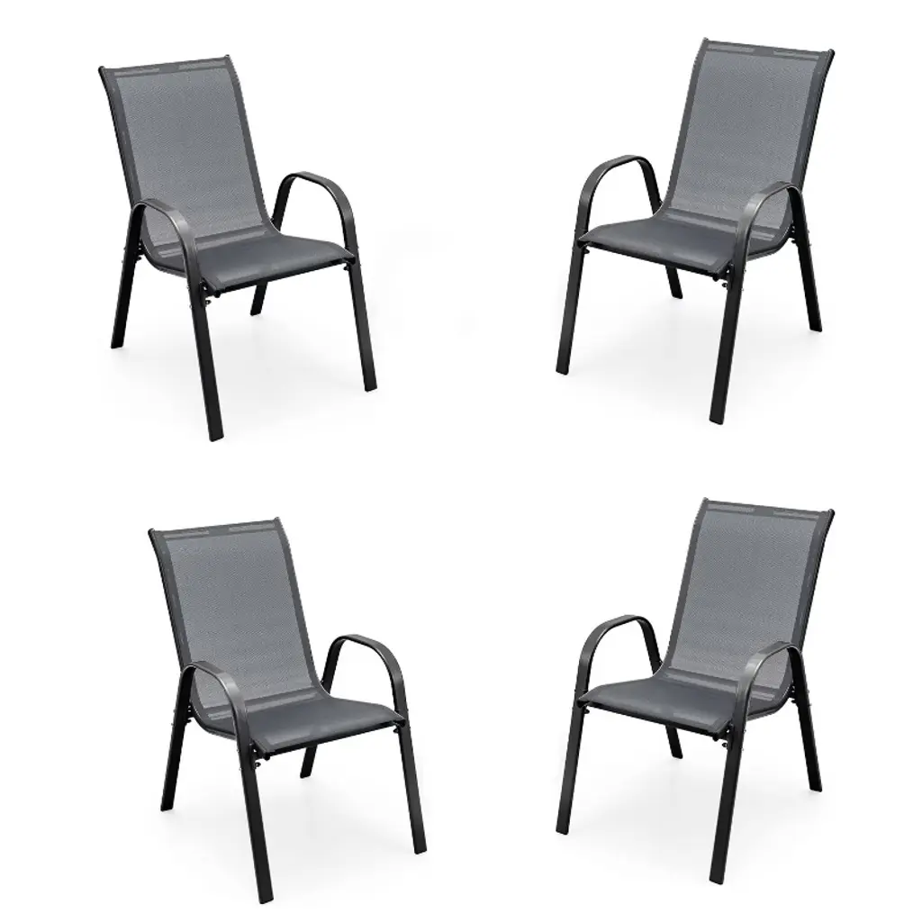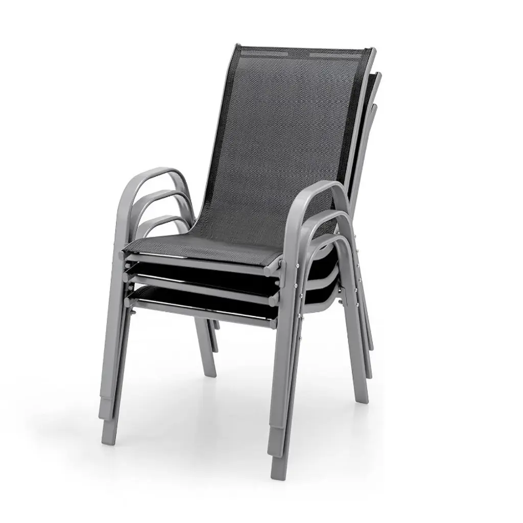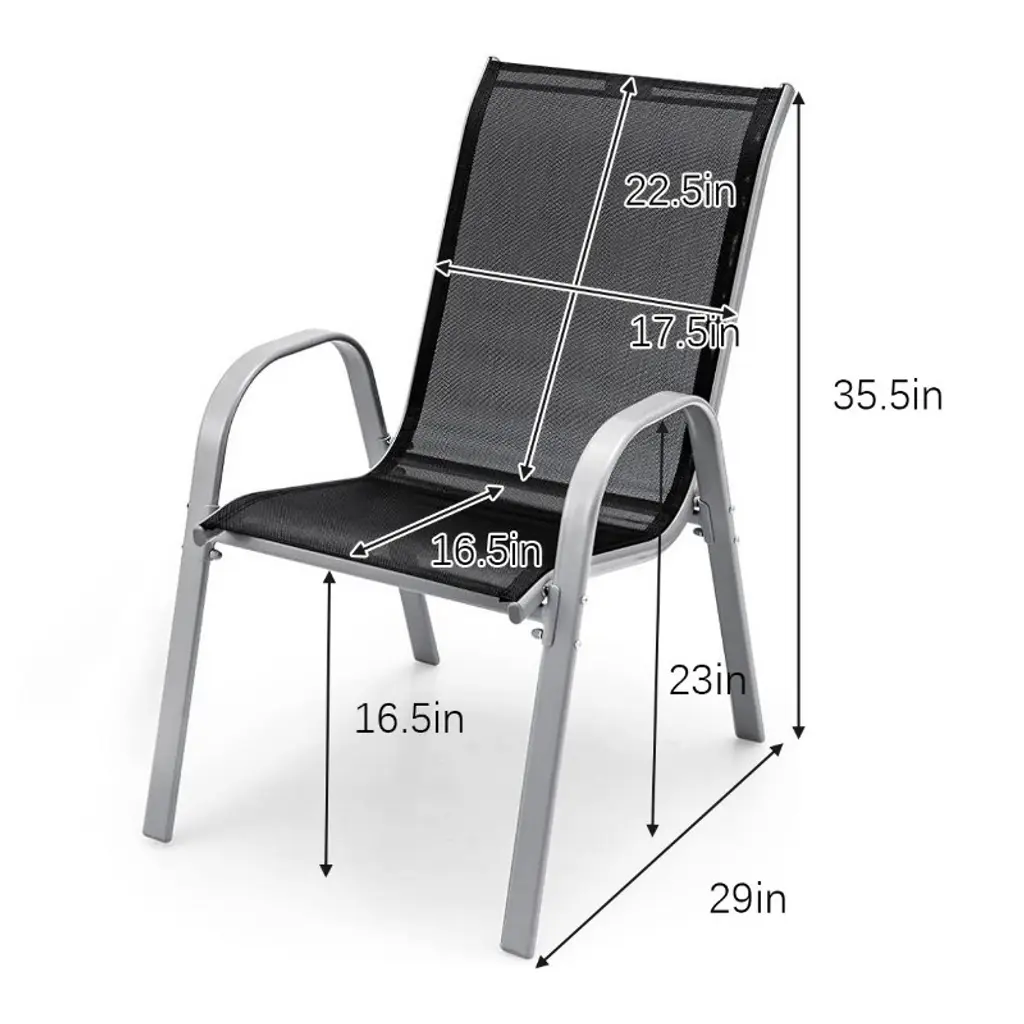These 4 pieces patio dining chairs can be stacked in a vertical shape that is designed for space-saving. And easy to move here to there since lightweight design.With incline and high back and curved armrests, this outdoor dining chairs support your body well and relax your arms. And seat area is wide enough for most people.The selected fabric is breathable, quick-drying, wear-resistant and durable, which will withstand outdoor conditions better. And the frame is made of sturdy and rustproof steel for strong loading capacity (330 lbs for each chair).