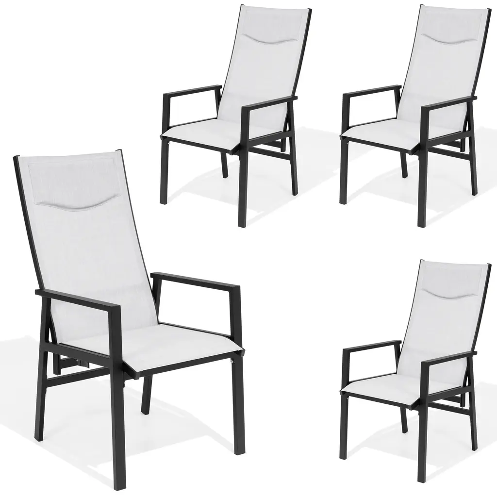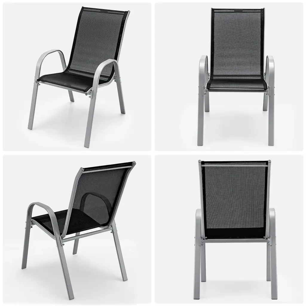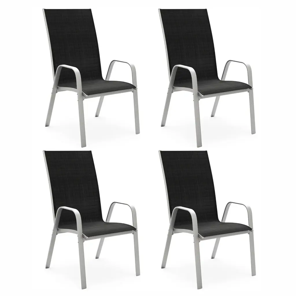 These 4 pieces patio dining chairs can be stacked in a vertical shape that is designed for space-saving. And easy to move here to there since lightweight design.With incline and high back and curved armrests, this outdoor dining chairs support your body well and relax your arms. And seat area is wide enough for most people.The selected fabric is breathable, quick-drying, wear-resistant and durable, which will withstand outdoor conditions better. And the frame is made of sturdy and rustproof steel for strong loading capacity (330 lbs for each chair).