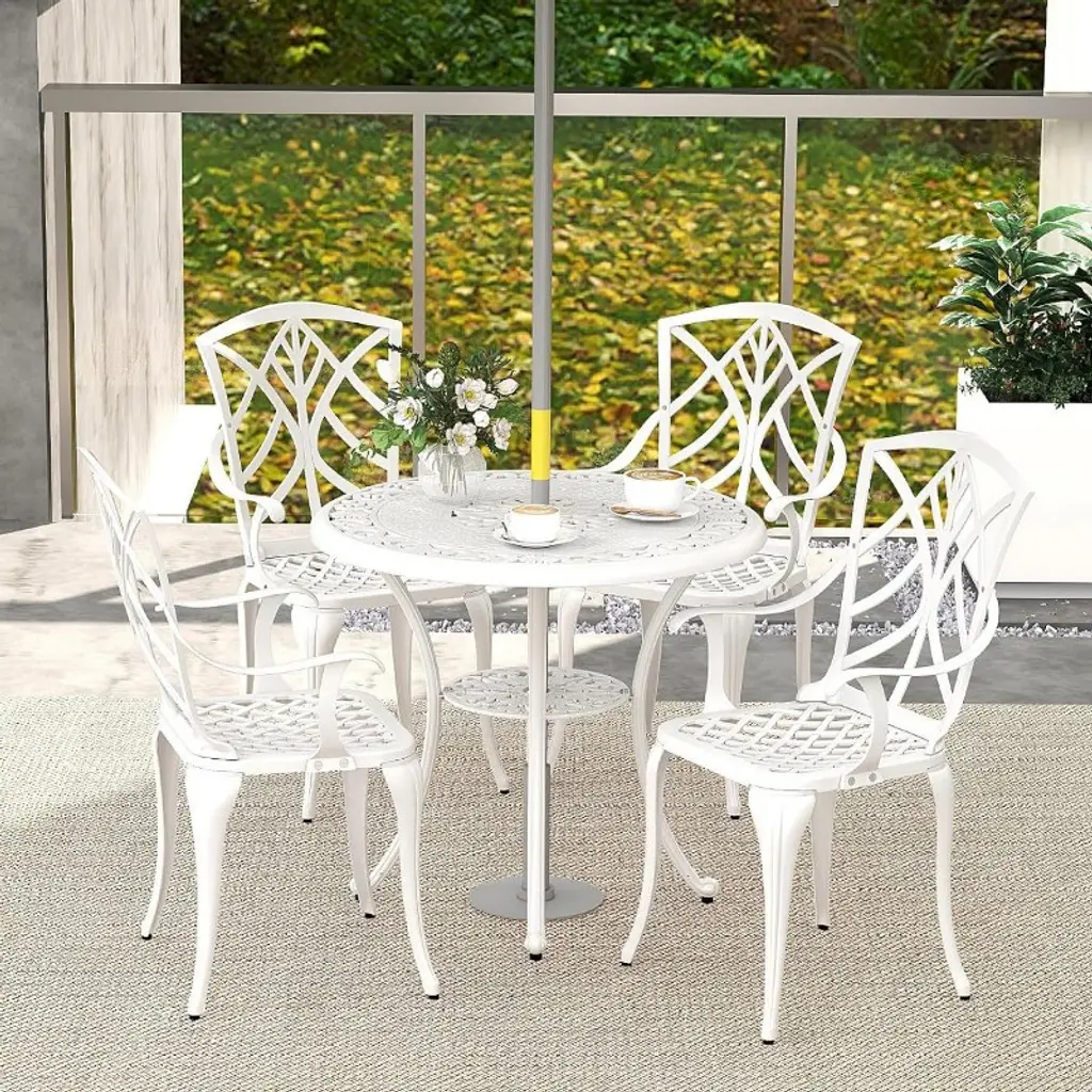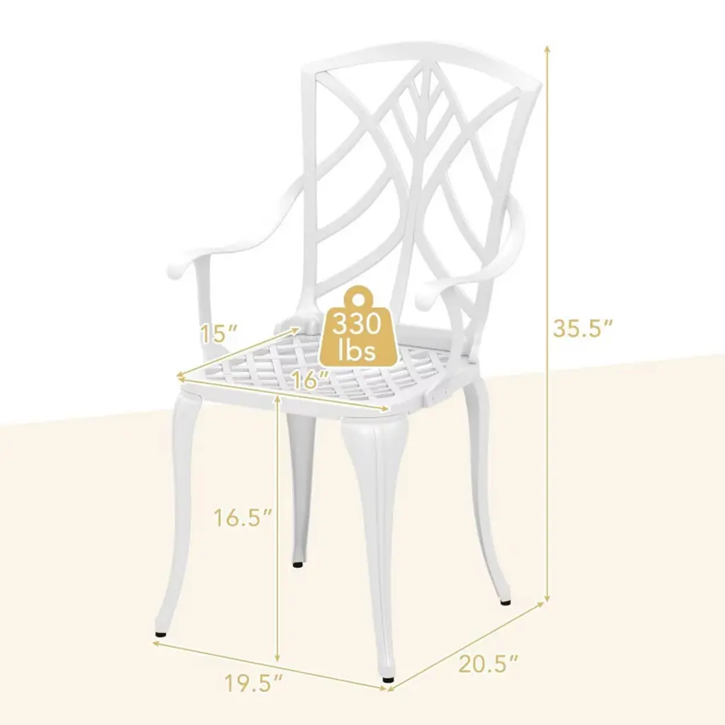 Crafted from high-quality, rust-resistant cast aluminum and adorned with exquisite decorative patterns, these patio dining chairs promise both style and longevity. Enjoy unparalleled comfort with ergonomically designed armrests and spacious seating, while adjustable foot pads ensure stability on uneven terrains. These low-maintenance outside chairs require just a simple wipe-down to keep them looking new, making them the perfect choice for any setting, from garden soirees to peaceful porch retreats.