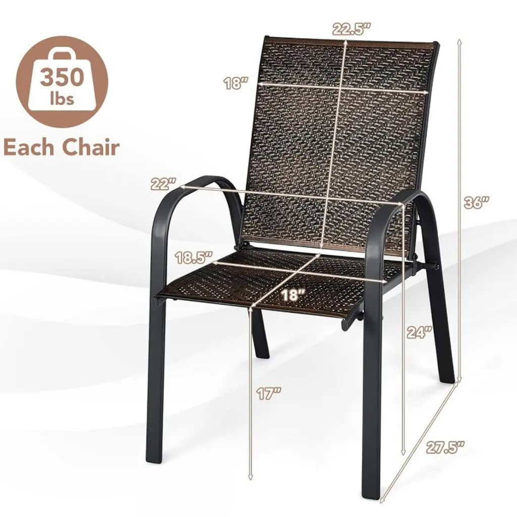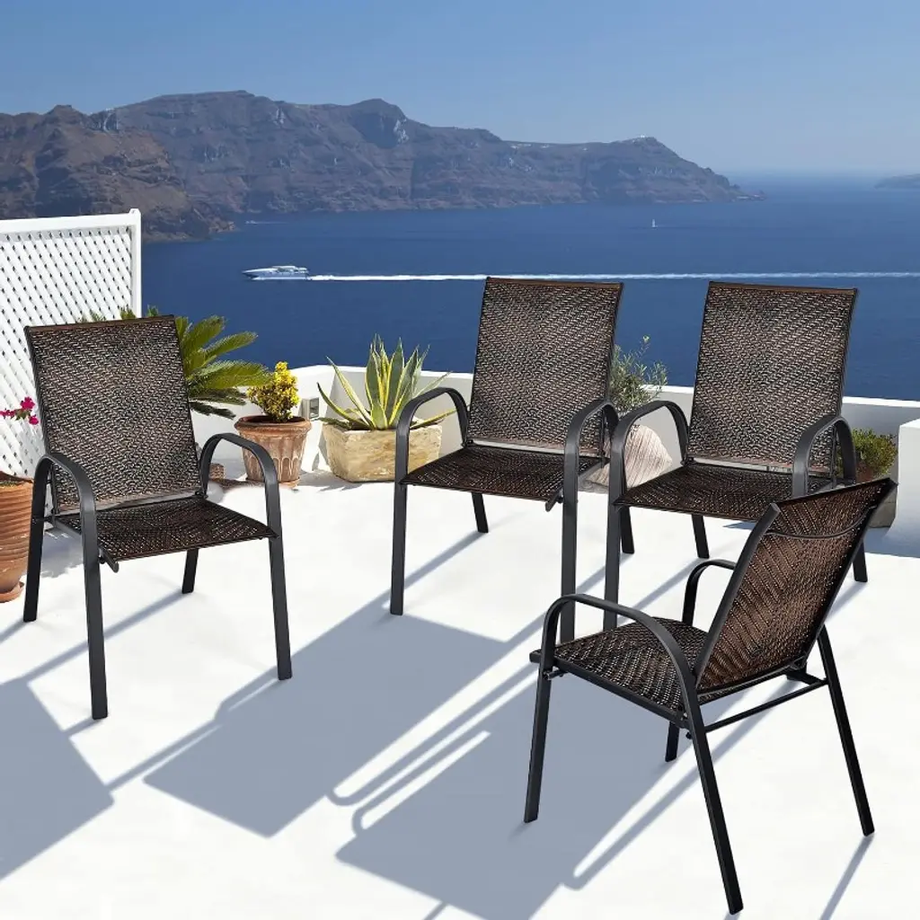 Combining curved backrests, cozy armrests and deep seats as one, these ergonomic outdoor armchairs fit your body curve perfectly to bring ultimate coziness. Therefore, you can use these comfortable chairs to entertain your guests, always ready for your next gatherings anytime, anywhere.To maximize your outdoor space, these patio dining chairs can be stacked together which greatly saves your outdoor space and make movement and storage more convenient. Please do not stack more than 3 chairs to prevent them from accidentally falling.