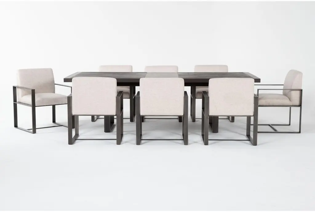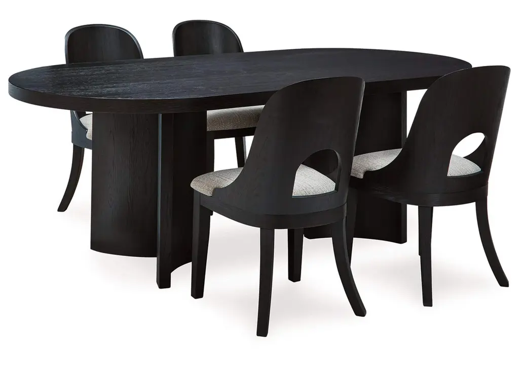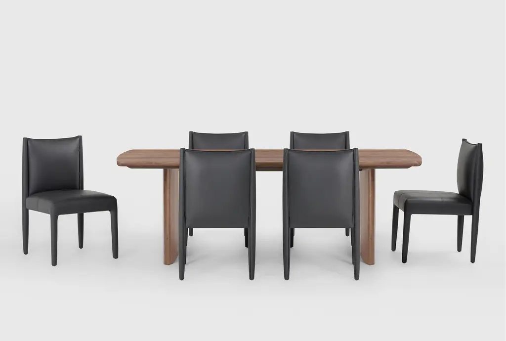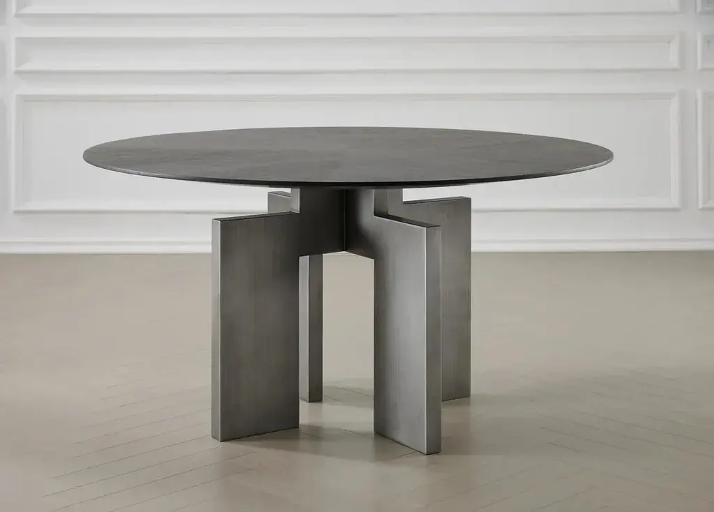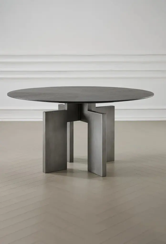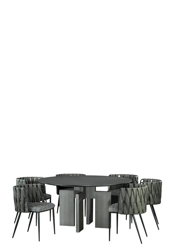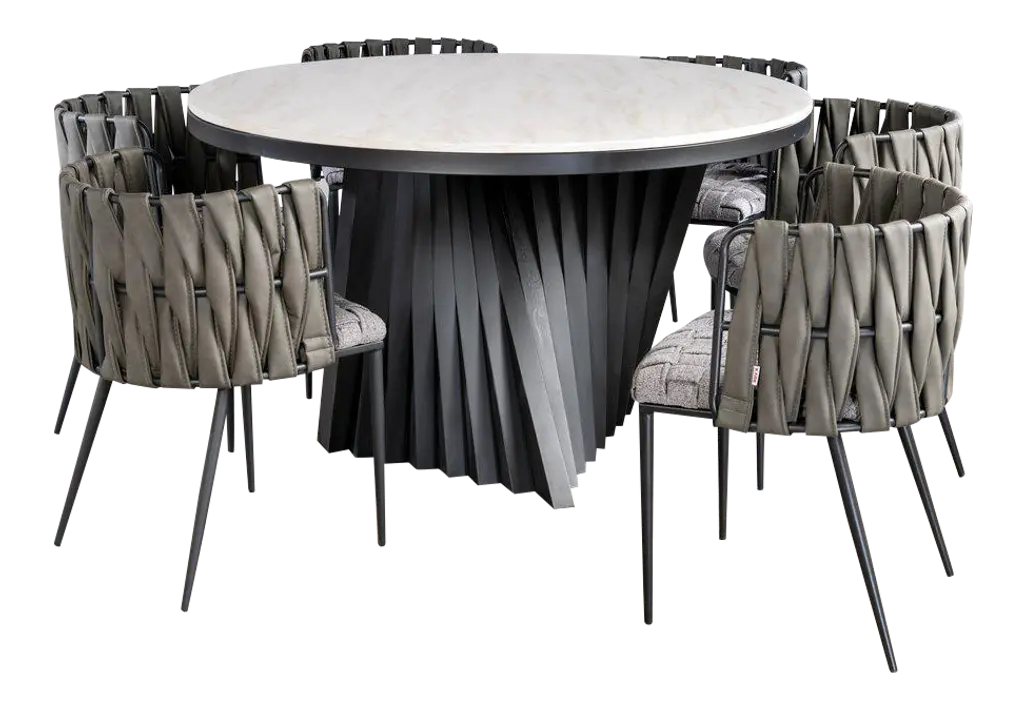 Indulge in artful dining with the Adonis Round Dining Table Set for 6. Made with wood veneer top and iron powder-coated base, this sculptural masterpiece table set adds a touch of elegance to any space. Embrace your inner artist and elevate your dining experience with this bold geometric dining table set with 6 gray dining chairs.