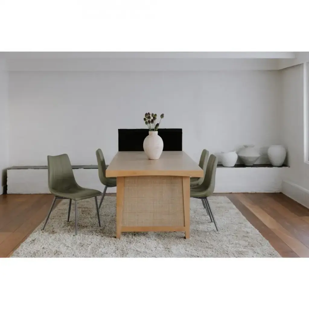 A new take on contemporary dining. The Alibi dining chair’s sleek modern aesthetic features striking vertical accent stitching, adding subtle detail to its simple and elegant design. An easy-to-clean, soft vegan leather seat is perfectly shaped for comfort, so guests and hosts alike can relax after the digestif is served.