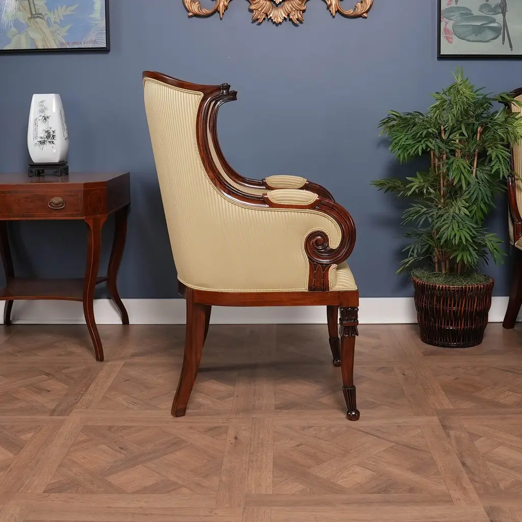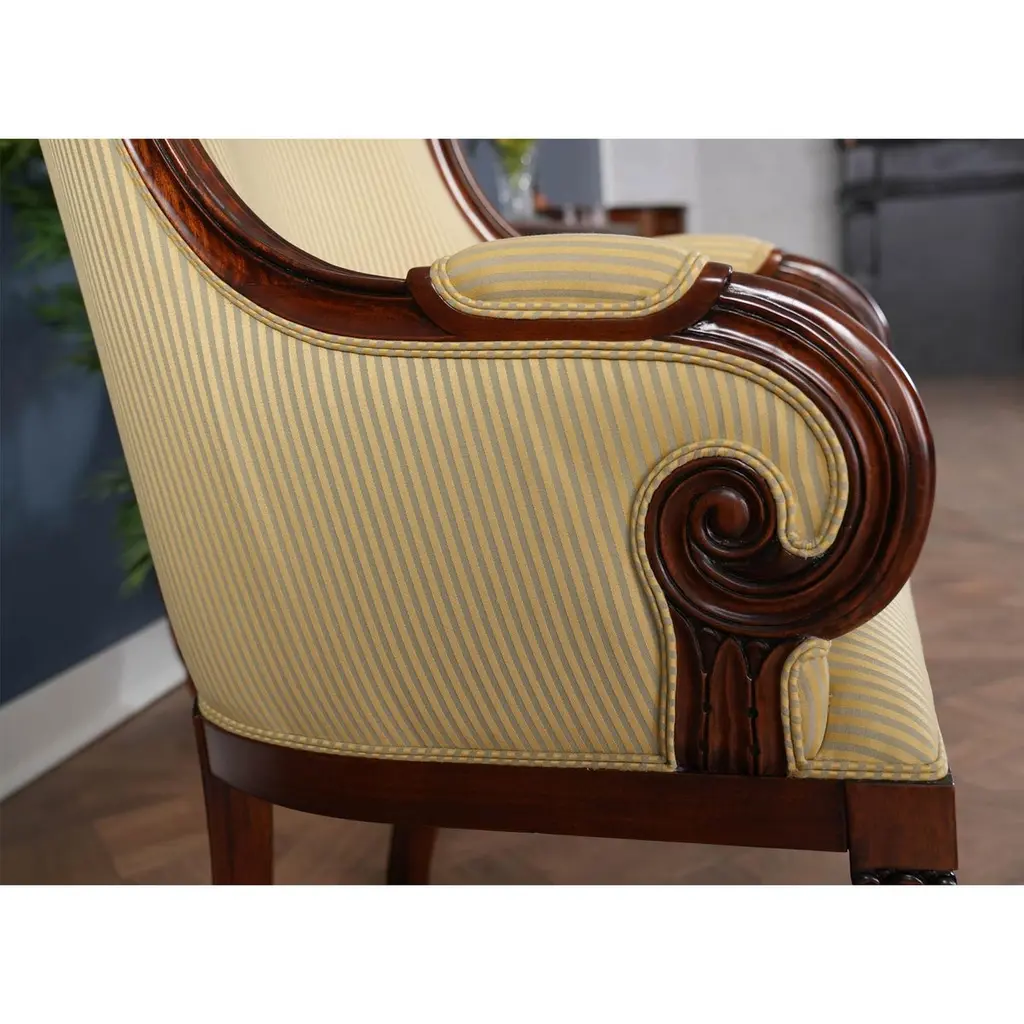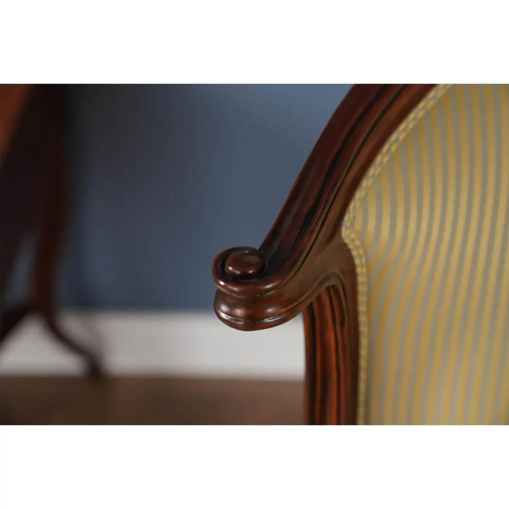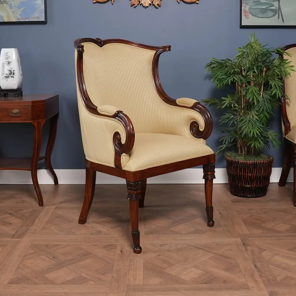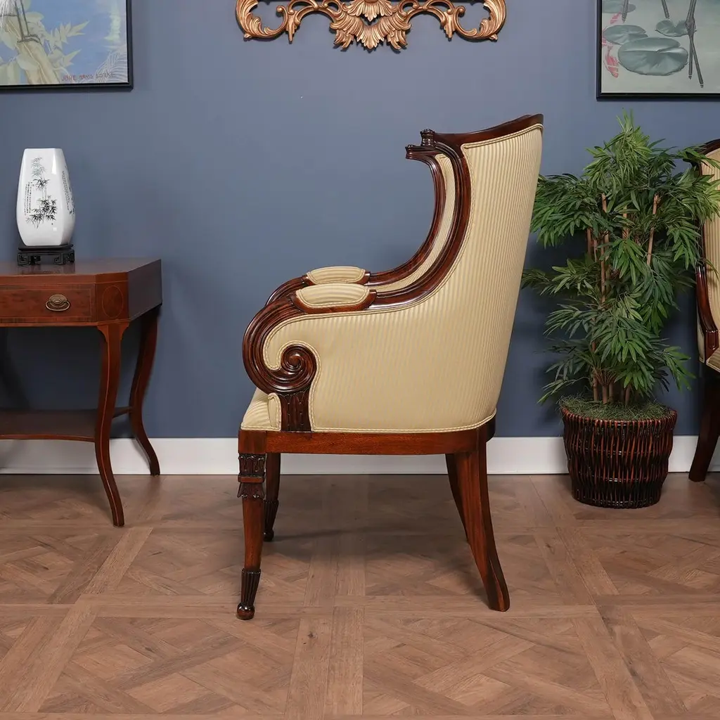 A set of 10 American Upholstered Dining Chairs, the set consisting of two arm chairs and 8 side chairs. Wrap yourself in luxury while at the dining table, with these beautiful Americana. We had so many requests for our traditional fireside chairs to be used in the dining room that we adapted them to fit with this model. Beautifully finished and upholstered these sophisticated, high end designer style set of ten chairs will make any dining room “pop”. Super comfortable and so attractive your guests might not want to leave. Hand crafted from solid mahogany these chairs ship with a beautiful finish and our most popular neutral fabric, ready to use the day they arrive.Arm Height approximately 28.5 inches and seat height approximately 21 inches.Arm Chairs measure 27w x 27d x 44hSide Chairs measure 26w x 26d x 44hSet consists of 2 Arm and 8 Side Chairs.