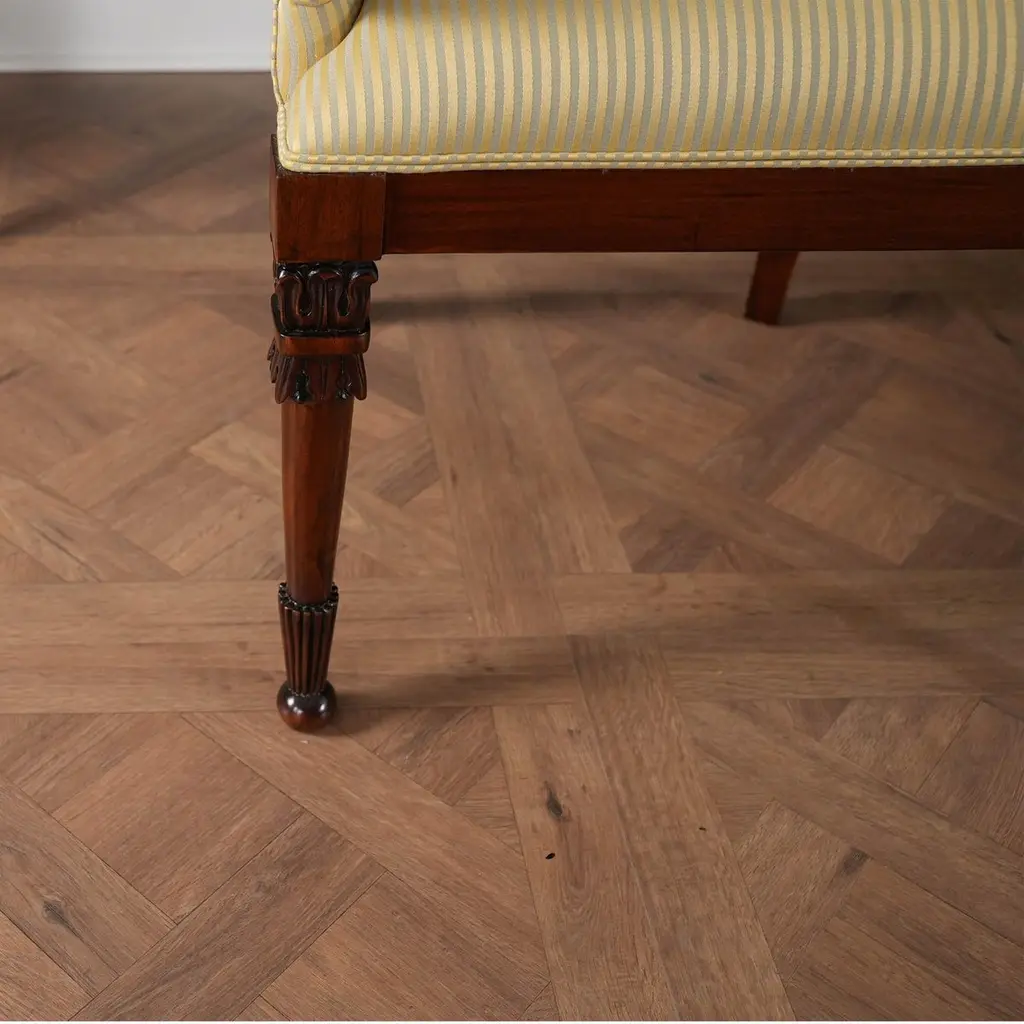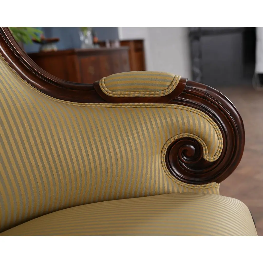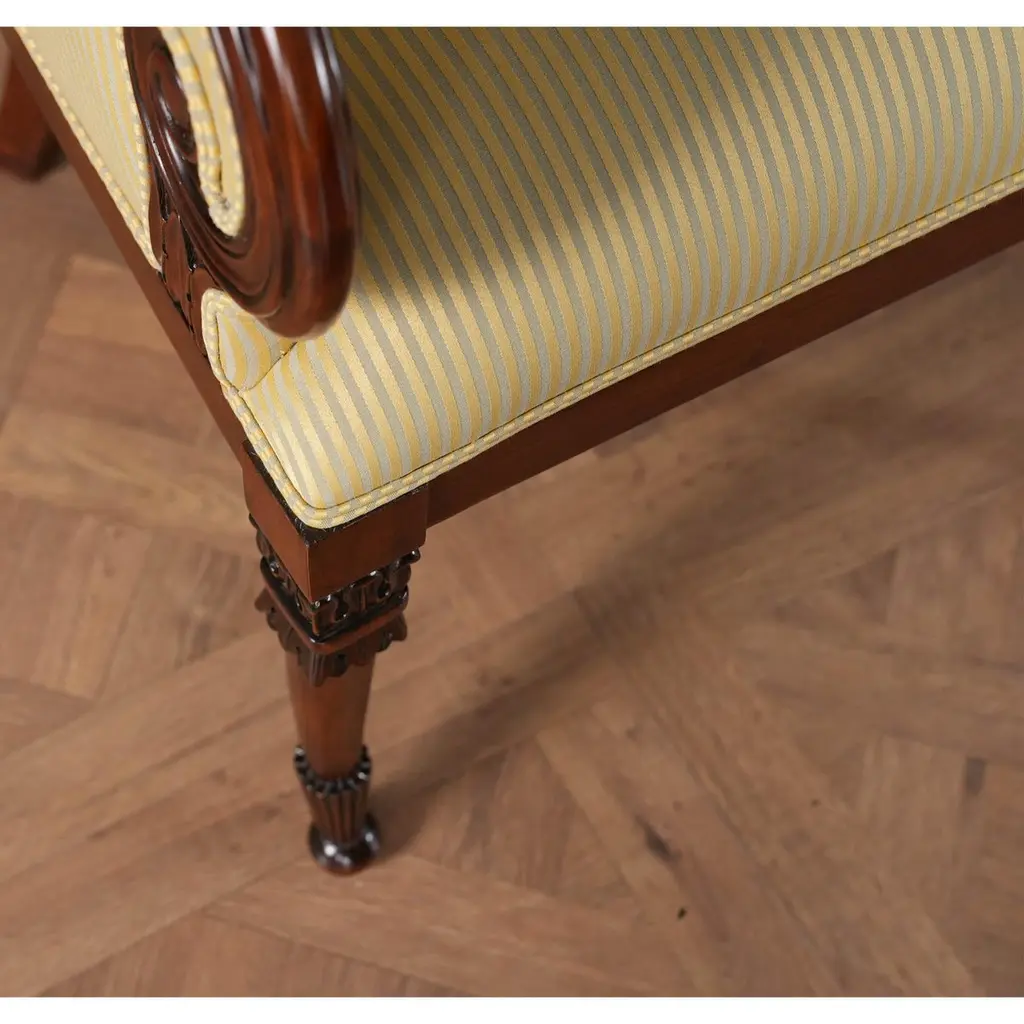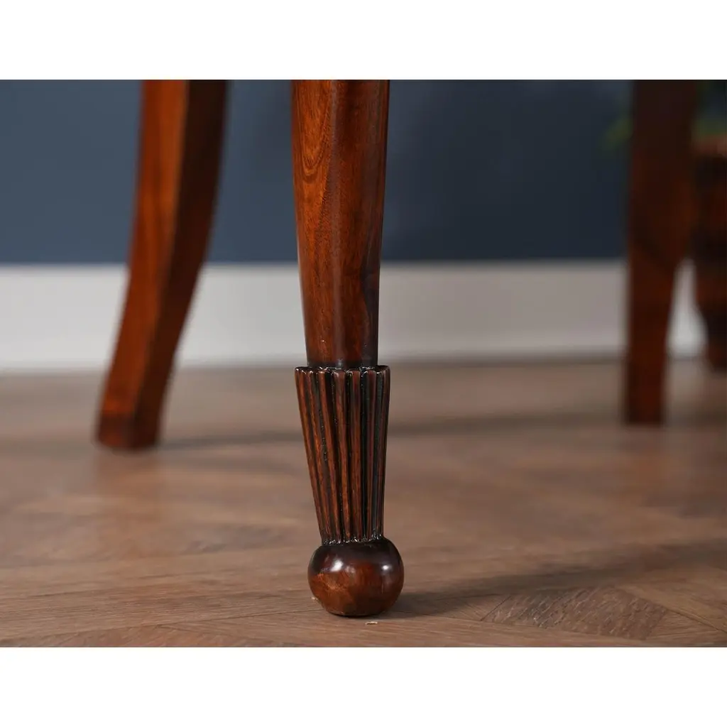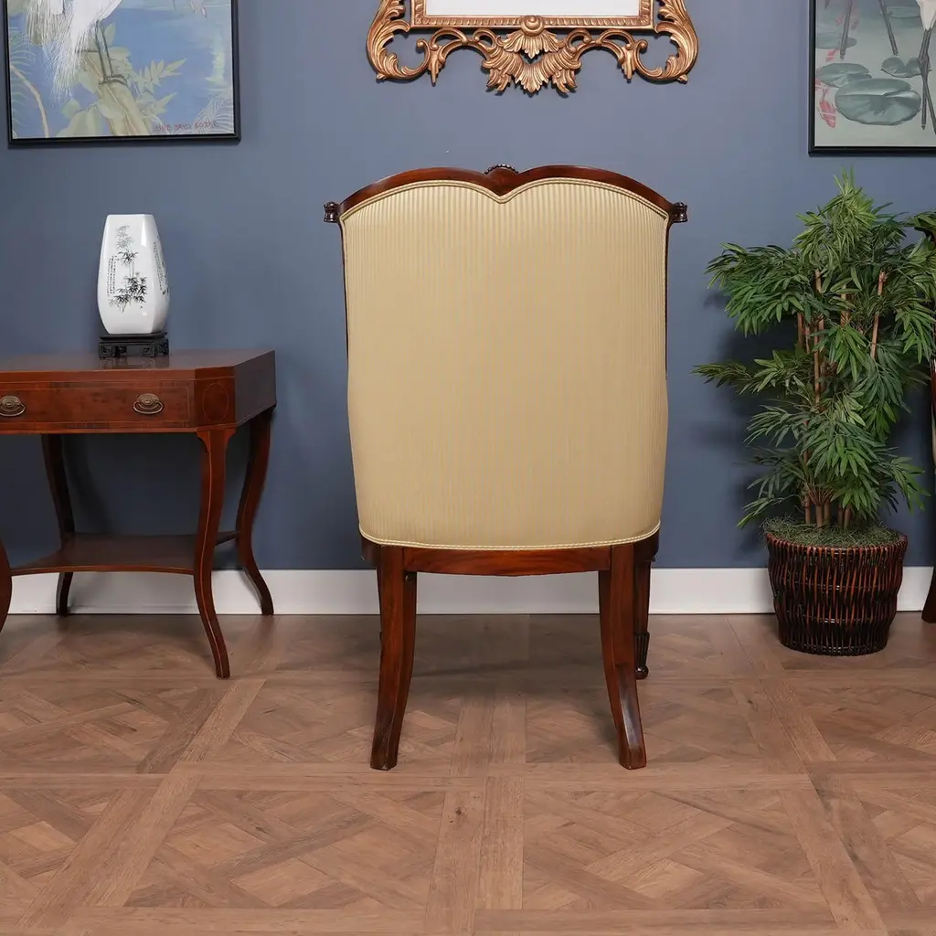 A set of 10 American Upholstered Dining Chairs, the set consisting of two arm chairs and 8 side chairs. Wrap yourself in luxury while at the dining table, with these beautiful Americana. We had so many requests for our traditional fireside chairs to be used in the dining room that we adapted them to fit with this model. Beautifully finished and upholstered these sophisticated, high end designer style set of ten chairs will make any dining room “pop”. Super comfortable and so attractive your guests might not want to leave. Hand crafted from solid mahogany these chairs ship with a beautiful finish and our most popular neutral fabric, ready to use the day they arrive.Arm Height approximately 28.5 inches and seat height approximately 21 inches.Arm Chairs measure 27w x 27d x 44hSide Chairs measure 26w x 26d x 44hSet consists of 2 Arm and 8 Side Chairs.