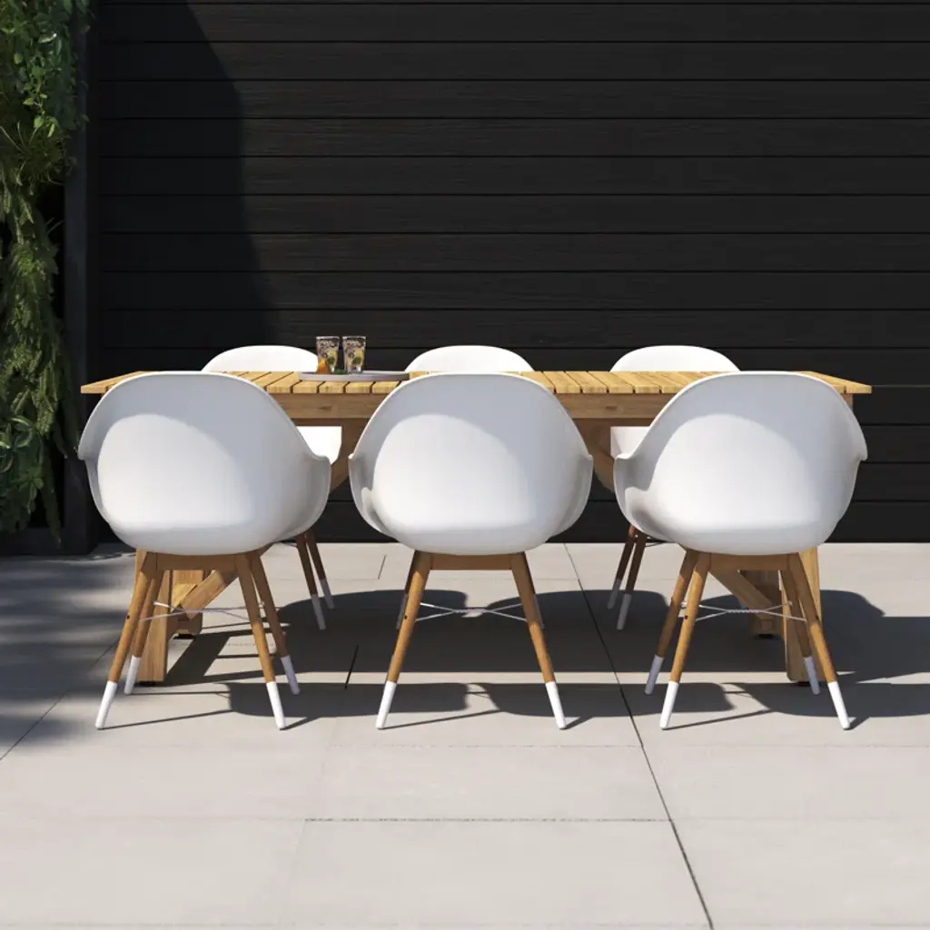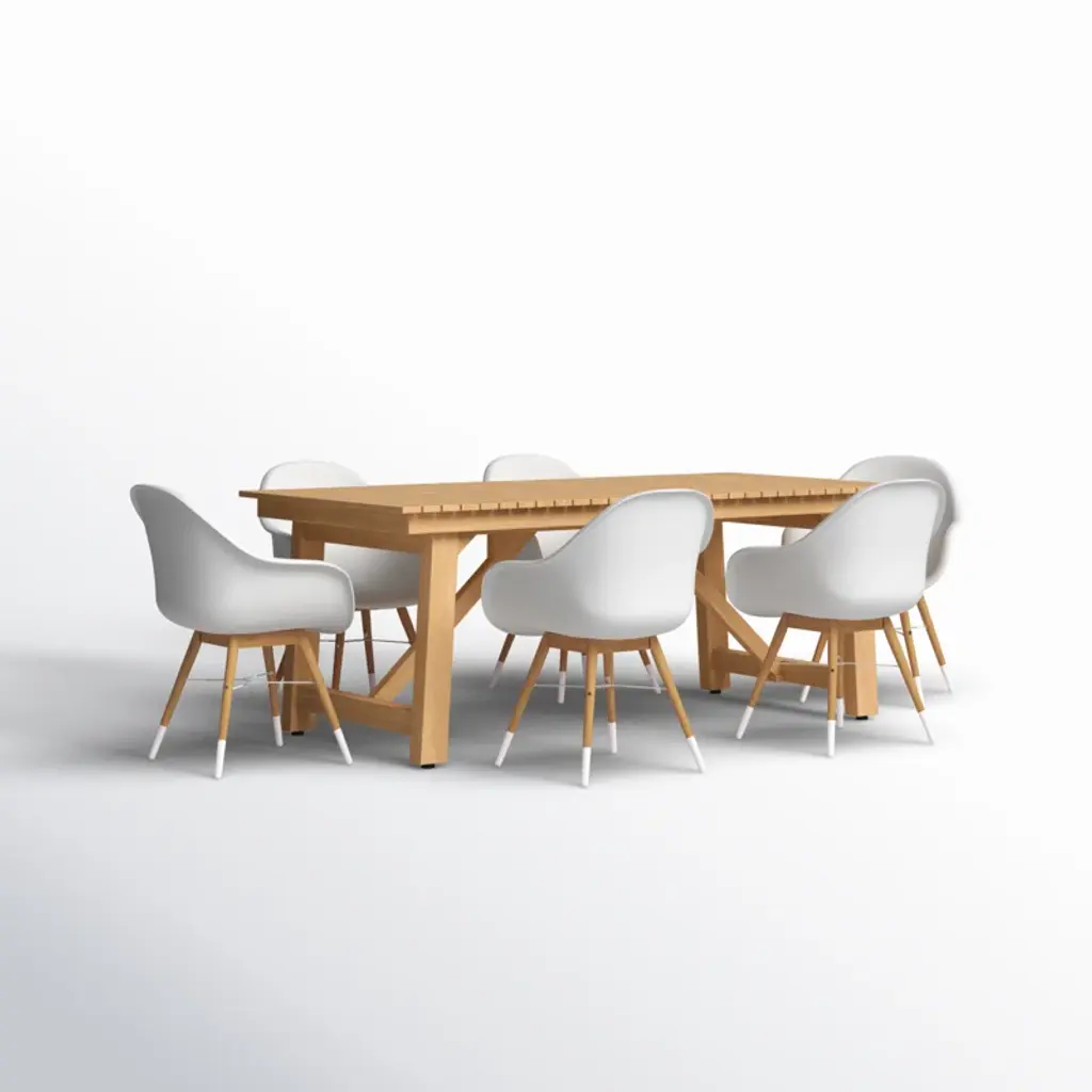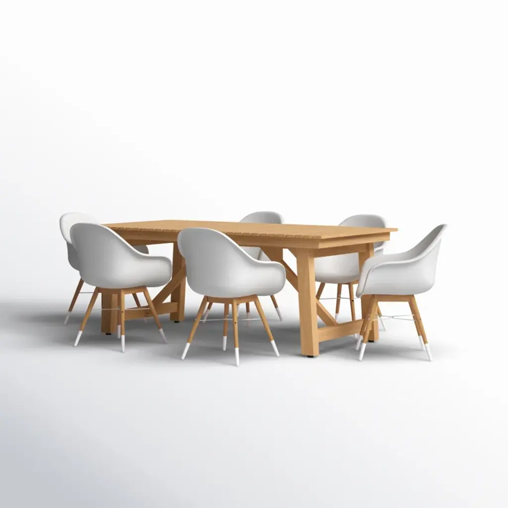 Gather 'round in style. This dining set includes a solid wood table with a rectangular teak top and six bucket armchairs. The chairs feature resin seats and backs, providing comfort and durability. Perfect for hosting outdoor meals with friends and family.