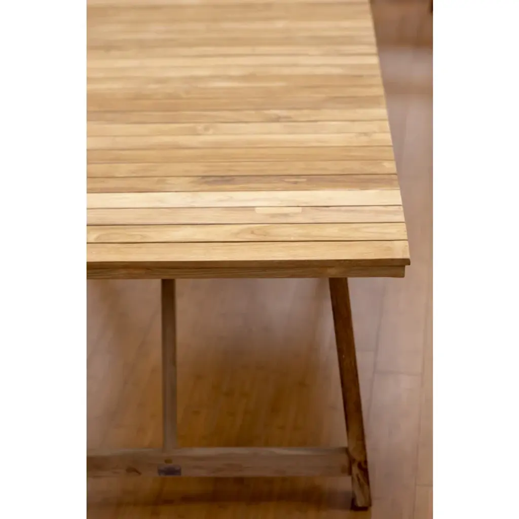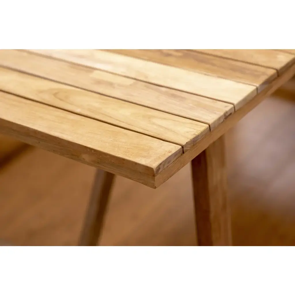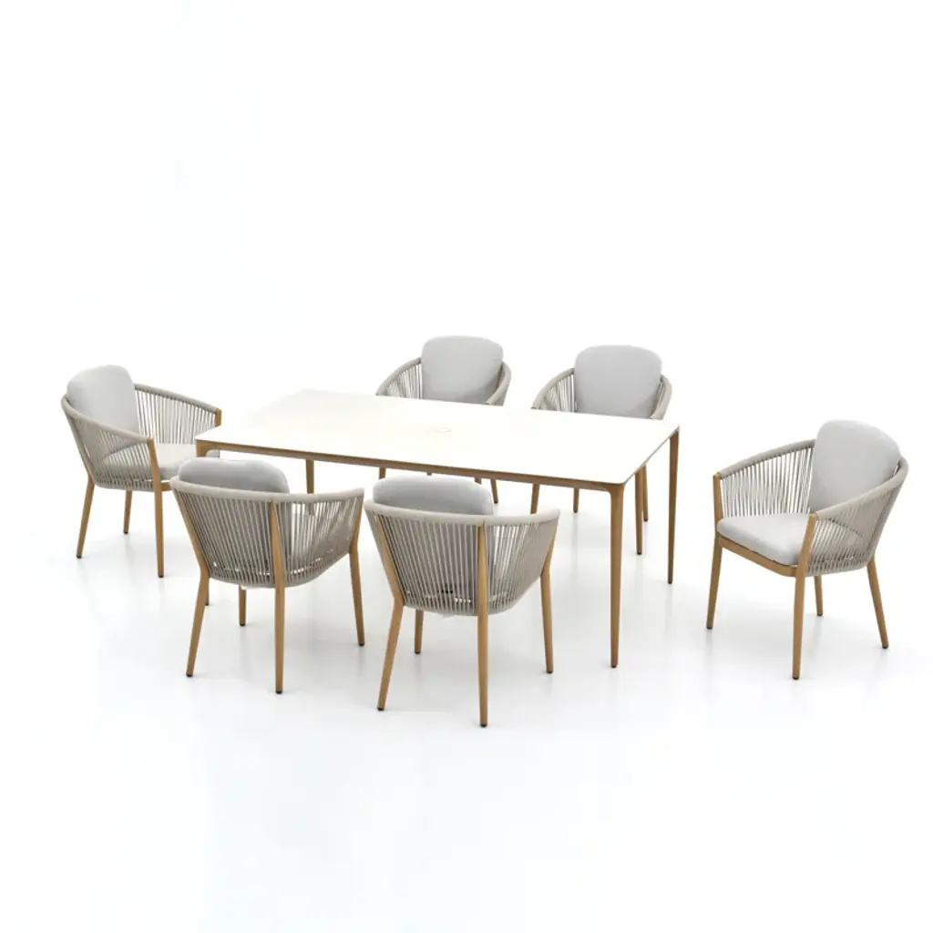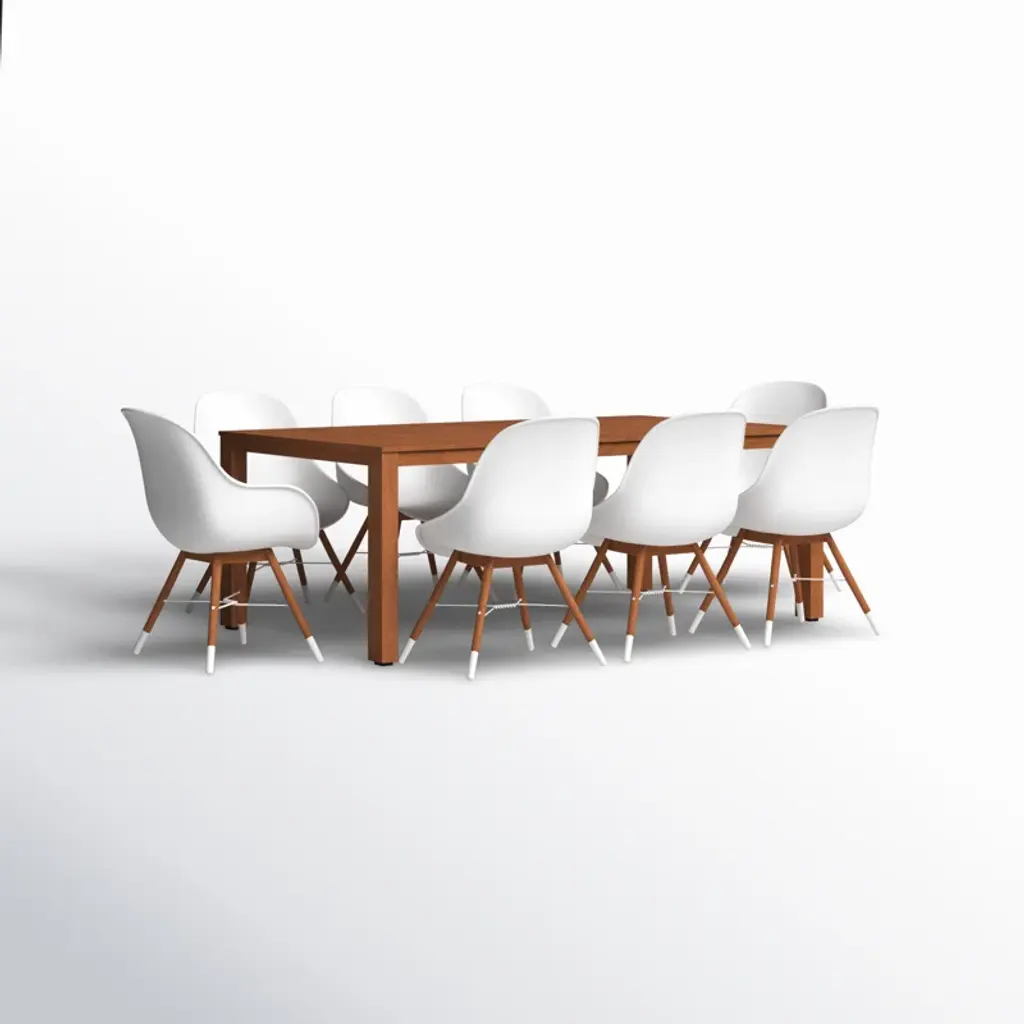 Gather 'round in style. This dining set includes a solid wood table with a rectangular teak top and six bucket armchairs. The chairs feature resin seats and backs, providing comfort and durability. Perfect for hosting outdoor meals with friends and family.