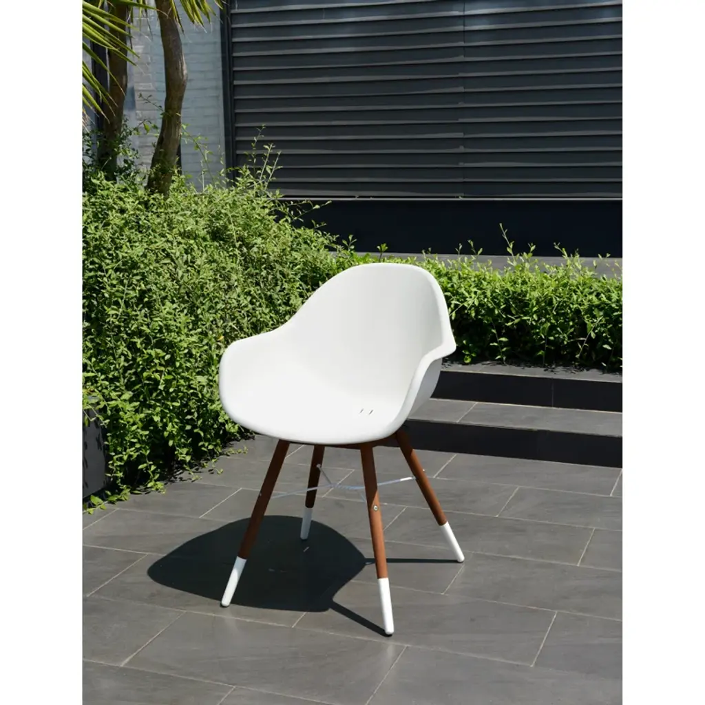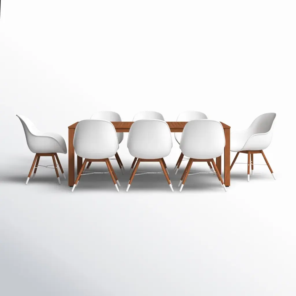 This 9-piece dining set juxtaposes a clean-lined table with chairs that draw on a mid-century icon for an eclectic twist on outdoor style. The table is made from solid eucalyptus wood, which is a naturally resilient hardwood that stands up to weather, water, and decay, we just recommend oiling it regularly. And since the table has an umbrella hole, you can easily add some shade. The chairs each have a bucket seat made from solid resin set on four splayed legs for an iconic mid-century look.