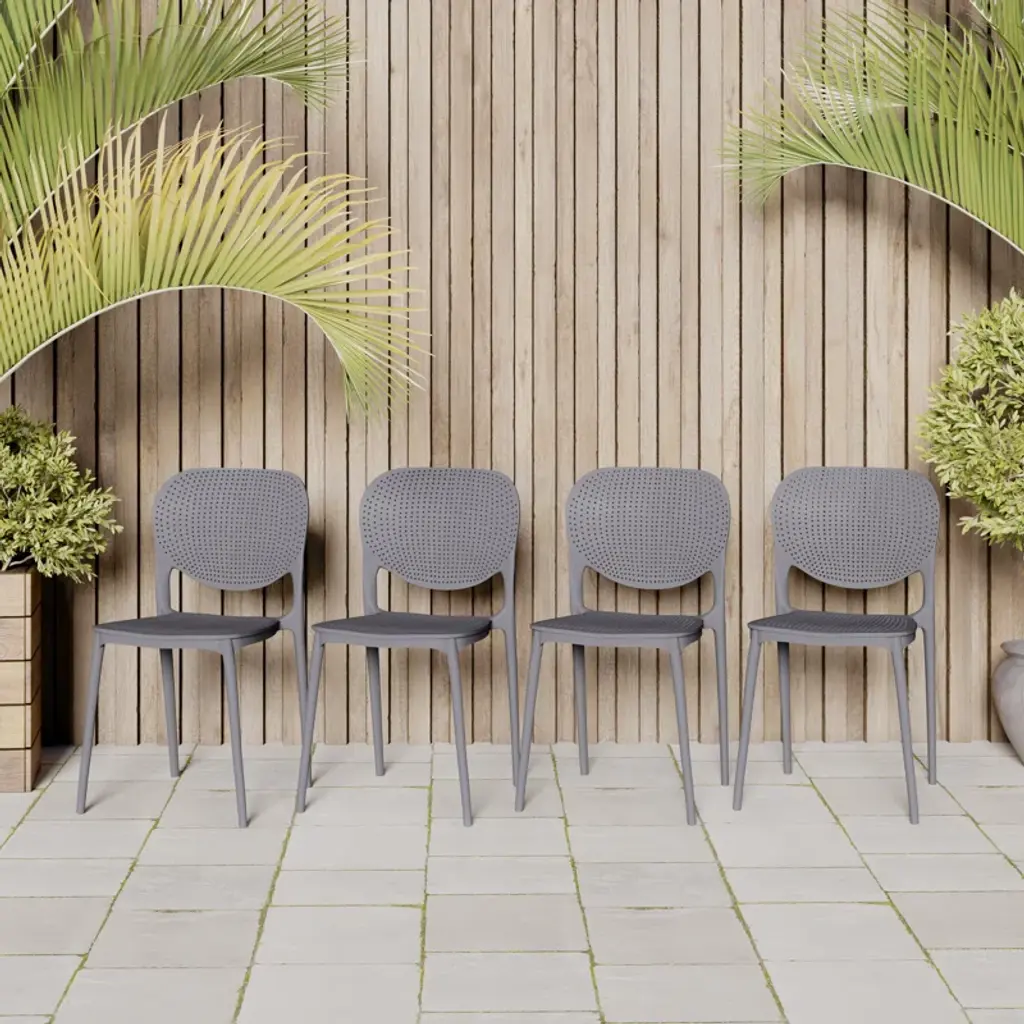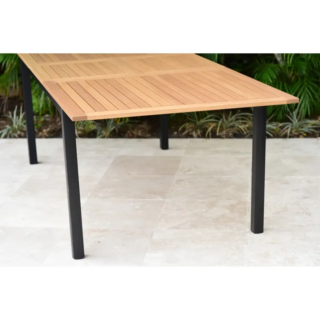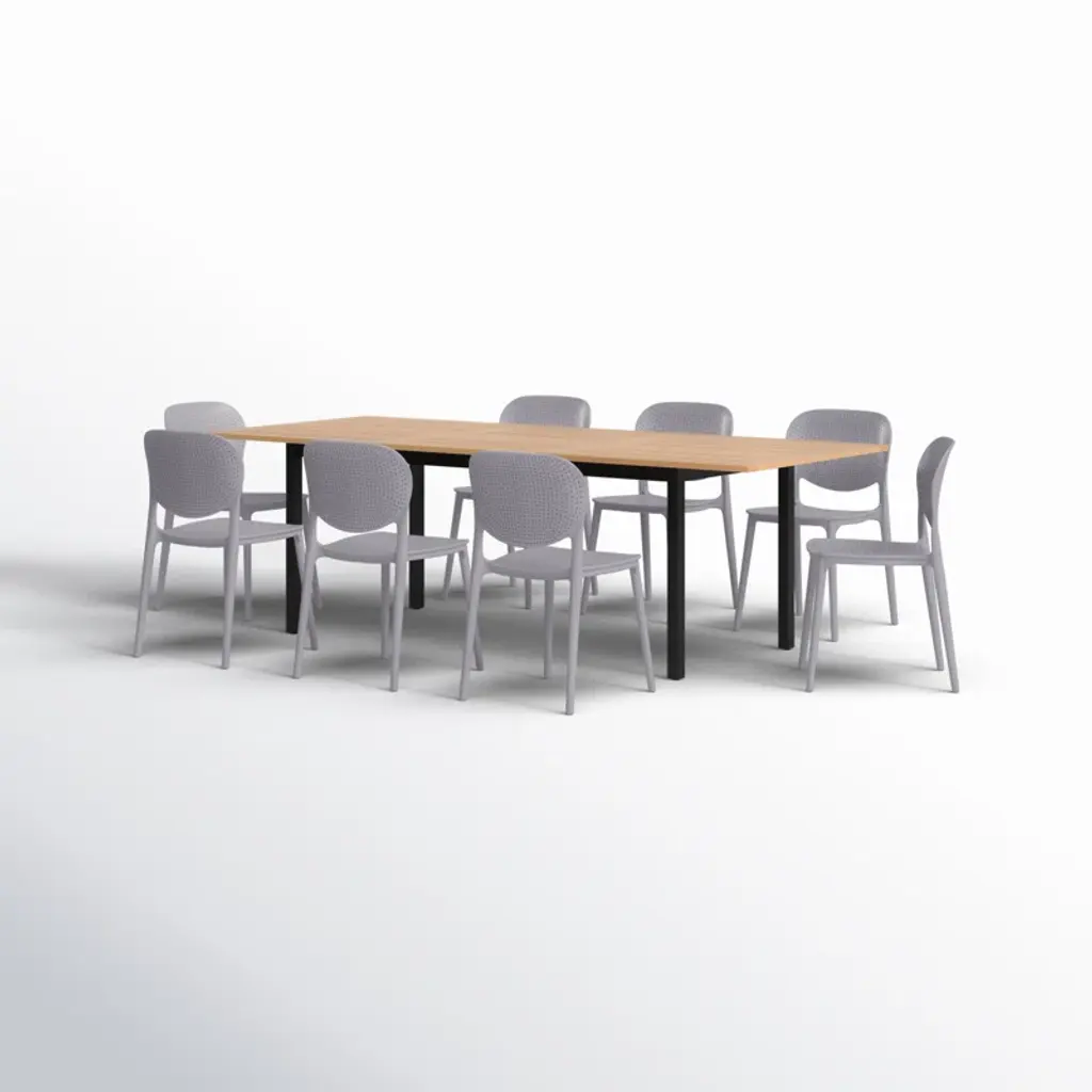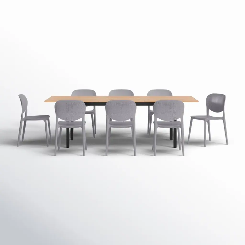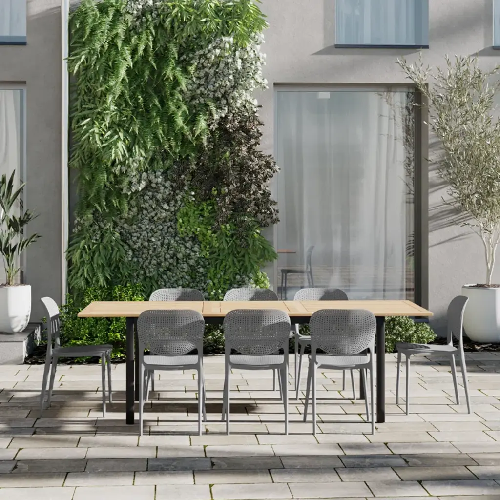 Dining out. This set brings a table for eight to your backyard – better start working on a secret bbq recipe. The resin chairs are perforated so they dry quickly, while the expandable table’s slatted top is built from solid eucalyptus wood. They’re designed to stand up to sun + storms, year-round.