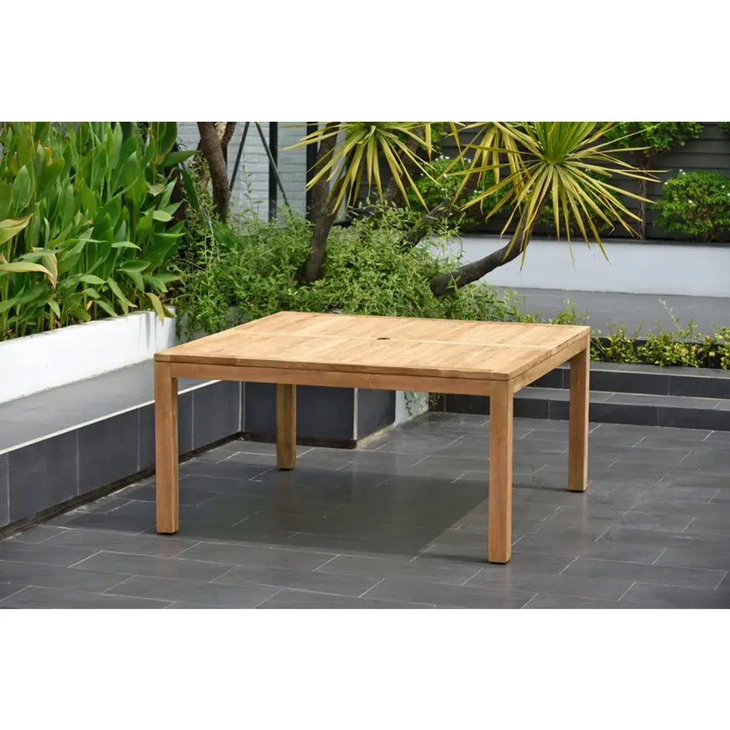 Finally host that dinner party – or just sit outside with a few friends and takeout with this 9-piece outdoor dining set. Made from solid teak wood, the 59" x 59" square table has four straight legs, a slatted top, and an umbrella hole so you can enjoy your deck on the brightest days. The eight stackable chairs are made from a weather-resistant plastic and features an armless full-back seat with a perforated design for an easy-to-clean and breathable spot. Some assembly required.