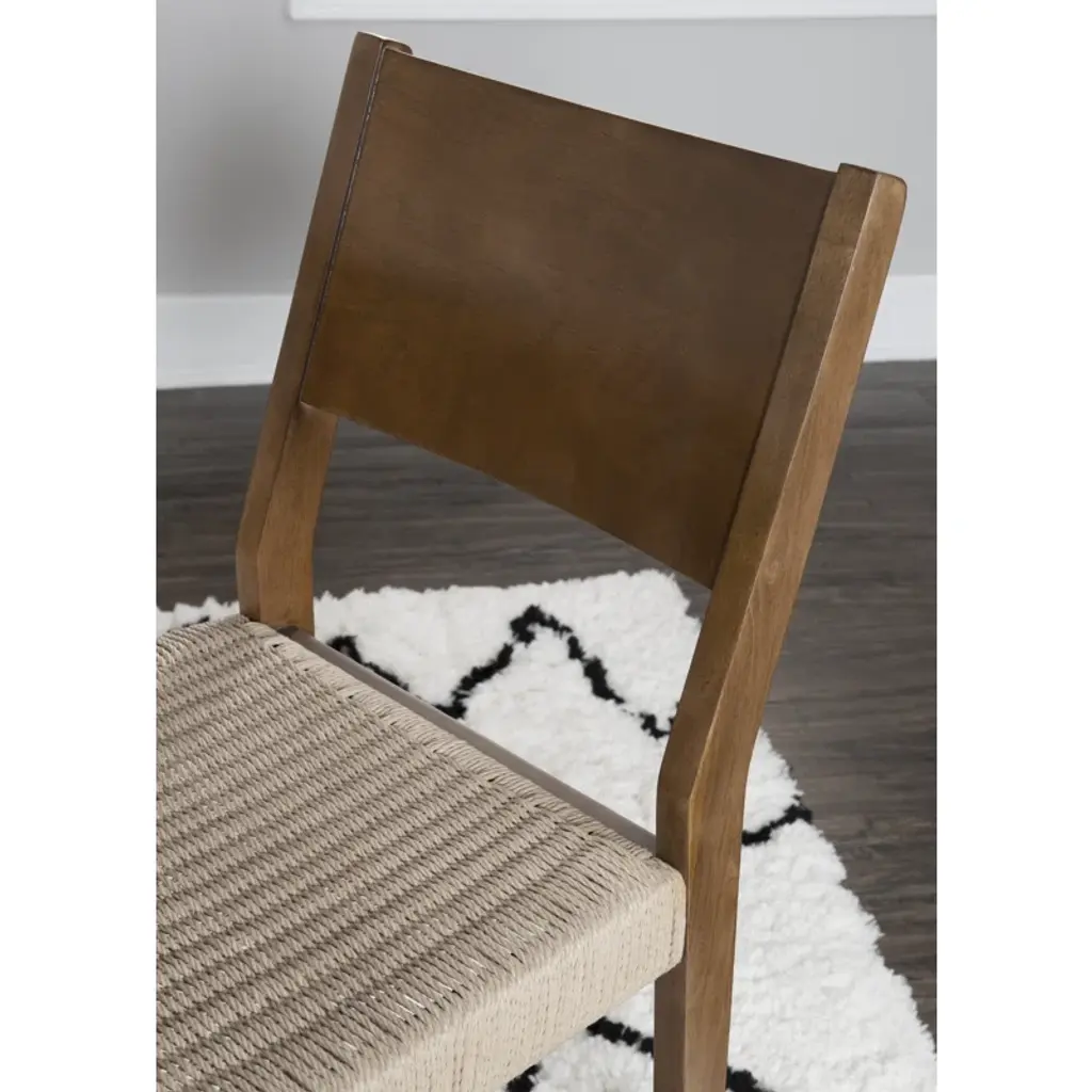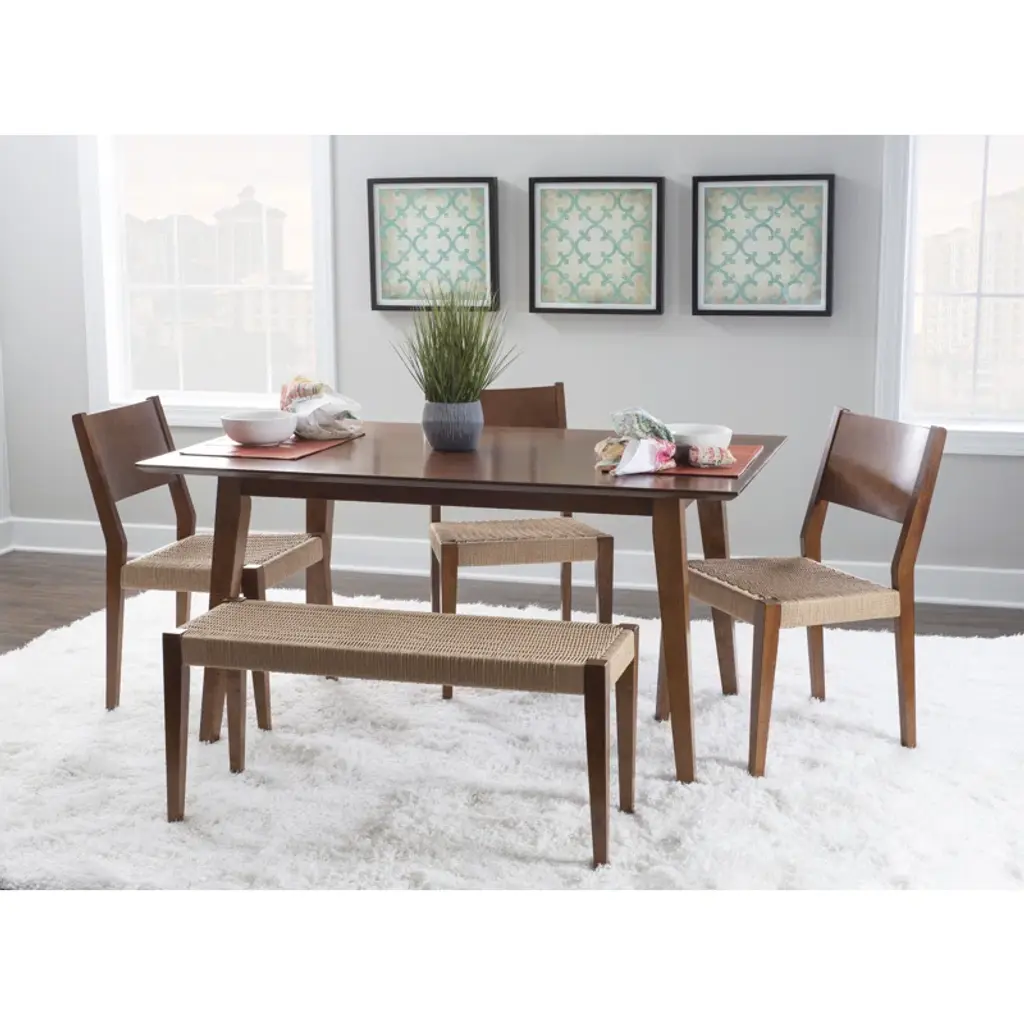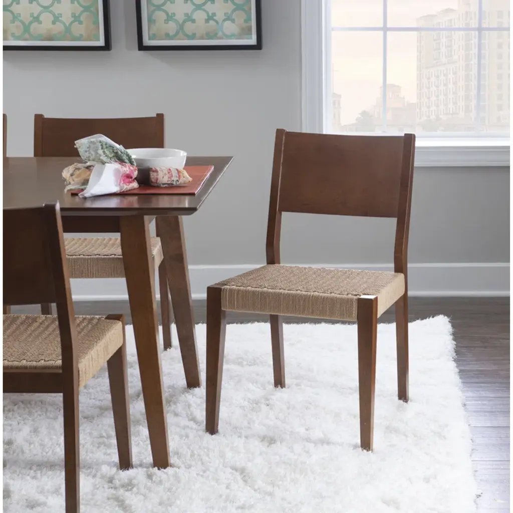 This elegant mid-century modern-style dining set is the perfect centerpiece for family gatherings and meals. The sleek silhouettes embody the grace and simplicity of the classic design movement, while handwoven rope seats help to evoke a more rustic and welcoming atmosphere. The set includes a table with a beautiful natural or brown finish that provides plenty of tablespaces, each with a comfortable basket weave pattern. All pieces are made of solid wood for long-term durability.