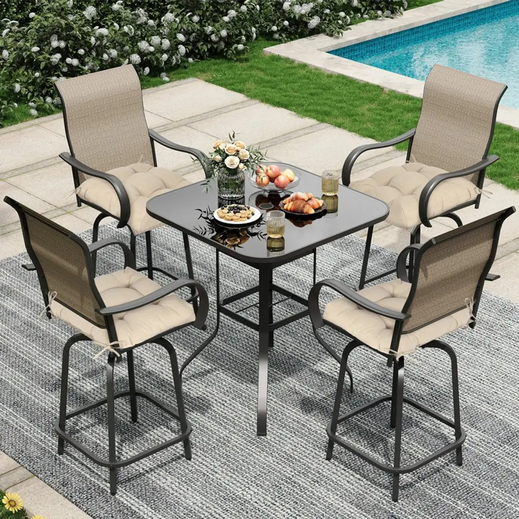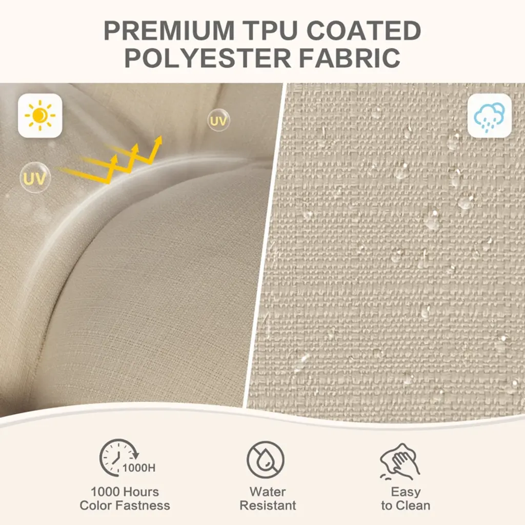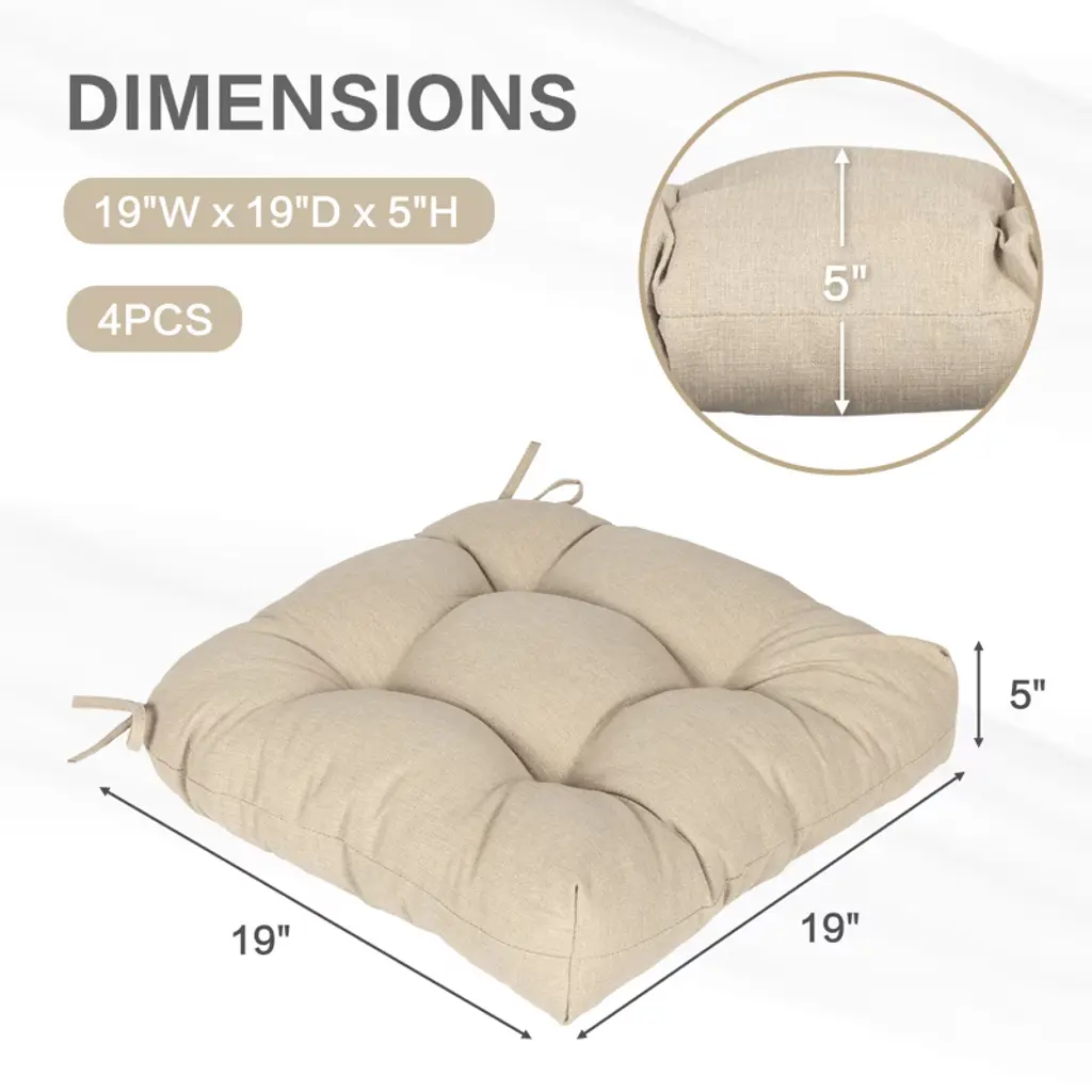 Aoodor 19" x 19" x 5" tufted outdoor chair cushions combine functionality and style for patios, balconies, or indoor spaces. The UV-resistant and fade-resistant polyester cover withstands over 1,000 hours of direct sunlight, while the water-resistant TPU lining ensures weather resistance and durability. Filled with PP cotton and crumb foam, these 5-inch-thick cushions are soft and supportive, offering ultimate comfort. Straps on two corners secure the cushions to chairs; the elegant tufted design prevents filling from shifting, ensuring even distribution. Available in five color options to complement various outdoor furniture styles, these cushions are ideal for both indoor and outdoor dining and lounge chairs.