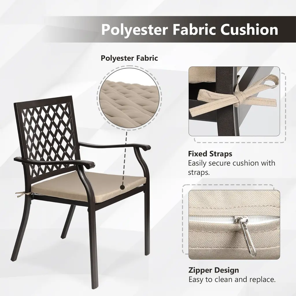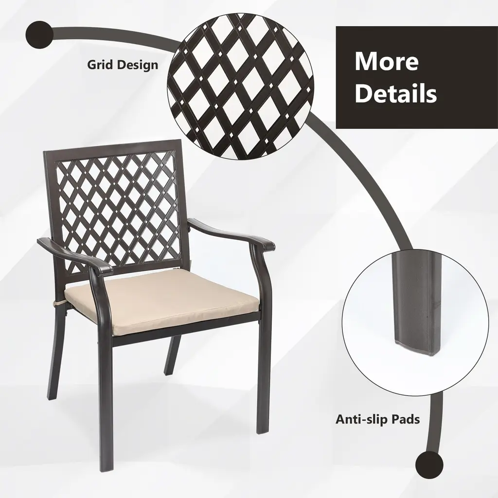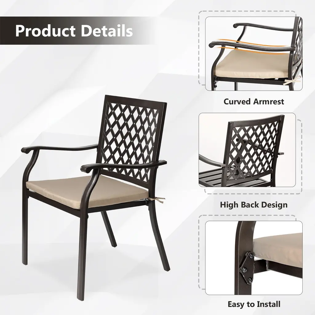 Durable material: Our outdoor patio dining chairs are constructed with high-strength metal iron and feature polyester cloth seat cushions, ensuring durability for the 2-piece set. Grid Design: Our outdoor patio dining chairs feature a diamond grid backrest design, enhancing their aesthetic appeal. Ergonomic Design: Our outdoor patio dining chairs are designed with ergonomics in mind, featuring curved armrests that conform to your body's natural shape, providing a comfortable place to rest your arms. The backrest is slightly inclined to improve sitting posture and aid relaxation while enjoying the outdoors. Perfect for every outdoor setting: Our outdoor patio dining simple yet versatile design ensures suitability for a wide range of outdoor activities, allowing you and your family to fully embrace the outdoors. Easy to Install: Our outdoor patio dining chair set includes easy-to-follow assembly instructions, enabling any adult to complete the installation with ease.