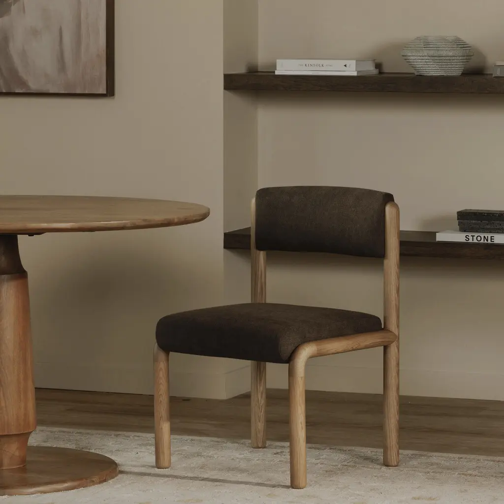 The April dining chair fuses playful proportions with material-driven design. Its minimal, modern aesthetic is highlighted by softly curved geometric legs and plush cushions, while soft fabric upholstery ensures enduring beauty.