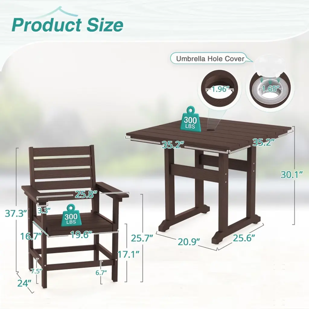 5-Piece Outdoor Dining Set: This set comprises 1 square patio table and 4 patio chairs. The height of the chairs is ergonomically matched with the table, enabling you to enjoy gatherings with friends on your patio, balcony, or backyard. All-Weather Durability: Constructed from HDPS material and 304 stainless steel screws, which are water-resistant, rainproof, and windproof, durability without fading, peeling or discoloration. Low Maintenance Requirements: Should dirt or grime accumulate, simply clean the patio dining table with warm water and a soft-bristle brush to restore its original shine. The design allows you to spend more time enjoying your outdoor space. Table and chairs Size: Dining table size: 35.2"L x 35.2"W x 30"H; patio chairs size: 26.4"L x 24"W x 37.3"H. To ensure comfort and accessibility, allow at least three feet of clearance around all sides of the dining table for guests to move freely and pull out their chairs. Easy to Assemble: The pre-drilled 1.96" umbrella hole is compatible with most umbrellas, allowing you to enjoy different views during the summer and rainy days. The patio table set is easy to assemble, and all the necessary hardware and easy-to-follow instructions are included in the package, also watch the assembled video.