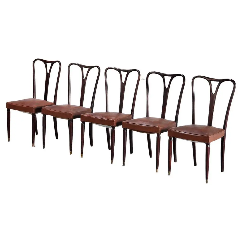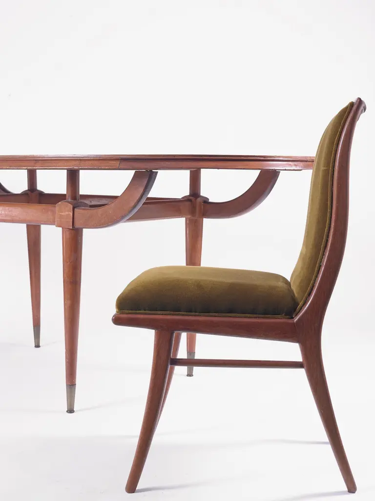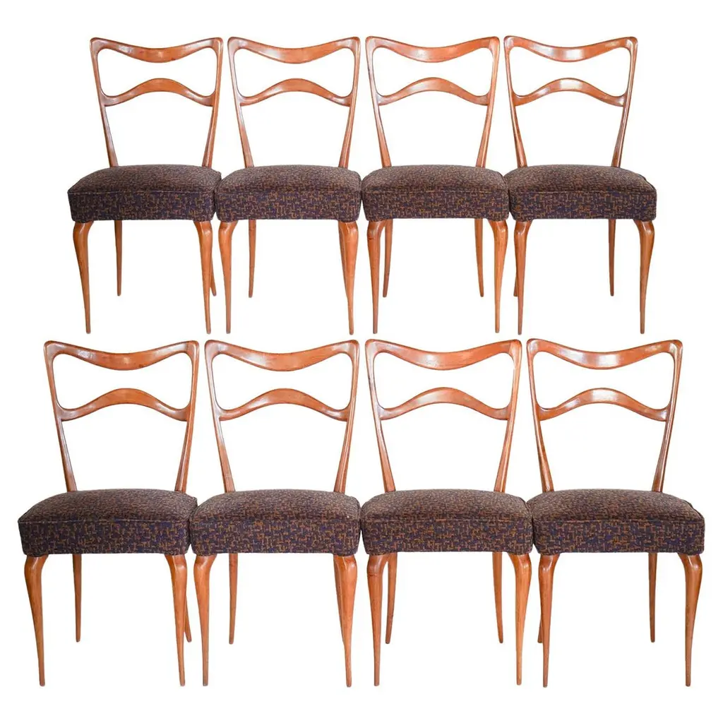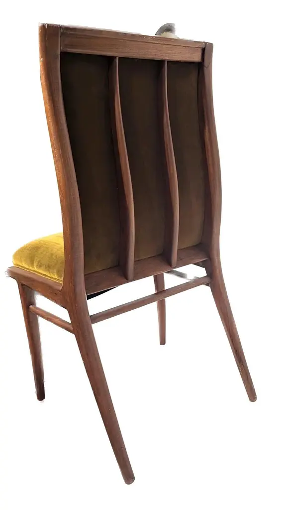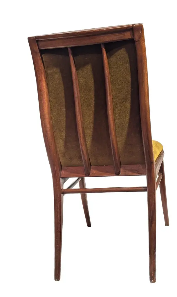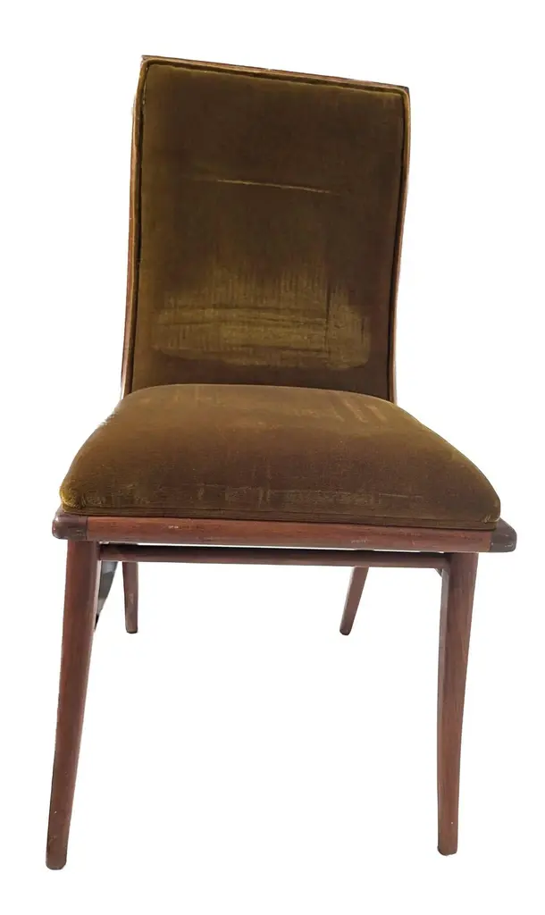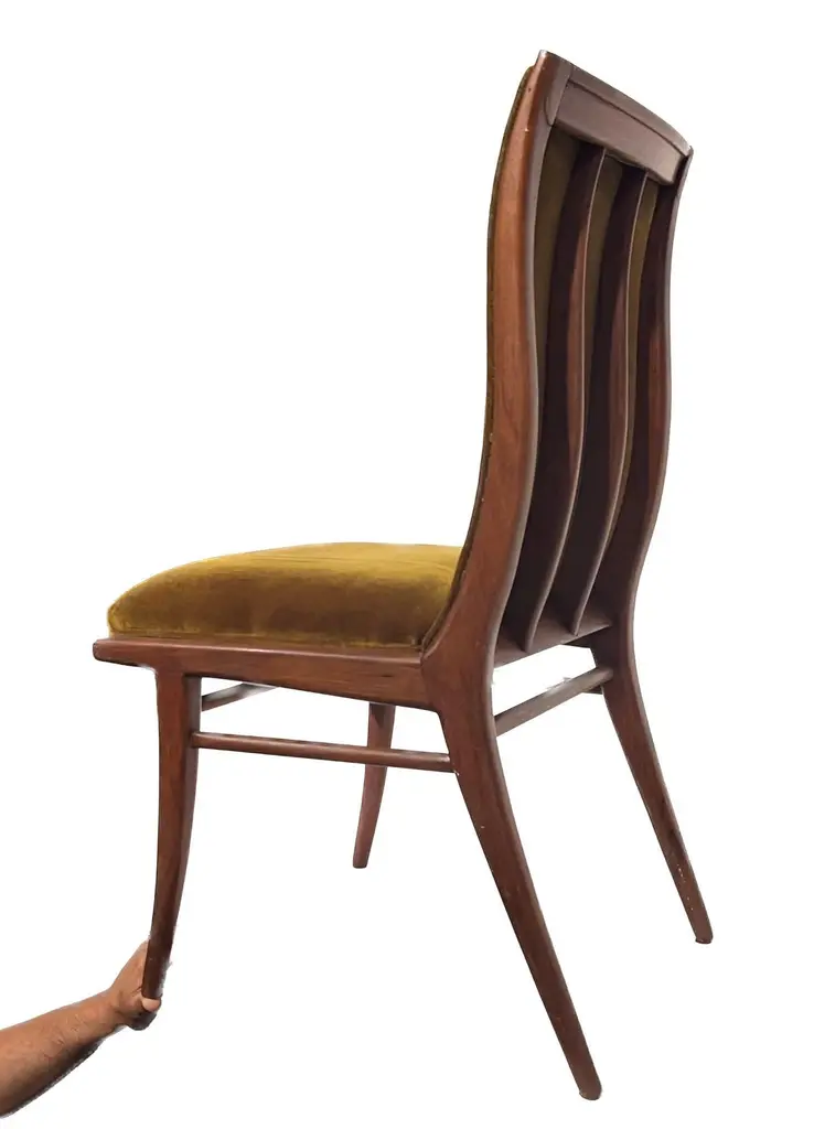 Offered are six (6) upholstered dining chairs that were imported from a private estate sale held in Buenos Aires, Argentina. They resemble the Walnut wood "Sabre" chairs originally designed by T.H. Robsjohn-Gibbings in the 1950s, however, they have evidently been reupholstered with a velvet fabric and we are unable to ascertain the exact measurements of the original chairs. These may be reproductions. The chairs each measure: 18" W, 21" D, 34" H, and have a seat height of 19".