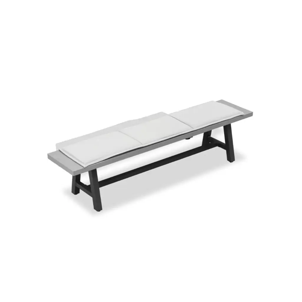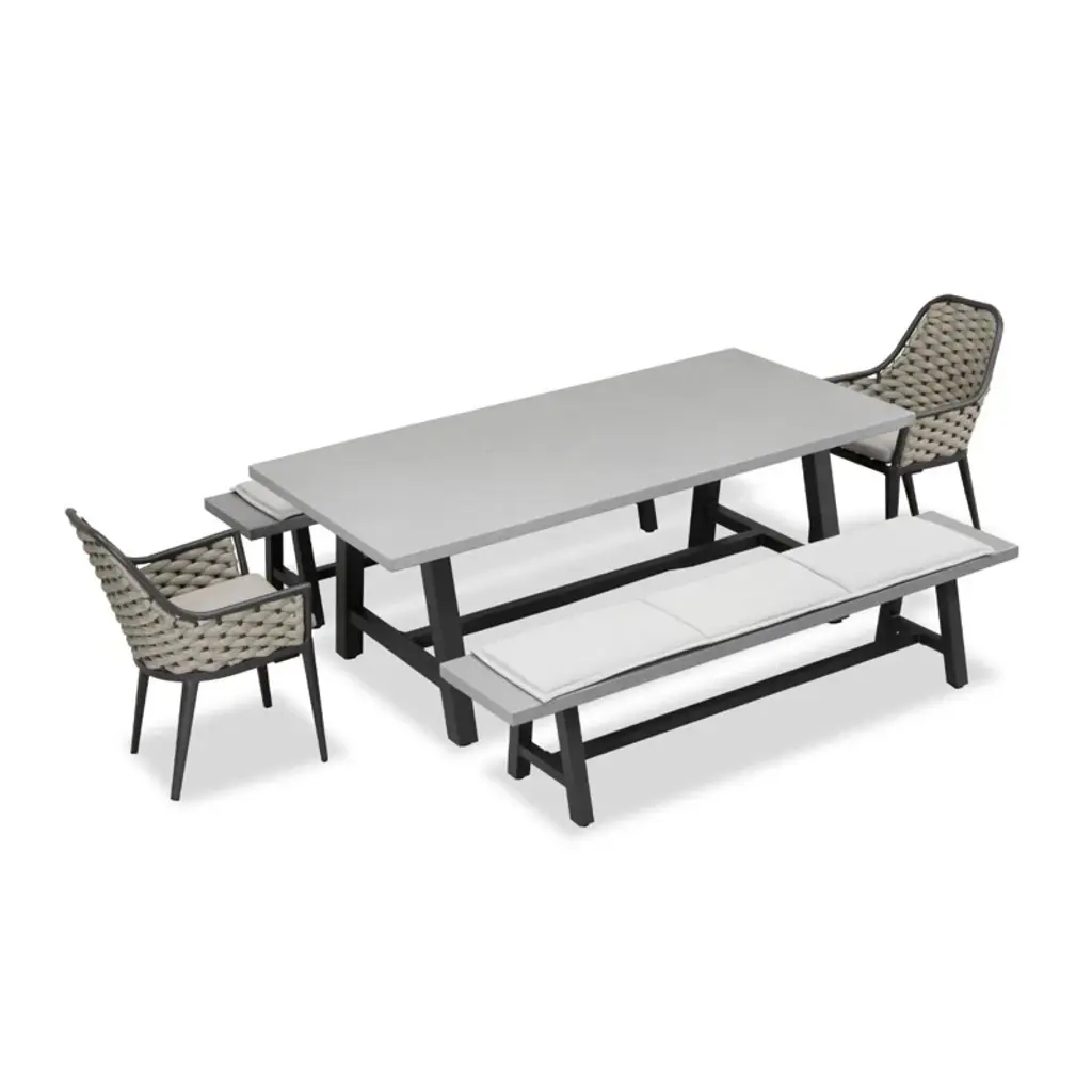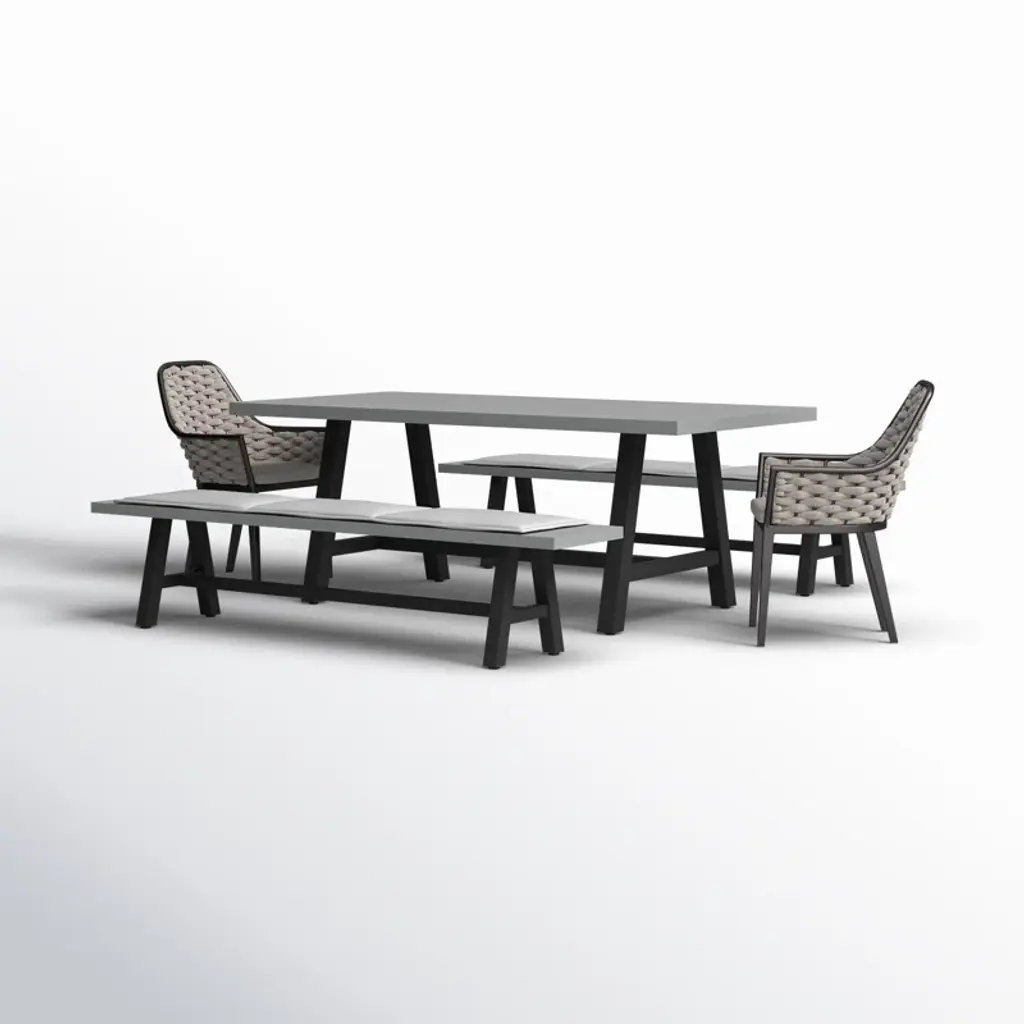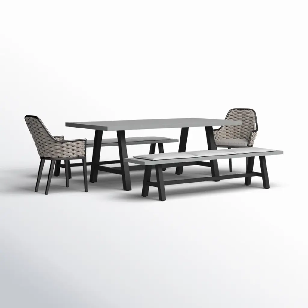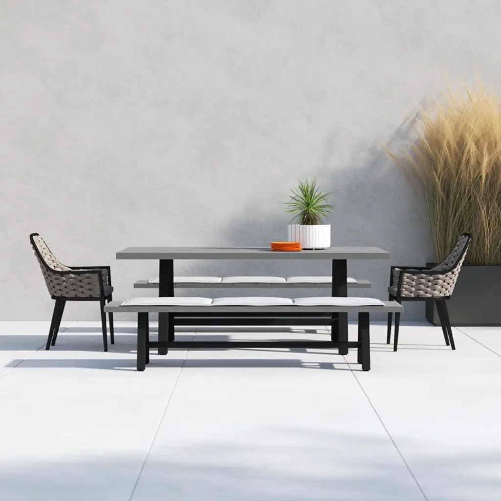 Industrial chic style is made maintenance-free with this bench dining set. The dining table is carefully crafted from a fully welded and powder-coated frame combined with a proprietary AI-Stone concrete table top. Al-Stone is made from rust-proof aluminum with heat and vacuum-applied laminate that is incredibly realistic and scratch-resistant. Two benches are matched with a pair of comfortable dining chairs, featuring all-weather gray olefin fabric in a sophisticated tailored design. Eclectic and accommodating, the bench dining set is the perfect way to make your guests feel at home, outdoors.