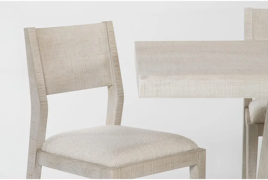 Transform your dining area with the Avila Distressed White Solid Pine Wood 84" Dining Table with Beige Fabric Dining Chair Set for 6. This rustic dining set features a sturdy solid rubberwood table and six comfortable armless chairs upholstered in 100% polyester. Perfect for both dining room and kitchen settings, this set provides ample seating and adds a touch of warmth and style to any space.