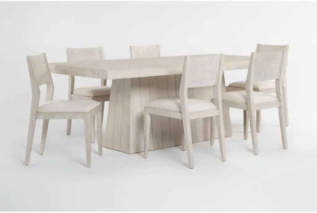 Avila Distressed White Solid Pine Wood 84"dining Table With Beige Fabric Dining Chair Set For 6